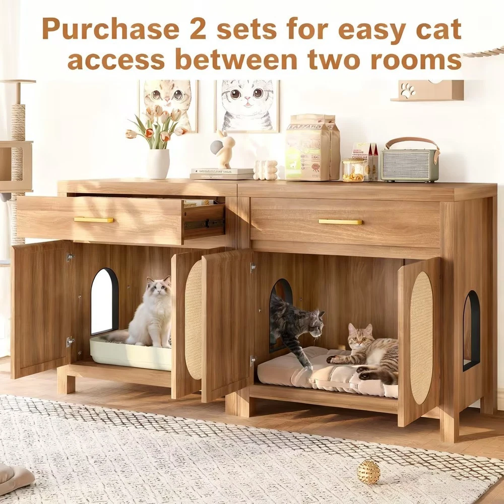 Product Feature Multi-Purpose Pet Furniture: This versatile cabinet serves as both a litter box enclosure and a cozy cat house. With its stylish design, it also functions beautifully as a side table or coffee table next to your sofa. Place decorative plants, books, or ornaments on the top to enhance the elegance of your living space. Spacious Storage: Features a spacious top drawer to neatly organize cat essentials like litter scoop, trash bags, toys, grooming tools, or treats—bringing a cleaner and more organized home environment. Premium Cat Scratch Pads: The cabinet doors are fitted with natural sisal scratch pads that keep your cat safe while allowing them to satisfy their scratching instincts, protecting your furniture from damage. Expandable Two-Room Design: Buy two units to create a connected cat suite! Side pass-through holes allow cats to freely move between two cabinets—use one for the litter box and the other as a cozy resting space. Sealing Strip: Sealing strip reinforces the structure, reduces gaps, and protects cats from scratches. Self-adhesive for adjustable placement. Fit Most Cats : With an internal usable size of 28.34"x18.97"x22.83"H, this furniture fits most cats and litter boxes, gives your cat the space to hide and poop at ease. The door can conceal the litter box inside, reducing odor while also allowing easy access for cleaning. Product Description Features Net Weight 64.32lbs Weight Capacity 176lbs Material MDF Assembly Time 1hour
