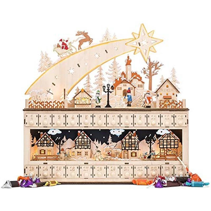 About this item CLASSIC CHRISTMAS THEME: Decorative advent calendar with an eye-catching shooting star complements any holiday setup, adding festive holiday cheer to your home UNIQUE, DURABLE DESIGN: High-quality wood has an intricate Christmas village with elves inside, holiday pine trees, and more all carved in, with battery-powered LEDs to keep the scene lit up INTRICATE DETAIL: Enjoy details like Santa riding in his sleigh and a holiday countdown that includes small drawers with engraved numbers to count the days until Christmas IDEAL FOR ANY ROOM: Put it on the kitchen countertop, in your bedroom or home office, or take it to work to decorate your desk for the season PERFECT SIZE: Compact size allows you to place it on nearly any surface; set it on tables, a mantle over the fireplace, and countless other locations; OVERALL DIMENSIONS: 17. 5"(L) x 4"(W) x 17"(H)