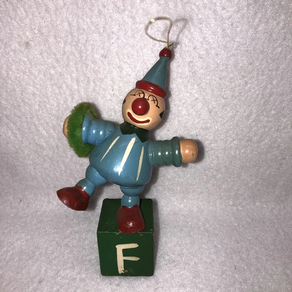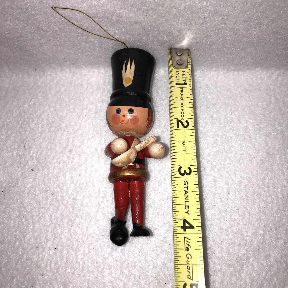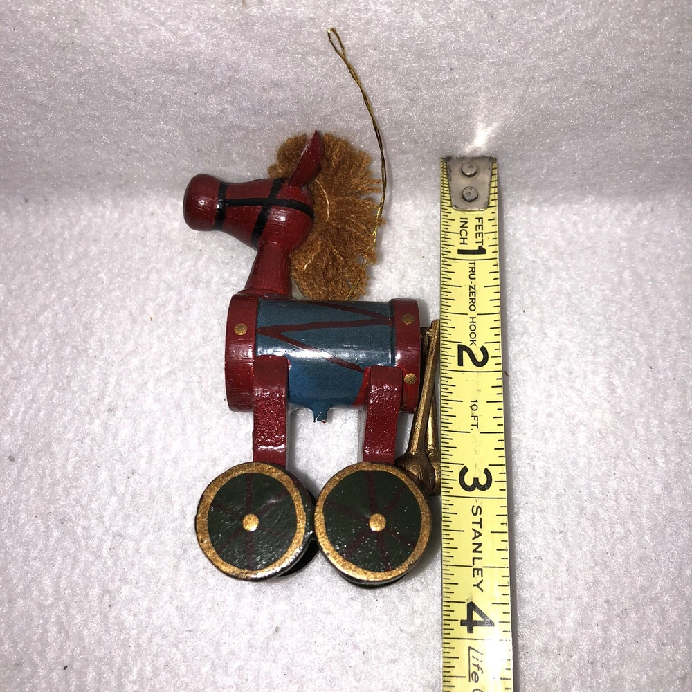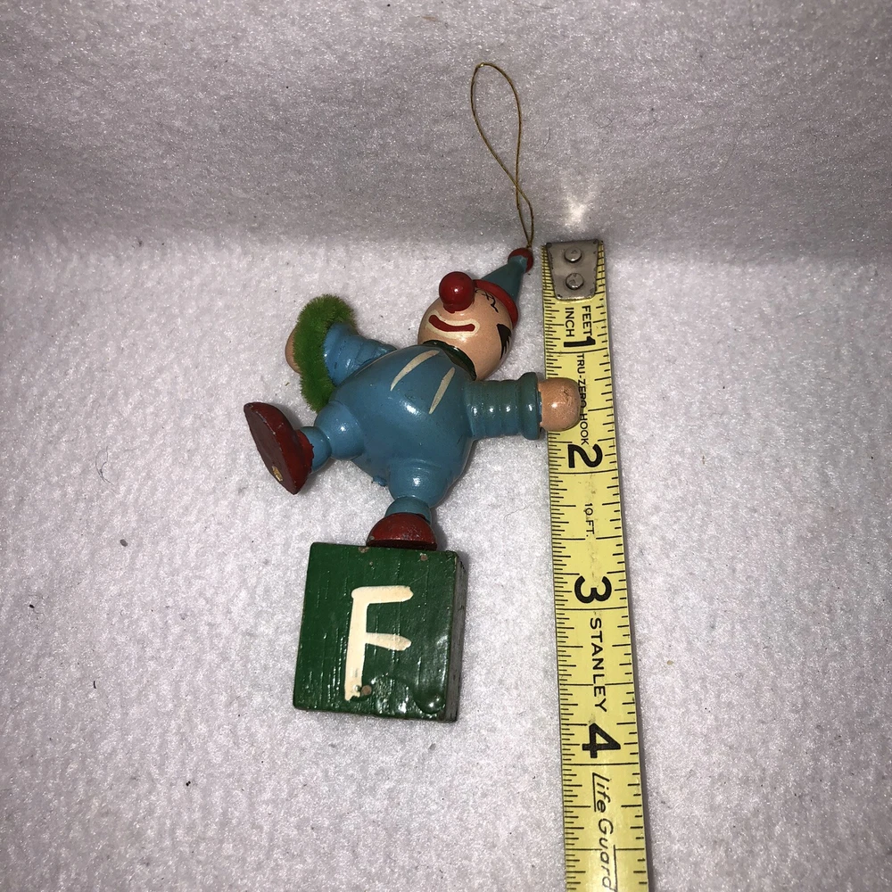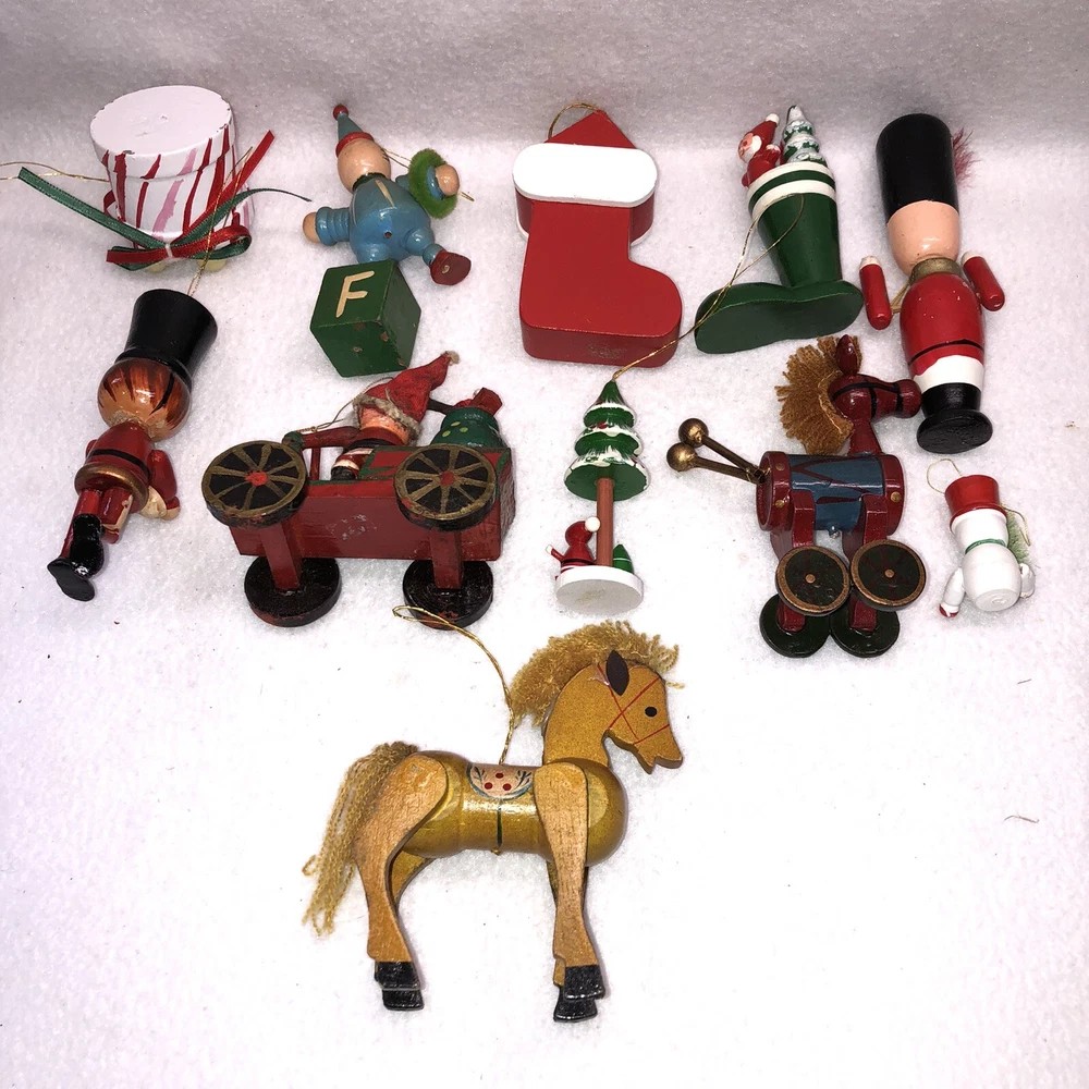 Mixed lot of 11 different Vintage Wooden Christmas Ornaments. There are 2 toy soldiers. The one holding the stringed instrument has a loose head and some paint loss at the base of his head. This is also the only ornament that does not stand on it's own. There is a clown balancing on an "F" block. There is a carmel colored hobby horse & a red & blue drum style horse with 2 mallets attached as a tail. There is a mini snowman holding a small brush tree & a white drum with pink & red stripes. There is an ornament that looks like a pine tree with a small Santa & egg shaped gift under it & a green stocking with an elf, present, tree & pipe cleaner style candy cane at the top. This is the only ornament that does NOT have a string attached for hanging. It does stand on it's own as a figurine or you can add a string to the candy cane. There is a red stocking that has a bear and gift in the top. It may be missing an attachment behind the gift. I am not sure. The last ornament is Santa driving an antique car. I believe it was intentionally made to have an antique appearance. They range in size from 1 1/2 in tall to about 4 3/4 in tall. Only the drum horse has a sticke. It simply says "MADE IN TAIWAN". Ornaments are in good vintage pre-owned condition. Do show sign of wear consistent with age & use. All have a small amount of paint loss. Please review and enlarge all photos for additional details, views & measurements. Shipped via USPS Ground Advantage.