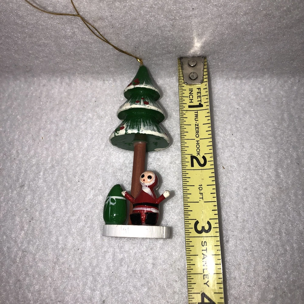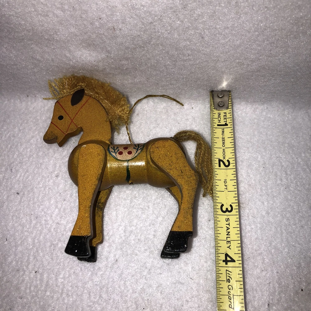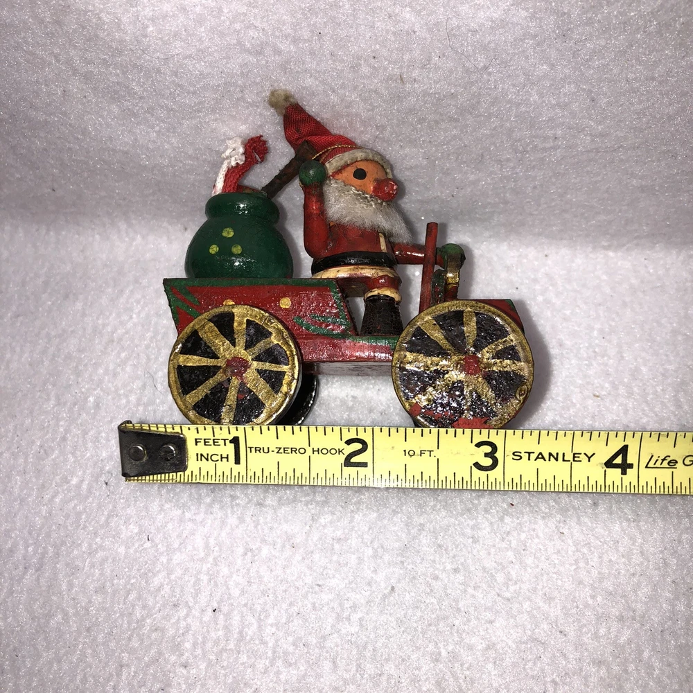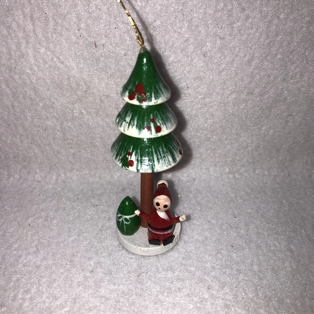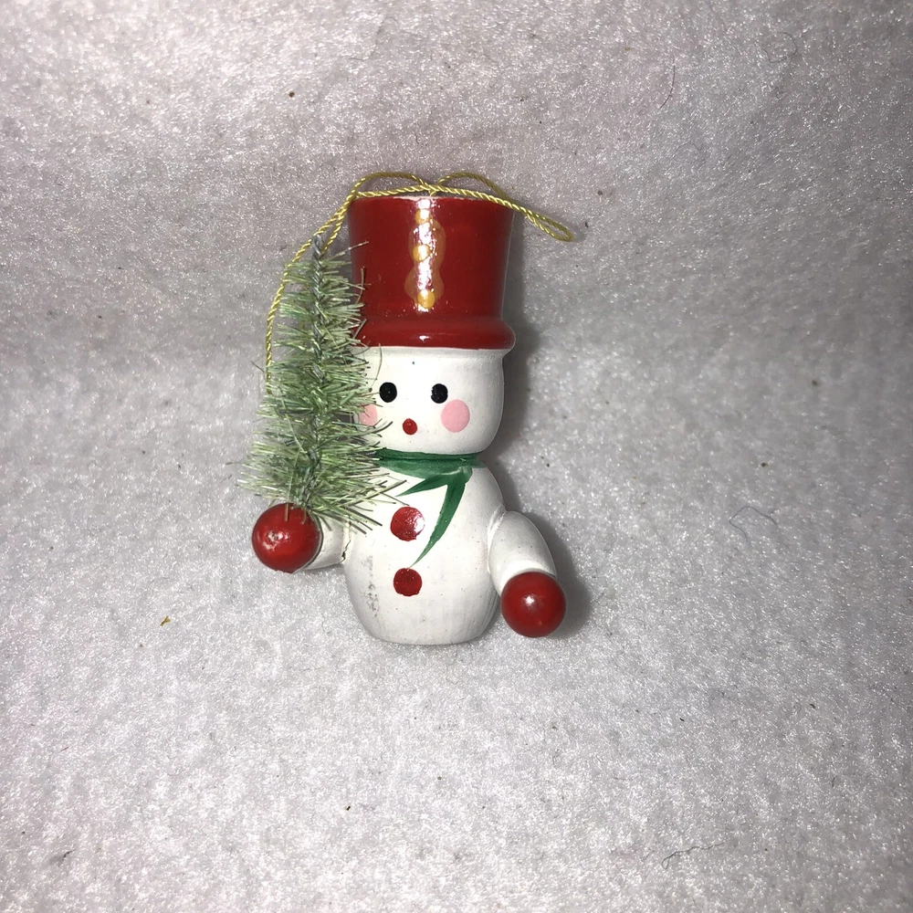 Mixed lot of 11 different Vintage Wooden Christmas Ornaments. There are 2 toy soldiers. The one holding the stringed instrument has a loose head and some paint loss at the base of his head. This is also the only ornament that does not stand on it's own. There is a clown balancing on an "F" block. There is a carmel colored hobby horse & a red & blue drum style horse with 2 mallets attached as a tail. There is a mini snowman holding a small brush tree & a white drum with pink & red stripes. There is an ornament that looks like a pine tree with a small Santa & egg shaped gift under it & a green stocking with an elf, present, tree & pipe cleaner style candy cane at the top. This is the only ornament that does NOT have a string attached for hanging. It does stand on it's own as a figurine or you can add a string to the candy cane. There is a red stocking that has a bear and gift in the top. It may be missing an attachment behind the gift. I am not sure. The last ornament is Santa driving an antique car. I believe it was intentionally made to have an antique appearance. They range in size from 1 1/2 in tall to about 4 3/4 in tall. Only the drum horse has a sticke. It simply says "MADE IN TAIWAN". Ornaments are in good vintage pre-owned condition. Do show sign of wear consistent with age & use. All have a small amount of paint loss. Please review and enlarge all photos for additional details, views & measurements. Shipped via USPS Ground Advantage.