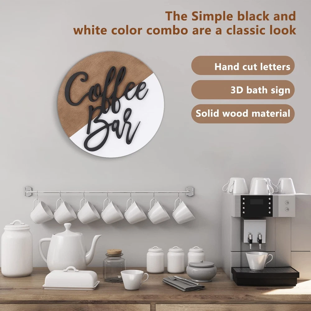 Wooden Coffee Bar Sign Round-Modern Farmhouse Coffee Bar Decor 3D Coffee Cutout Sign Hanging Wall Decor Tiered Tray Decor Coffee Lover Gift for Home Restaurants Outdoor Indoor Decoration (Rustic) Product Details Style: Rustic Brand: Telihel MPN: TH-0531 UPC: Does not apply EAN: Does not apply Color: White Brand: Telihel Material: Wood Theme: Words & Quotes Recommended Uses For Product: Office Mounting Type: Wall Mount Product Dimensions: 10.6"L x 10.6"W Shape: Round Item Weight: 0.43 Kilograms Style: Rustic Pre-printed: Coffee Bar Item Thickness: 0.2 Inches Item Weight: 15.2 ounces Manufacturer: Telihel Country of Origin: China Item model number: TH-0531 [RUSTIC MODERN DESIGN HANDCRAFTED COFFEE BAR SIGN]: The round coffee sign is featuring 3D word cutouts and shiplap design,elegant font and gorgeous design. Blend seamlessly with any modern, farmhouse, country, shabby chic or vintage style. PERFECT SIZE FOR HOME & RESTRAUNT DECOR: The coffee bar sign measures 11.6'' in dia,the 3D lettering and letters thickness: 0.2'' , makes a visual impact on the wall or on a shelf,perfect for that coffee theme tiered tray decor. RELIABLE & DURABLE: The farmhouse coffee decor is made of durable wood material, not easy to fade or break, which provides you with a long-term service; The surface of the wooden sign is smooth, won't scratch your hands and easy to clean. WIDELY APPLICABLE: the coffee hanging wall sign is a lovely housewarming gift for your friends or family members, or a nice gift choice for Christmas, Thanksgiving, wedding, outdoor or indoor parties, baby shower, birthday parties, New Year and other occasions. 100% SATISFACTION GURANTEE- We're sure you'll love your sign. Each piece comes with a lifetime guarantee so you can enjoy your product for years to come! If for any reason you are not happy with your purchase, just let us know and we will try our best to fix it.