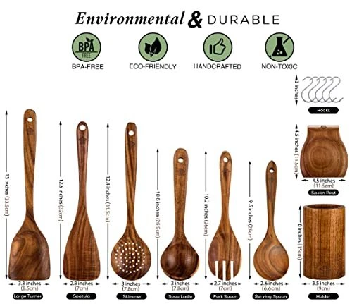 Wooden Cooking Utensils, Kitchen Utensils Set with Holder & Spoon Rest, Teak