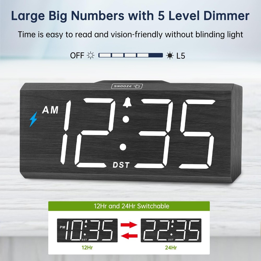 10W Fast Wireless Charger: this wireless charing alarm clock support fast charging and charges universal cellphones with wireless charging which is really handy and space saving while keeps your bedside nightstand neat and clean. 10W Fast Wireless Charger: this wireless charing alarm clock support fast charging and charges universal cellphones with wireless charging in high efficiency way without overheating, which is really handy and space saving while keeps your bedside nightstand neat and clean. Wood Alarm Clock with Large Numbers: the 1.8 inches big digits on the 6.5 inches electric clock are easy to see without glasses. Two steps setting makes the wood clock very easy to setup, no reset hassle for daylight saving time with manual DST. 5 Level Adjustable Bightness with OFF Display: the dimmable alarm clock has 5 level brightness dimmer with OFF mode so you can dim display brightness per your need, no glaring light for bedside use. Extra USB Charging Port: the wireless charger clock also comes with an extra USB ports to charge other electronic devices which is a great handy addtion for bedroom, livign room, office 5 Level Volume Control with Battery Backup Alarm: the alarm volume is adjustable to hig or low level so it can serve as a loud alarm clock for heavy sleepers adults and won't blast you awake. Backup battery function will trigger the alarm during power cut, no worry about oversleep. Alarm lasts for 2 minutes and just tap the snooze button on the top for extra 9 mins sleep. Plug In Alarm Clock: the electric desk clock runs on electricity and is powered by AC adapter. Batteries (not included) just store the clock setting and trigger the alarm during power outage but won't light up the clock display. 5V/2.1A power adapter is supplied. Decent and Stylish Gifts: consider its futuristic modern look and the easy to program function with the fast wireless docking station, this wooden digital clock is perfect for room décor and an elegant small gifts for Christmas, birthday, back to school and New Year.
