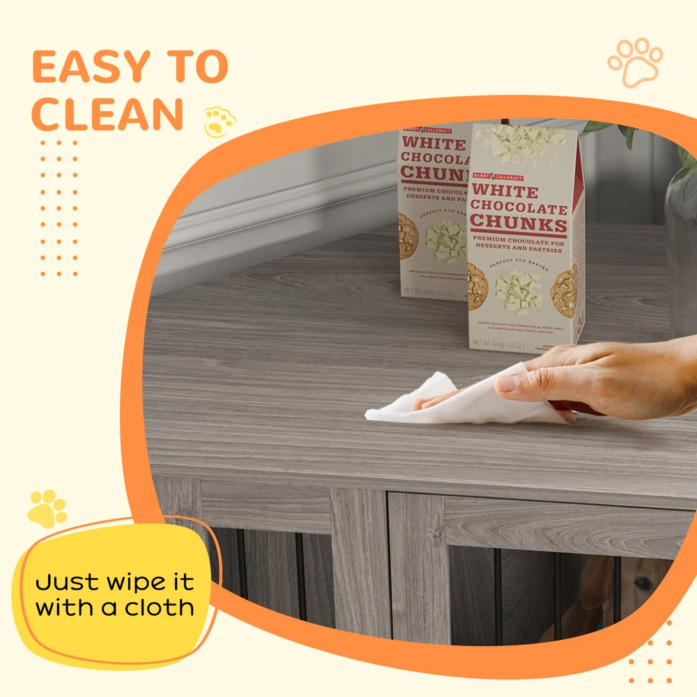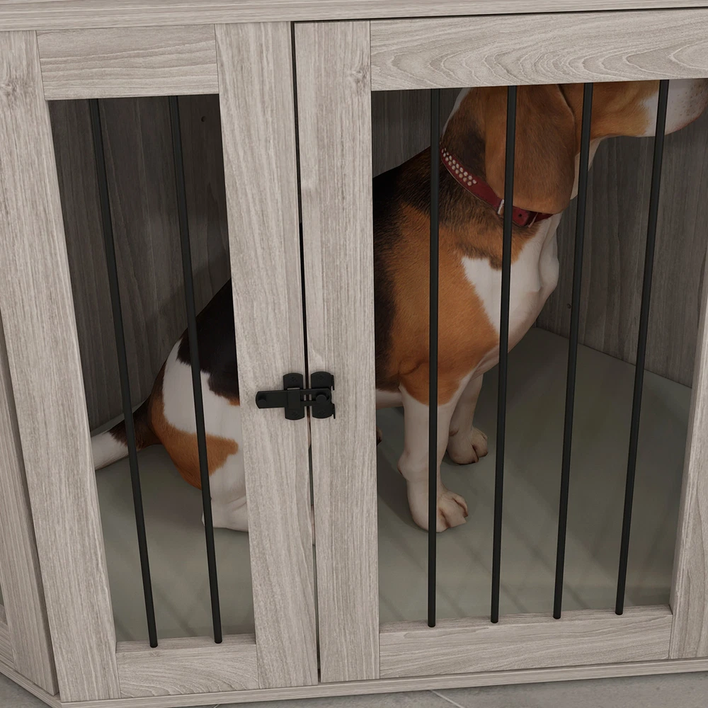 - Multifunctional Use: This dog kennel table meets your needs and your dog's needs. With a comfortable cushion, it provides a rest haven for your dog while also functioning as an extra corner table.- Large Door: A large door makes it easy for your fur baby to enter and exit. This dog crate table is well-ventilated with air from three sides, so your dog will not find the air inside stuffy or dry.- Strong & Safe: The steel bars are strong, firm, and stable to damage. To improve safety, the latch is solid. Our furniture style dog crate keeps curious or destructive pups off your furnishings while you're gone and shields your puppies from potentially hazardous situations when you can't watch over them.- Stylish Decor: Featuring a door and a wood grain look, our furniture style dog crate can blend beautifully with your home decor. Also, with it corner design, it can help you utilize every inch of space in your home, even a small room won't take much space.- Pet Crate Furniture Info: Overall Dimensions: 47.75" L x 24" W x 27.75" H. Bar Spacing: 1.5". Suitable for large-sized dogs up to 66 lbs. and body length no more than 23.5". Maximum Weight Capacity: 110 lbs. (Inner), 44 lbs. (Top). Assembly required. 47 In Corner Dog Crate Indoor Pet Kennel Wooden Cage Furniture for Large Dog Decorate your home with a design that has a modern shape and a wood grain look. The corner design makes it easier to place our dog crate table for large-sized dogs against a wall or sofa. The large door makes it easy for dogs to get in and out, and its soft cushions are easy to clean. When you make this convenient UIRIO dog crate furniture part of your home, you'll have the integrity needed to endure daily wear and tear. Give your pet a place all their own; give your dog a UIRIO. Features: Multi-use, it can be a dog cage or side table Large tabletop offers a convenient place to set down a range of items Large entrance makes it easy to enter and exit A stylish look Removable cushion for cozy and easy cleaning Made from stable particleboard and steel to endure daily use Suitable for large-sized dogs up to 66 lbs. and body length no more than 23.5" Assembly required Specification: Color: Walnut Brown, Cream White Materials: Particleboard, Steel, 100% Polyester, Spray Cotton Overall Dimensions: 47.75" L x 24" W x 27.75" H Inner Space: 45" L x 22.5" W x 26.75" H Door: 16.5" L x 26.5" W Cushion: 35" L x 22.5" W x 1.75" T Bar Spacing: 1.5" W Maximum Weight Capacity: 110 lbs. (Inner), 44 lbs. (Top) Item Label: D02-167V00WN Package Includes: 1 x Dog Cage 1 x Manual Delivery Returns Warranty About Us Preventing Fraud: Internet Scams Delivery Most of our products are shipped from our main warehouse in Oregon. Other warehouses in California, Georgia, Illinois, New Jersey, Tennessee, Mississippi, and Arkansas ship some products depending on buyer location. You can expect your item to arrive in 2-7 business days . Rural areas may take 4 to 10 business days. Weekends are not included. Due to courier restrictions, shipping is only available within the 48 contiguous states. The following are excluded: Hawaii, Alaska, Puerto Rico, Guam, FPO, APO, and PO Boxes. Returns We accept returns. Contact our customer service team right away if you: You have changed your mind and wish to return The product was damaged in transit You are not satisfied with the product you purchased. Returns must be directed through Customer Service. Do not return or post items before obtaining instructions from us. Your returned item may not be identified and accepted if you do so. If you return a product based on a change of mind, freight fees will be deducted from your refund. This also applies to orders canceled while in transit. We cannot accept change-of-mind returns for mattress orders once they have been taken out of the vacuum-sealed packaging Warranty This product is backed by a one-year warranty. As a valued customer, we wish to make your purchase experience as pleasant as possible. If something goes wrong with your product, please do not hesitate to contact us for assistance. About Us Our mission is to offer our customers cheap bargains and convenient shopping by being one of the fastest-growing online department stores in the United States. Our specialties include Outdoor Living, Home Decor, Sporting Goods, and Health & Beauty. Preventing Fraud: Internet Scams This product is backed by a one-year warranty. As a valued customer, we wish to make your purchase experience as pleasant as possible. If something goes wrong with your product, please do not hesitate to contact us for assistance. It is one of our highest priorities to ensure the security and confidentiality of our customers' personal information. We do not send unsolicited text messages or emails requesting money, packages, or personal information. It is recommended that suspicious messages be deleted without being opened. A fake SMS message may inform you that your parcel is 'detained', 'you missed a delivery', or there is an 'important update' regarding your delivery, along with a link to click on for further information. Due to the technology used by scammers to imitate a caller ID, these scam texts can appear in the same conversation thread as a legitimate courier conversation. You are usually taken to a fake courier's website by clicking on the links in a scam message. It is also possible to infect your device with malicious software by clicking on these links On May 16, 2025 at 13:33:14 PDT, seller added the following information: On Jun 21, 2025 at 09:33:08 PDT, seller added the following information: On Jul 4, 2025 at 16:56:44 PDT, seller added the following information: