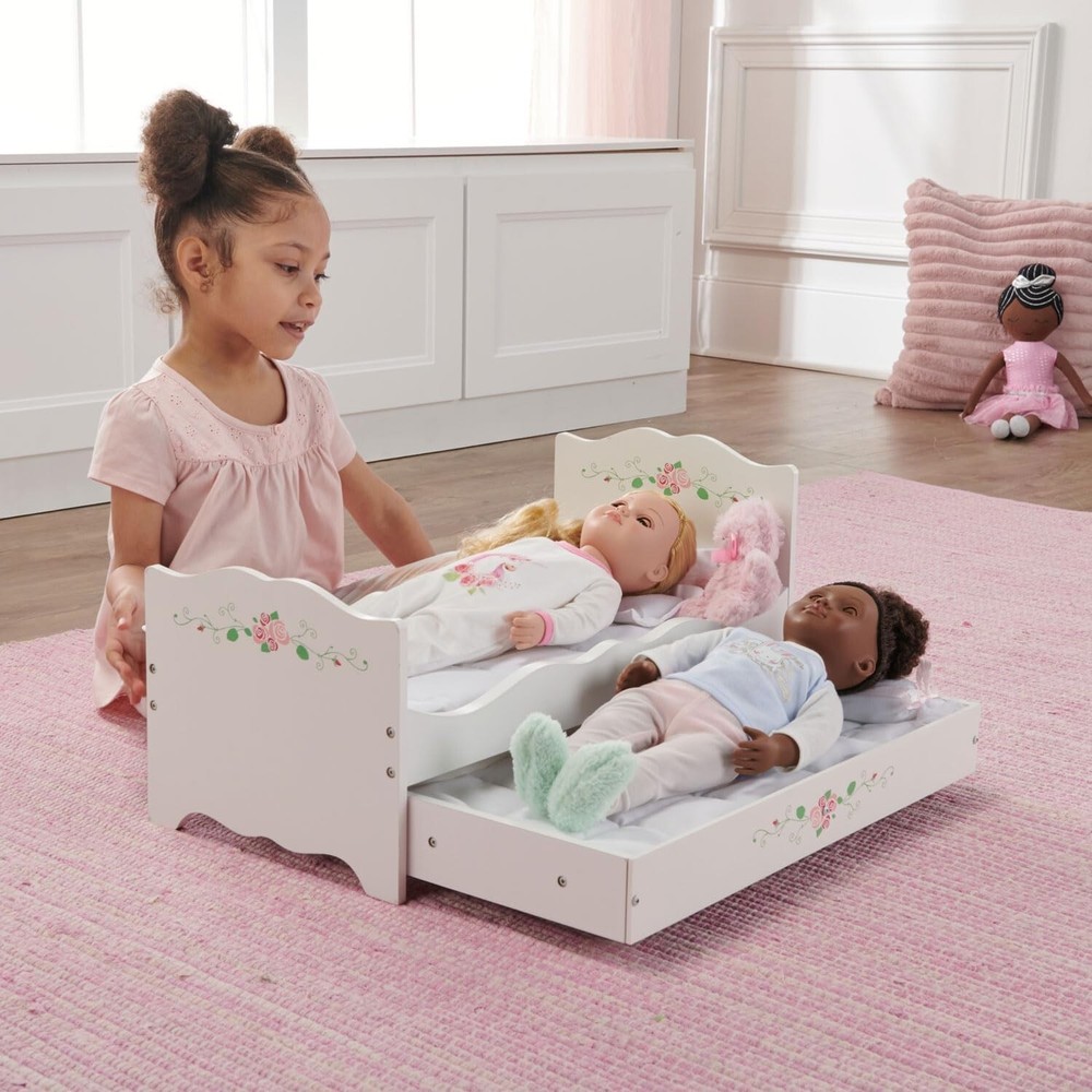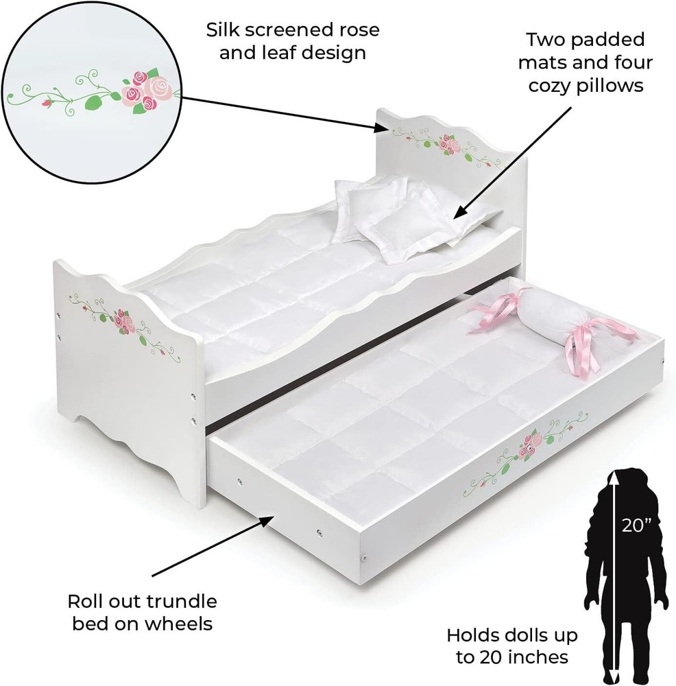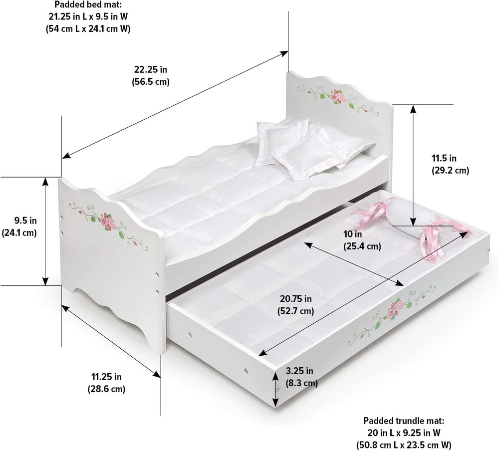 This elegant trundle bed is sleepover-ready for your doll and her closest doll friend Includes two deluxe padded mats and four pillows Fancy scalloped panels and pretty floral detailing For all dolls up to 20 inches, which includes popular 14.5, 15, and 18 inch character dolls Overall dimensions: 22.25 inches L x 11.25 inches W x 11.5 inches H