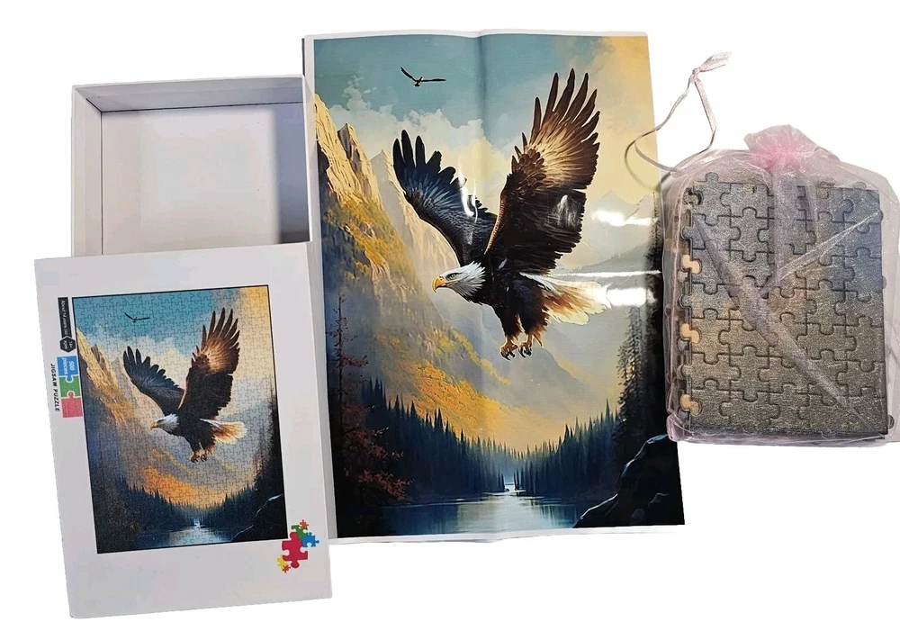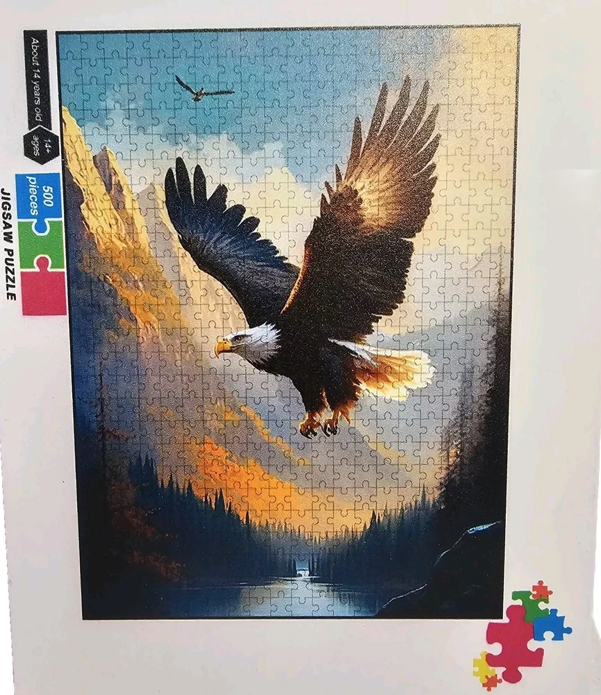 The "Wooden Eagle Puzzle" features 500 multi-color pieces with an eagle theme, creating a vibrant and challenging jigsaw puzzle. Made of wood with interlocking pieces, this puzzle is suitable for ages 14 and up, making it ideal for older teenagers and adults. The back of each piece is marked with letters to assist in assembly, adding an extra level of complexity to the puzzle-solving experience. This puzzle is perfect for fans of eagles and intricate jigsaw puzzles looking for a rewarding and engaging activity. Includes an 8x11" poster of completed puzzle Approx finished dimensions: 21x15"