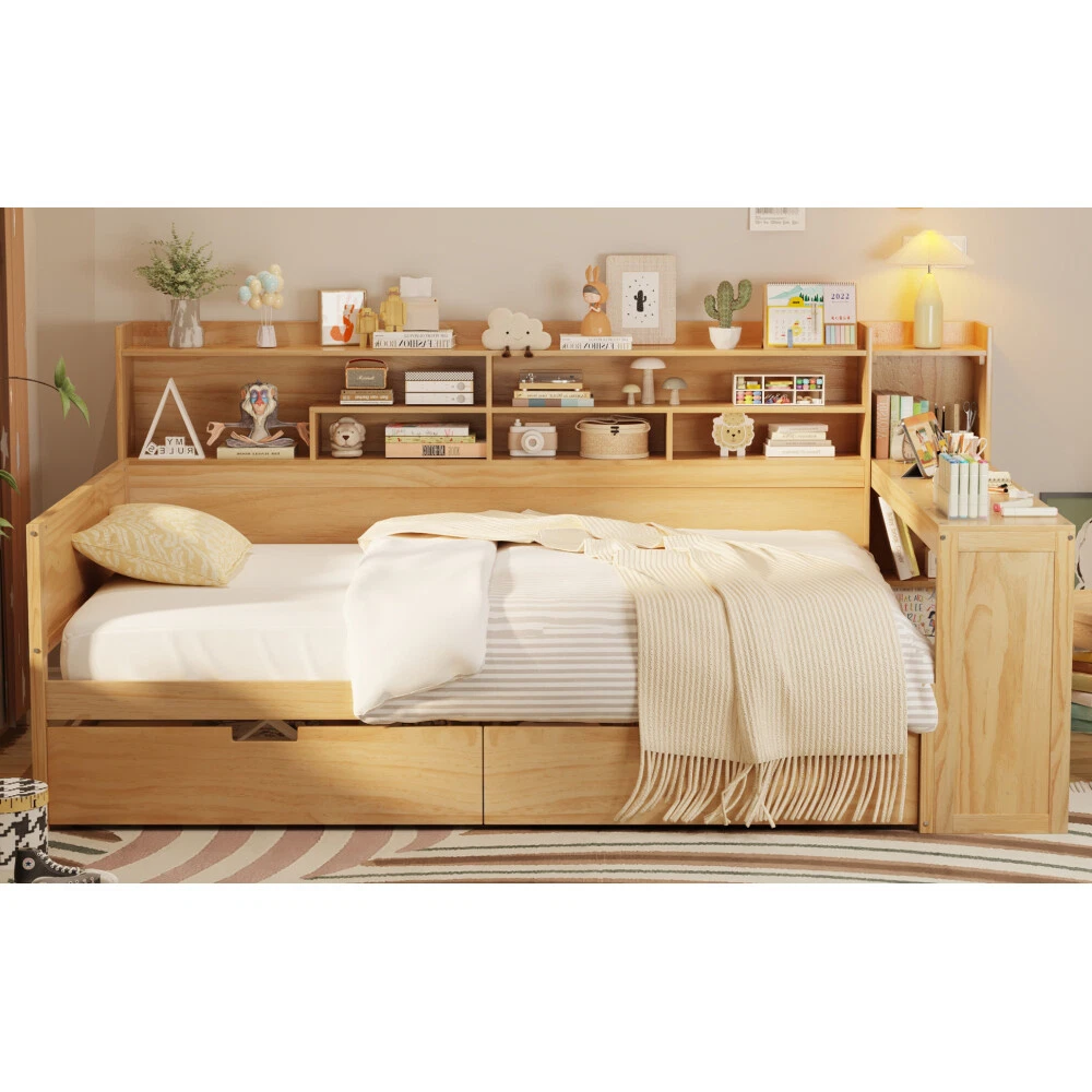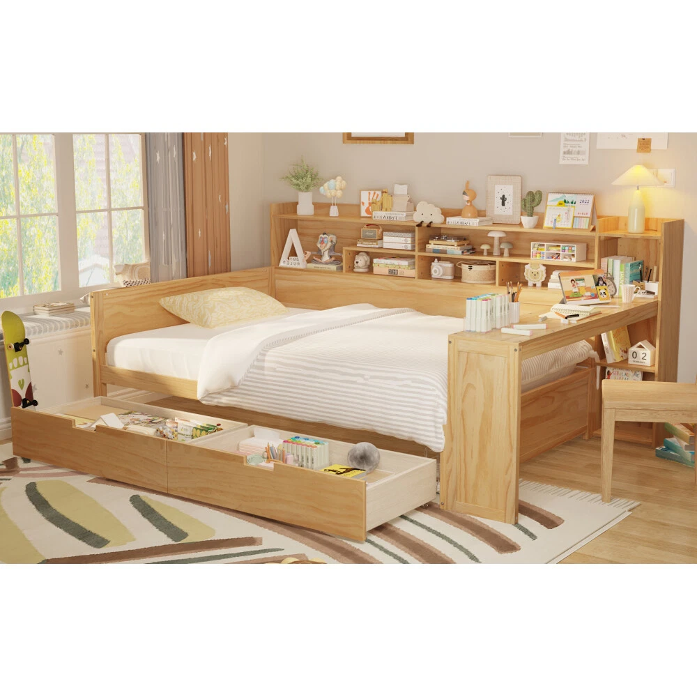 Multifunctional design: This bed boasts a multifunctional design that is tailored to meet various needs. With its multi-layer storage shelves on the side, two spacious drawers at the bottom, and a study desk at the foot of the bed. The bed is designed with a modern aesthetic, featuring clean lines and sleek finishes that effortlessly complement various bedroom styles. Bed Frame with Study Desk: This bed comes with a unique feature - a study desk at the foot of the bed. Transform your bedroom into a productive workspace effortlessly with this innovative design. Whether you need a quiet place to study, work on your laptop, or simply enjoy a good book, this multifunctional bed provides the perfect solution. Maximize your space and productivity with the convenience of a built-in study desk right at the end of your bed. Space-saving:This bed is designed with multi-layer storage shelves on the side, along with two large drawers at the bottom, providing ample space-saving solutions for your bedroom. With the convenient storage options, you can store bedding, toys and other items to keep your essentials organized and maximize the use of space efficiently. Superior Quality: Made of high-quality MDF,Plywood and Pine, the frame of this bed is not easy to be affected by humidity change and lead to crack. The strong legs, wide boards and 10 slats for bed ,not only improve the weight capacity of the bed greatly but also ensure the stability. Product Dimension: Overall Product Dimension: 91.3"L X 64.9"W X 44.9"H. Bed suitable for Full size mattresses. Wooden Daybed with Storage Shelves, Multi-functional Bed with Two Storage Drawers and Study Desk This bed is a versatile piece of furniture with multiple functionalities to meet your various needs. Featuring multi-layer storage shelves on the side, two large drawers at the bottom, and a study desk at the foot of the bed, it offers practical solutions for maximizing space and organization in your bedroom. Whether you need extra storage for bedding and belongings, a designated workspace for studying or working, or simply a stylish and functional bed, this multi-functional design has you covered. Enjoy the convenience and efficiency brought by this bed's versatility and innovative features.