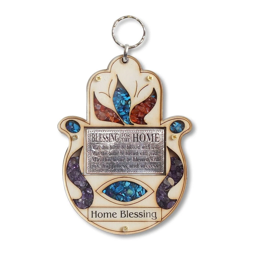 Wooden Hamsa Blessing for Home - Good Luck Wall Decor with Simulated Gemstones Product Details Product Dimensions: 5.5 x 4 x 5.5 inches Item Weight: 2.39 ounces Manufacturer: My Daily Styles Item model number: MAT015 Is Discontinued By Manufacturer: No Date First Available: November 20, 2015 Dimensions: 4.0" (W) x 5.5" (H) Ready for Hanging: The amulet comes with a 1.50" extension ring, making it easy to hang on any wall. Material: Wood and Semi-Precious Stone Chips Hamsa Wall Decor: This amulet takes the shape of a Hamsa, symbolizing protection and good luck. Semi-Precious Stones: The inclusion of semi-precious stones adds a touch of color and vibrancy to your space. Engraved Home Blessing: A heartfelt home blessing is elegantly engraved on the wooden surface, creating a warm and welcoming atmosphere.