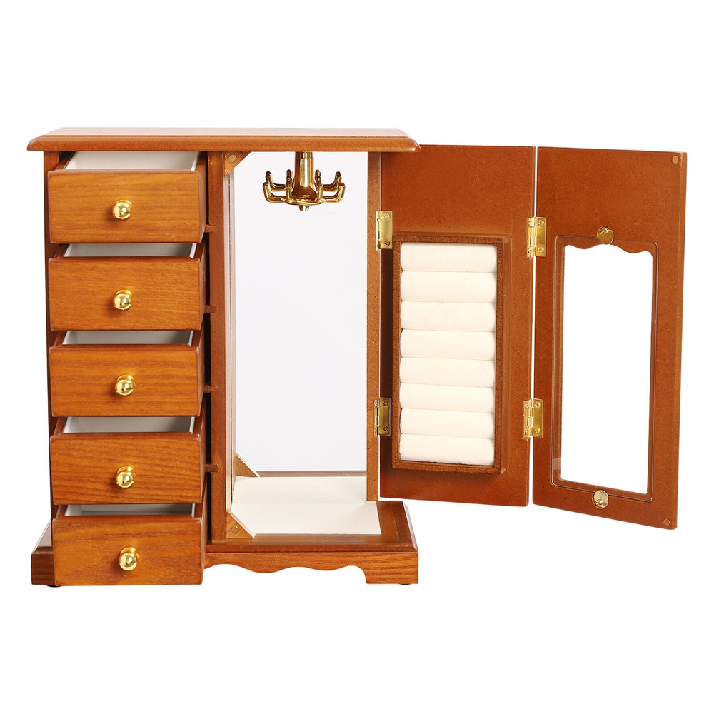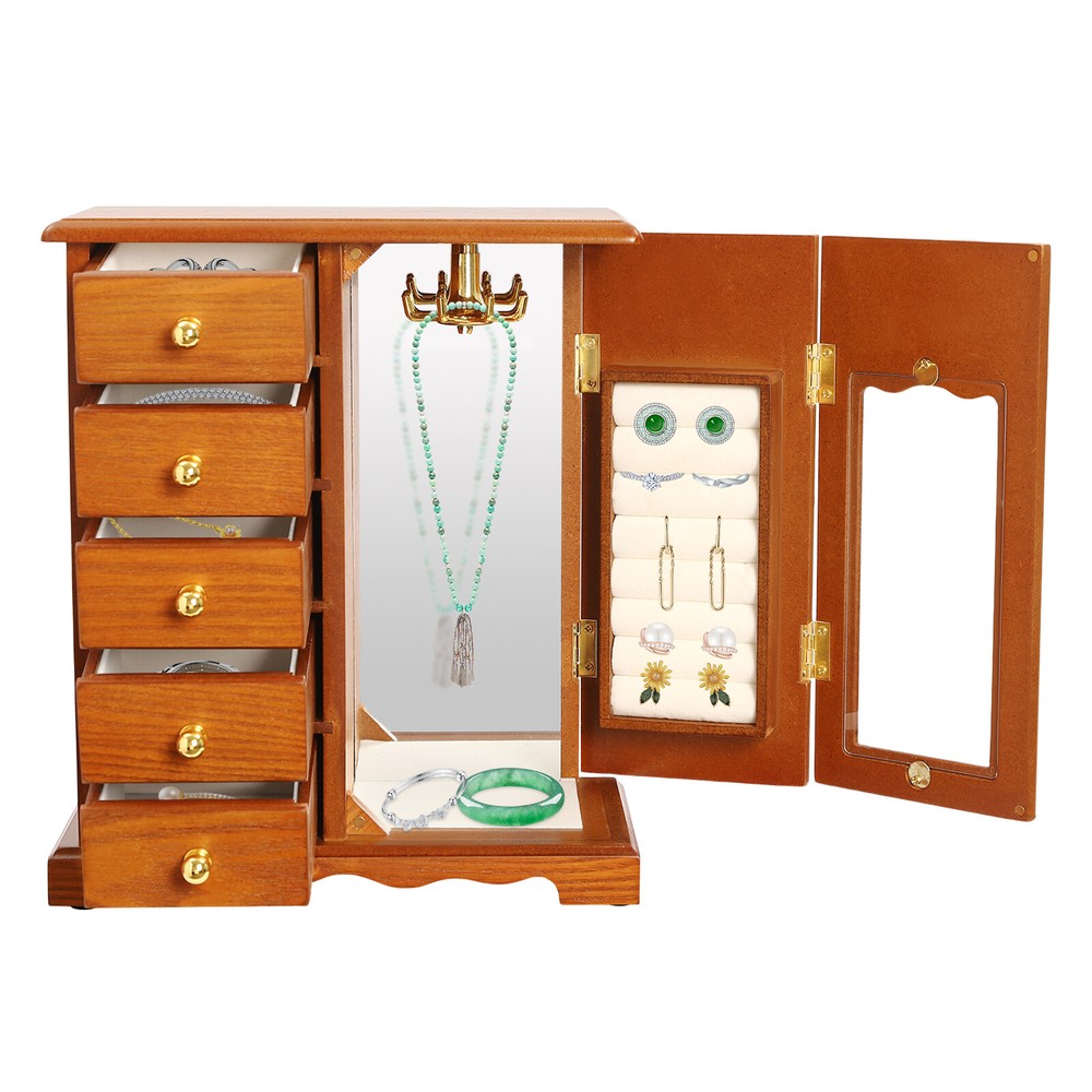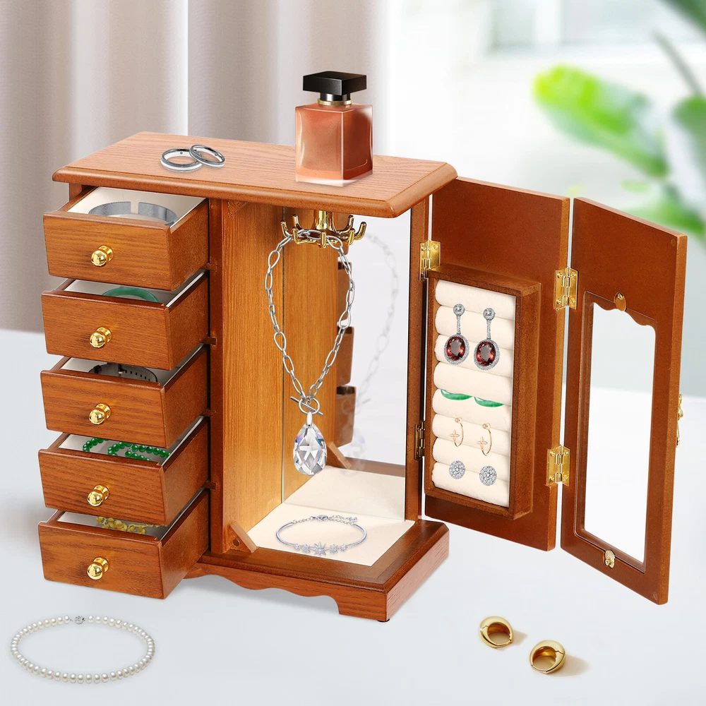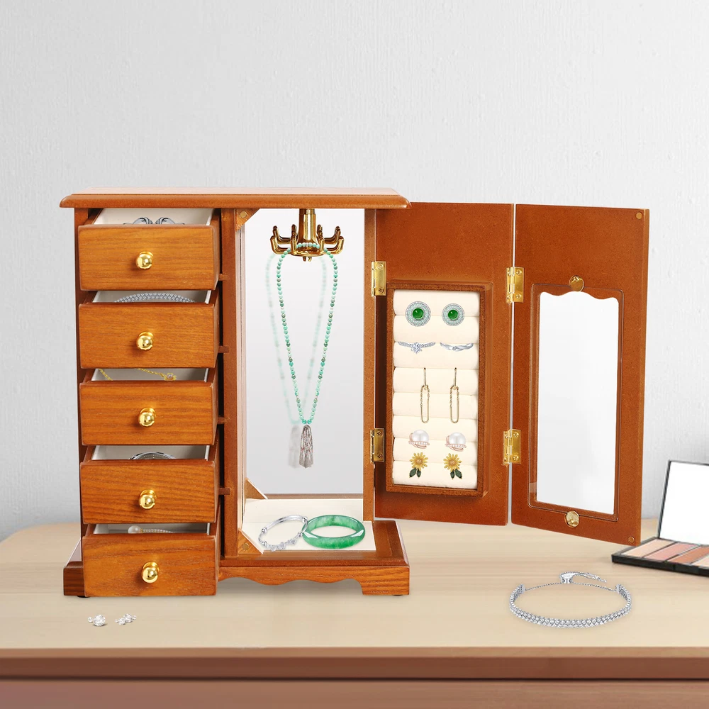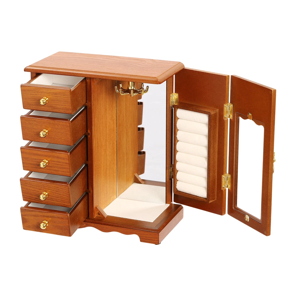 Wooden Jewelry Box Jewelry Storage Cabinet Organizer Mirror With 5 Drawers