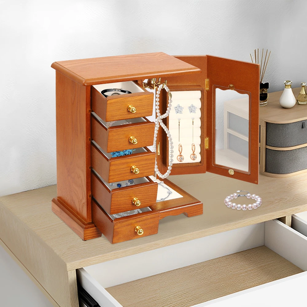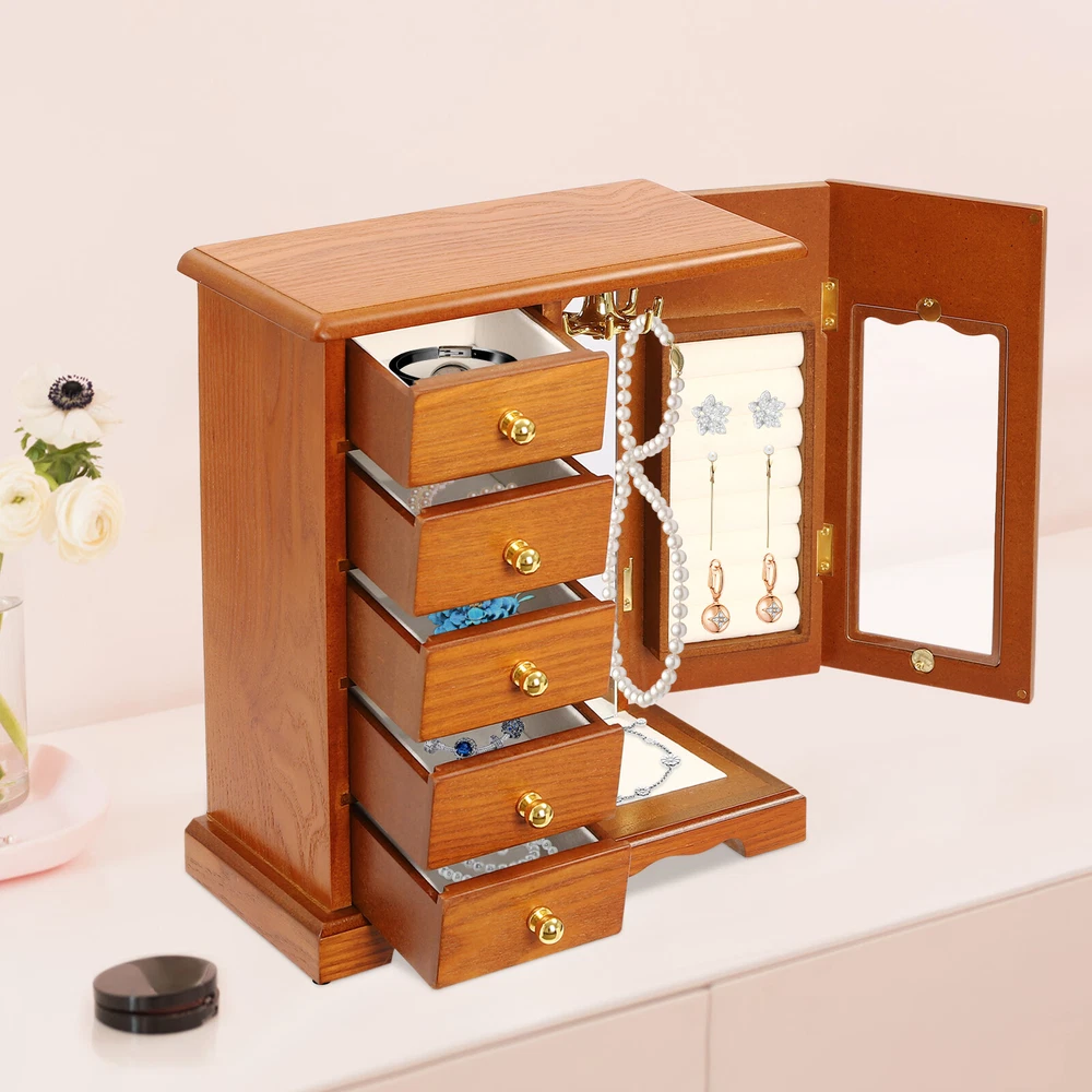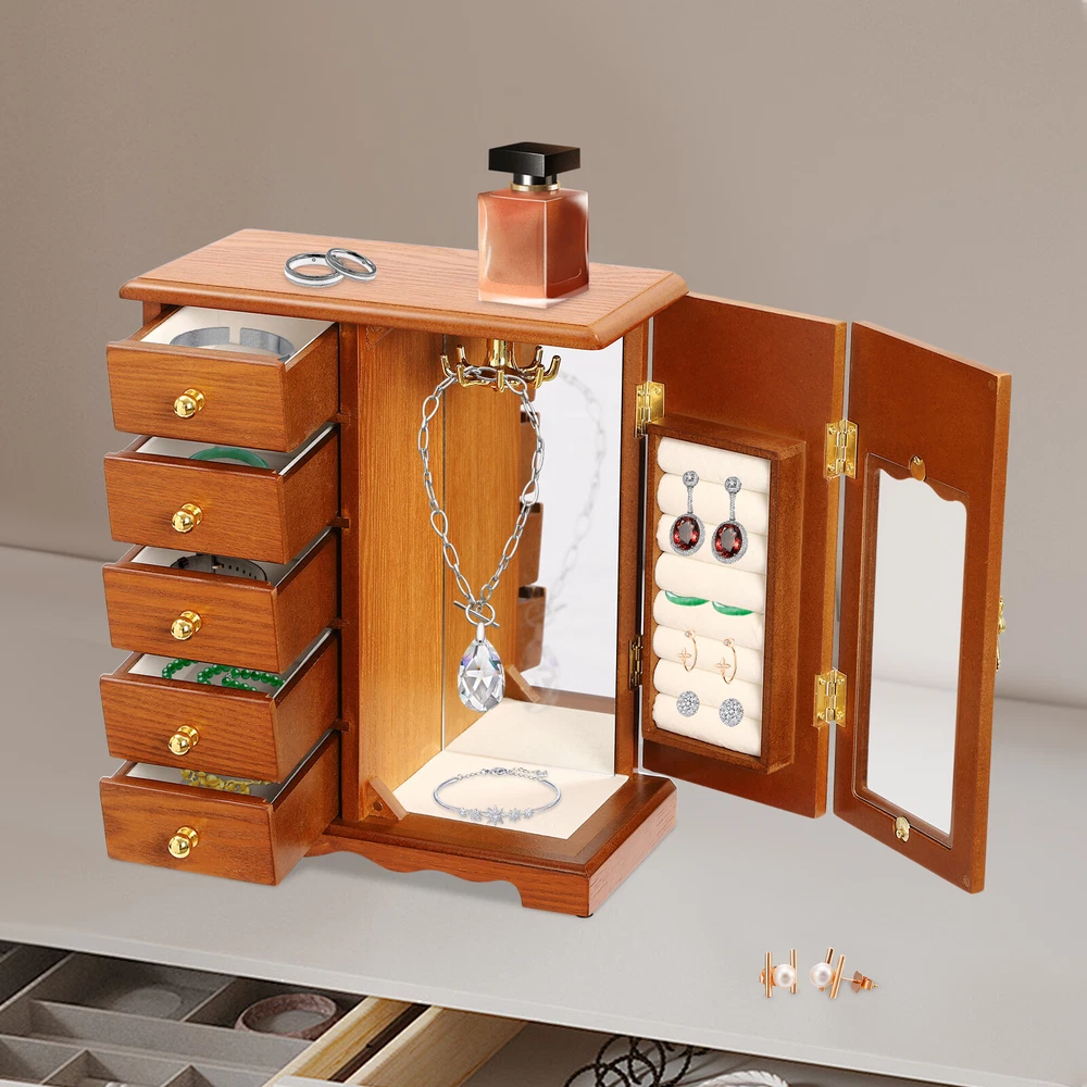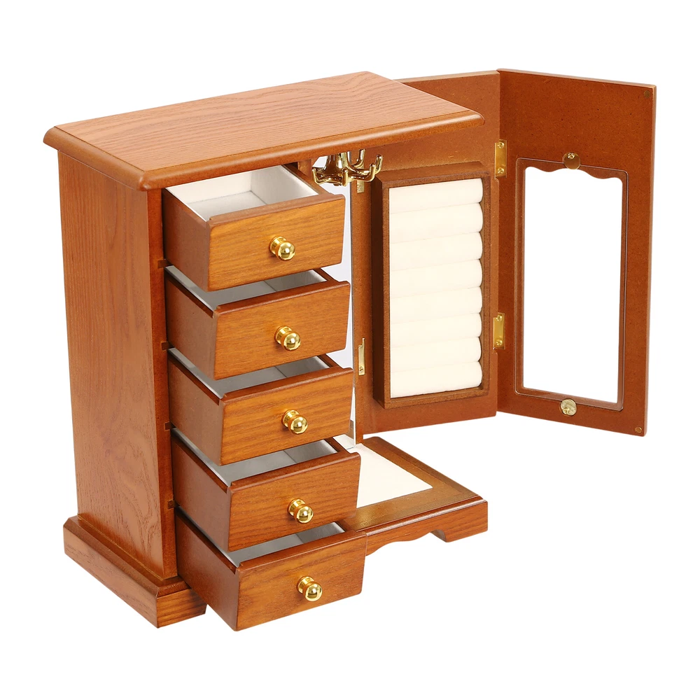 Wooden Jewelry Box Jewelry Storage Cabinet Organizer Mirror With 5 Drawers