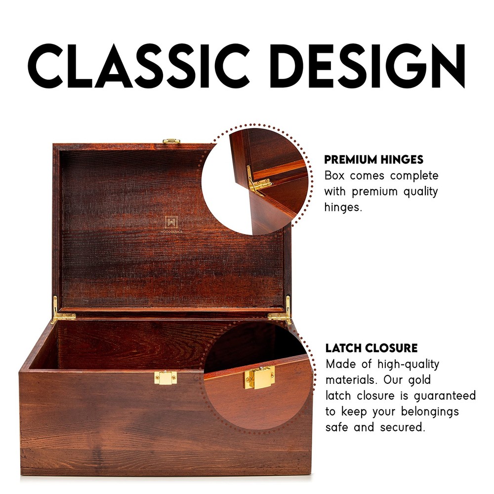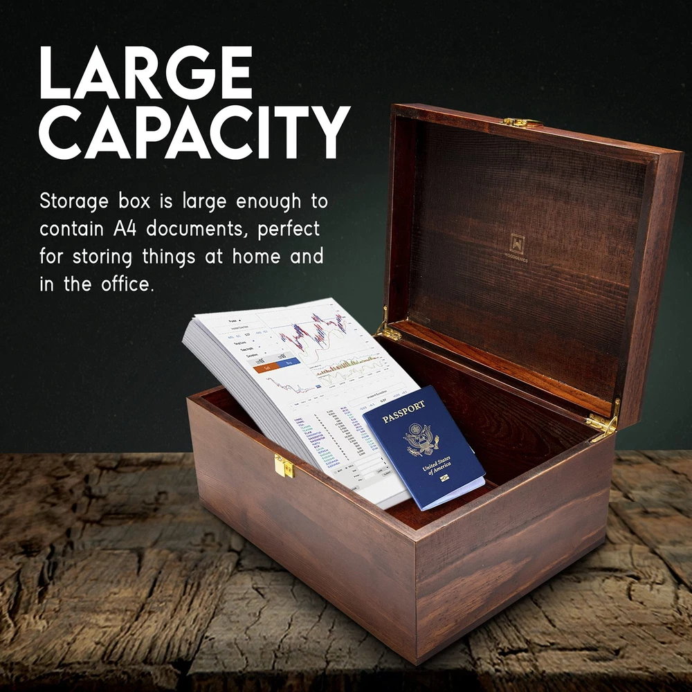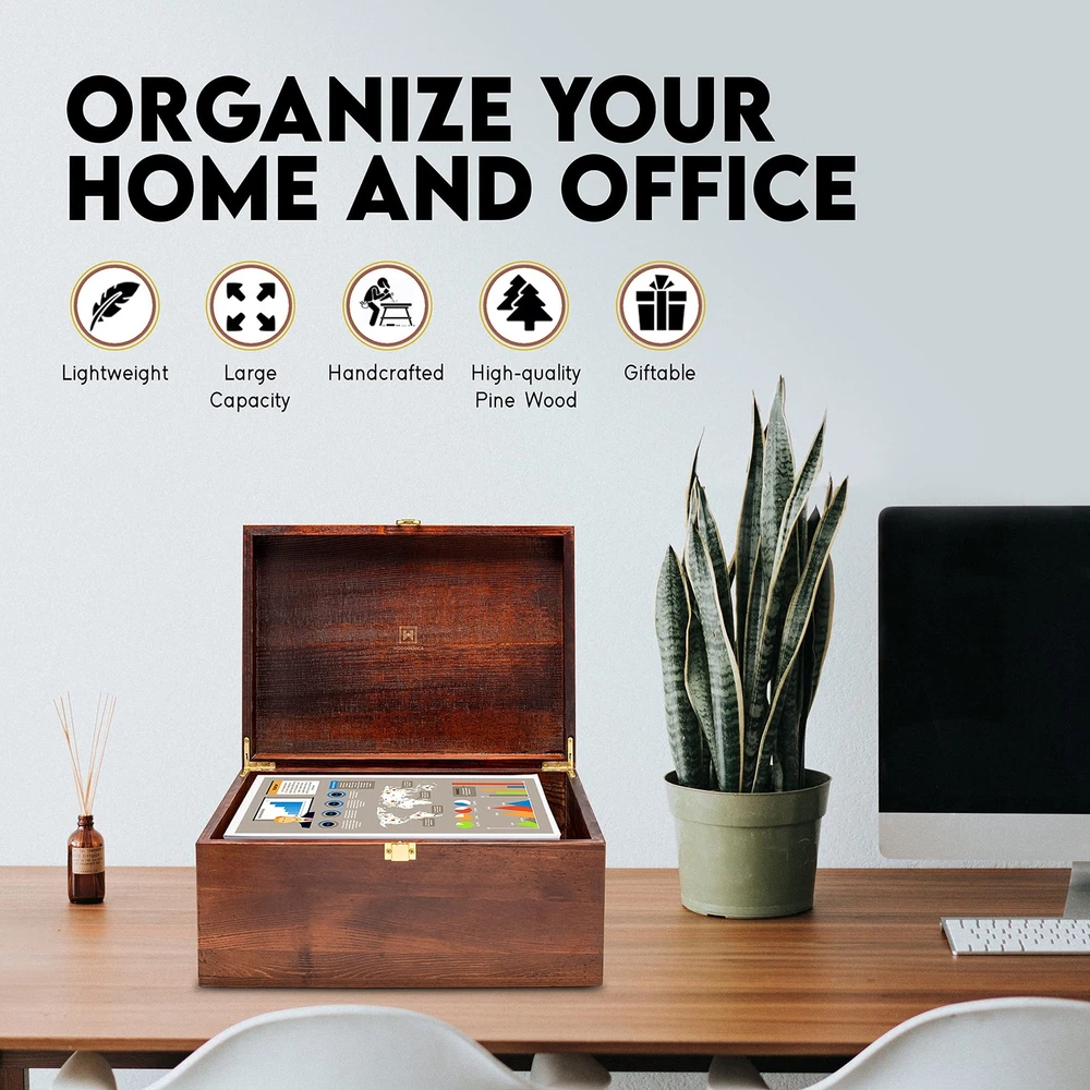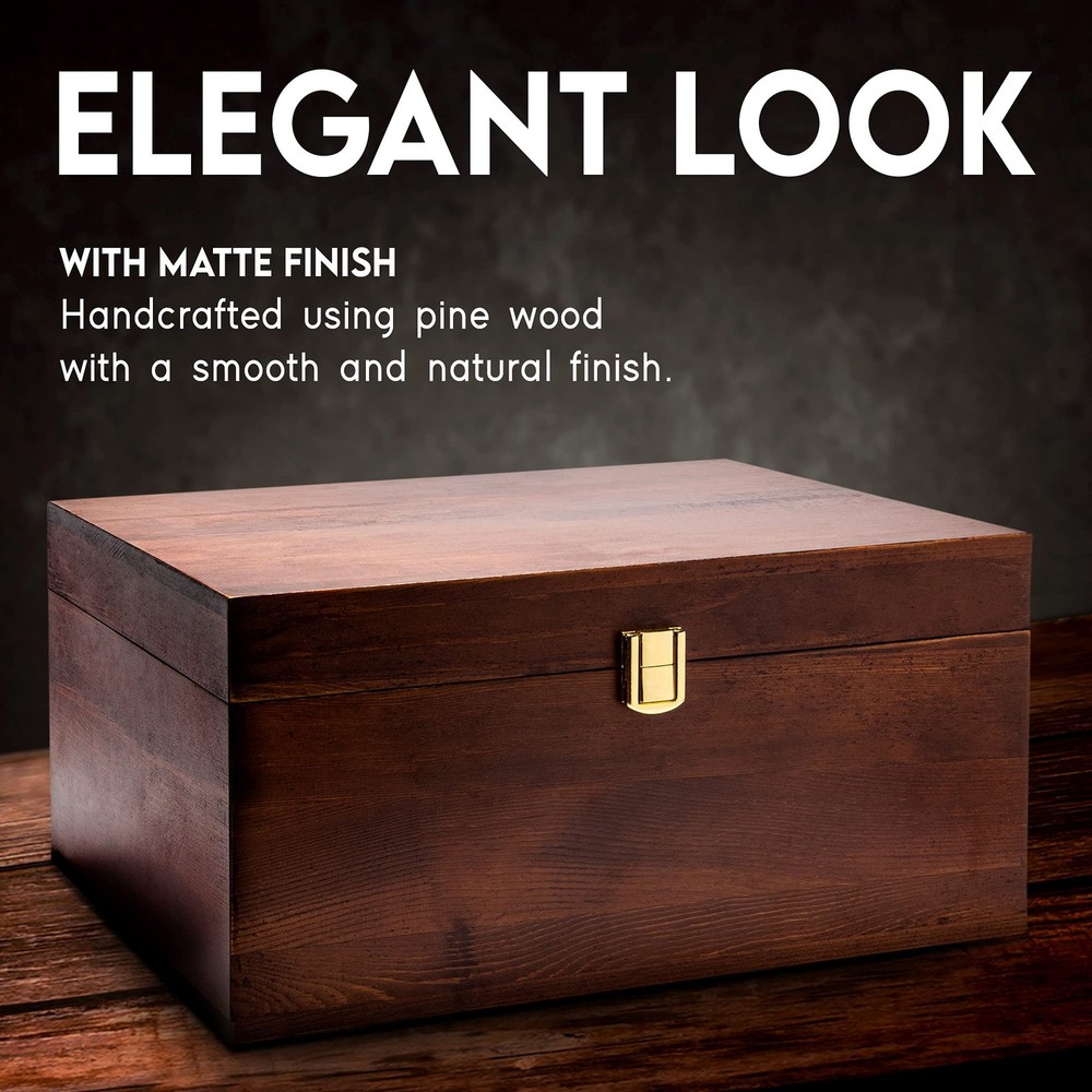Looking for A Stylish Brown Wooden Storage Box? We know you hate all the mess you see in your homes and offices. Seeing items scattered everywhere makes you stressed. Suffer no more by giving your space a fresh, modern, and luxurious cleanup with our storage box. Our brown wooden storage box comes with a 10" by 7" inner box space that works as an organizer for your letters, documents and even your phone, wallet trinket and accessories. The matte brown finishing will match any home decor easily, now let's crush your interior decor and decluttering goals! Organizing your house will never be a challenge as the multifunctional brown box can be used for a variety of purposes. It can be a wooden keepsake box, shoe shine box, tarot card box, tea storage box, photo storage box, time capsule box or serve as a treasure chest box! Never worry about losing small items again! Our wood box can contain all the small stuff like medication and jewelry too. After you have stored your items, secure the lid with a simple latch that is easy to use. Our wooden storage box is sturdy and made of quality pine wood material that has a great smell. Keep your kitchen storage organization tip top with this storage box that can be handy for flatware storage too! Use it as a wooden recipe box so you never run out of ideas on what to cook for the family. Interior design and decor has never been easier with our brown wooden storage box. It's great for people who are looking for classy, timeless, yet stylish and functional storage boxes. These boxes are the perfect housewarming party gifts. Spruce up your friends' spaces with this brown wood storage box that can store their belongings such as documents, contracts, and other office-related items. Look no further for cool big gift boxes with lids! We have an awesome decorative storage box that you will love. Add our decorative box to cart today! Glam Up Your Personal Space - An aesthetic large wooden box that adds sophistication to your room. The stylish matte brown exterior matches your home and office decor effortlessly. This cute storage box will be great for matching brown or wooden home decor Declutter Your Home And Office - A spacious box that can fit different letters/A4 documents, tea storage, tools, jewelry, dice, crafts, medication, containers, trays, even a recipe, file, dvd or gadgets. Organize your kitchen, bathroom, bedroom and dining area! Secure Your Things - Our box is made of pine wood and a gold hardware hinge and latch so that children cannot open it easily. Keep any personal items in hidden storage with this cute box! Perfect Gift For Anyone - Our wooden boxes come in a beautiful packaging box with a gift message tag for you to craft a personalised message. It is an awesome brown gift box for both men and women! Affordably Priced - Our boxes are handcrafted with love. If they are found to be damaged upon arrival, we will send you a replacement box