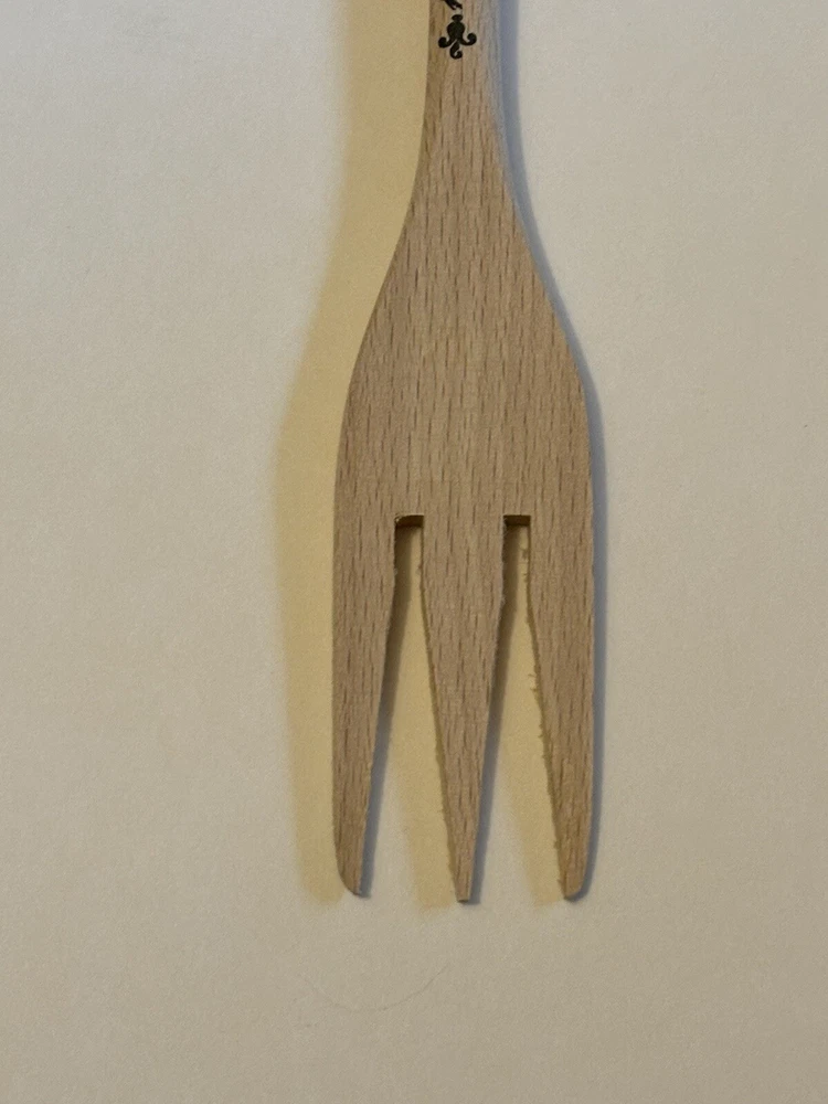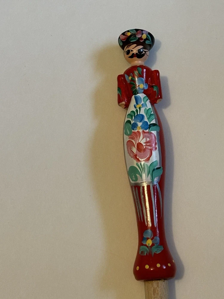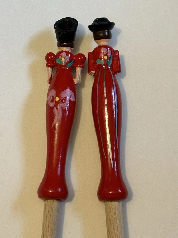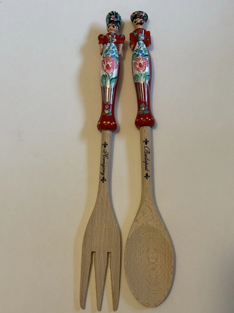 Wooden Kitchen Utensils, 12” Long, handles are plastic, one fork is a woman with Hungary inscribed on the handle and a spoon is a man with Budapest inscribed on the handle. Very colorful and unique items.