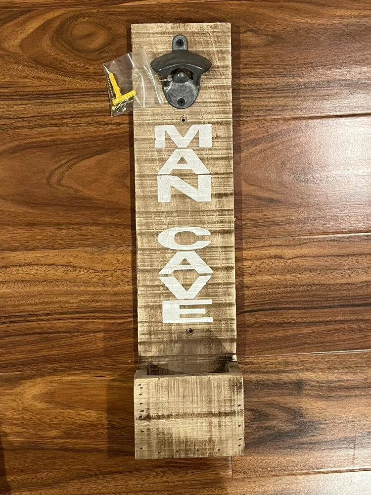 Wooden Man Cave Sign With Metal Bottle Opener & Bottle Cap Storage 17.75" Tall