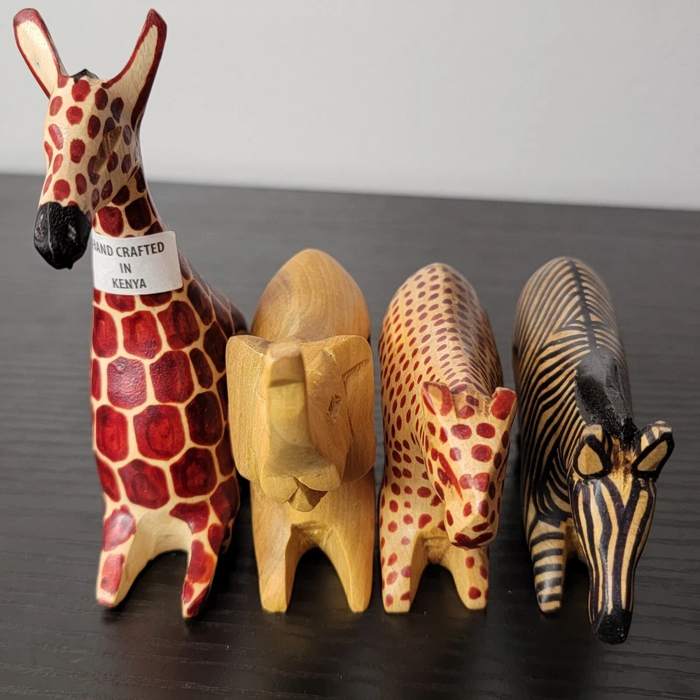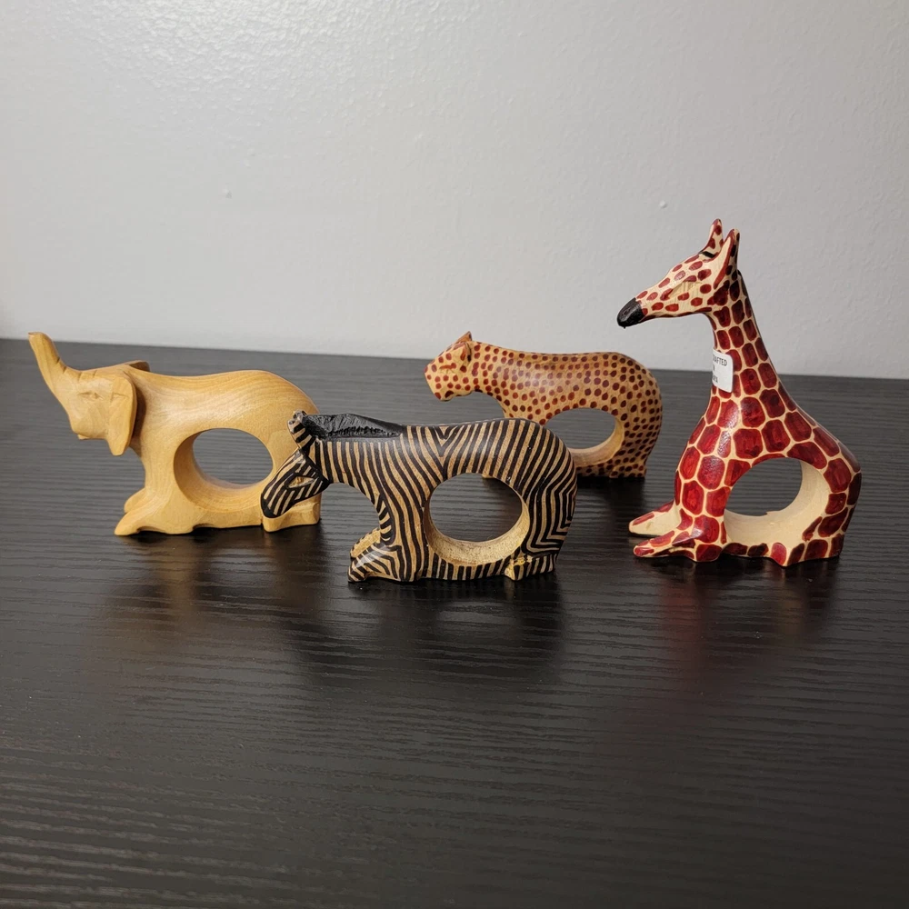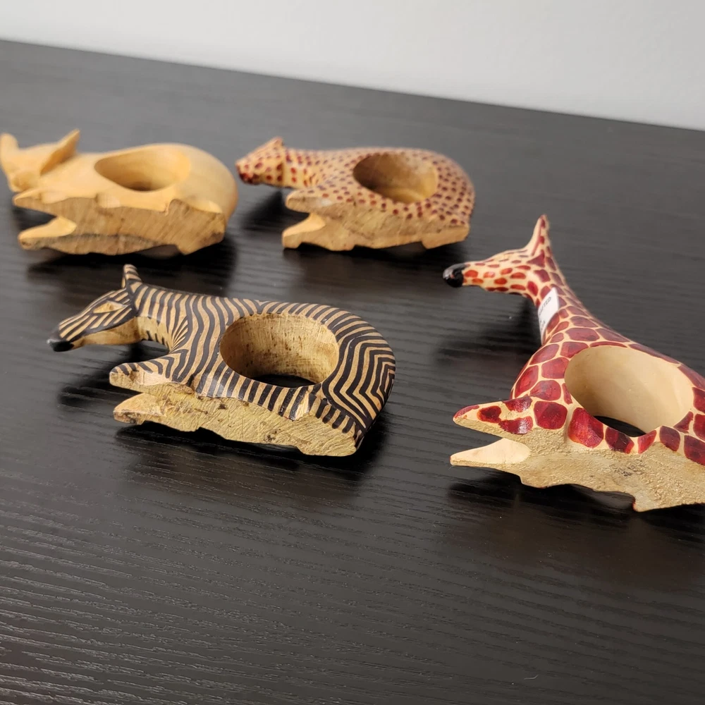 Country/Region of Manufacture:KenyaType:Napkin RingTheme:Animals, SafariMaterial:WoodOccasion:MultipurposeFeatures:Hand CarvedNumber in Pack:4Brand:HandmadeColor:BrownMPN:Does Not Apply