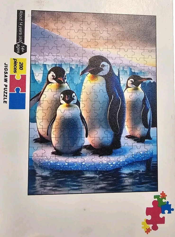 The Wooden Penguin Puzzle is a multi-color jigsaw puzzle featuring 200 interlocking pieces made of wood. The puzzle depicts a theme of animals, specifically penguins, with letters on the back of the pieces for additional challenge. Recommended for ages 14 and up, this puzzle is designed for older teenagers and adults who enjoy a challenging and engaging puzzle-solving experience. Perfect for fans of penguins and those who appreciate high-quality wooden puzzles. Includes an 8x11" poster of completed puzzle Approx finished dimensions 14x10"