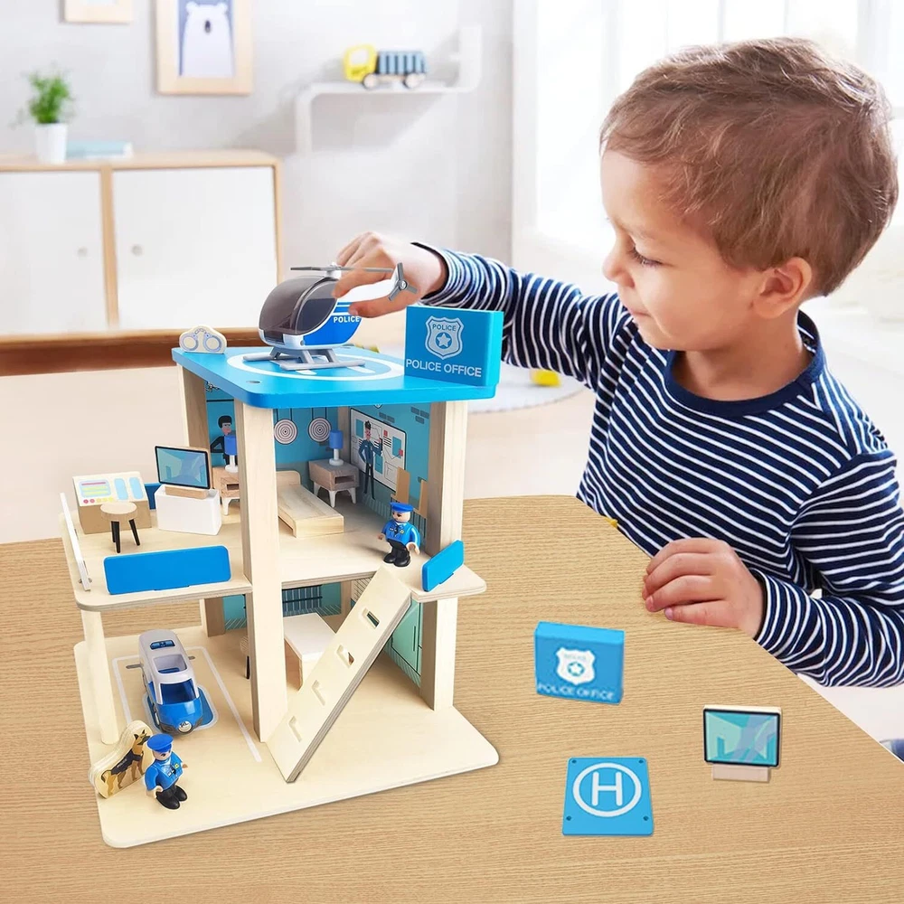 Wooden Police Station Playset Toy, Multicolor 3-Level Pretend Play Dollhouse...