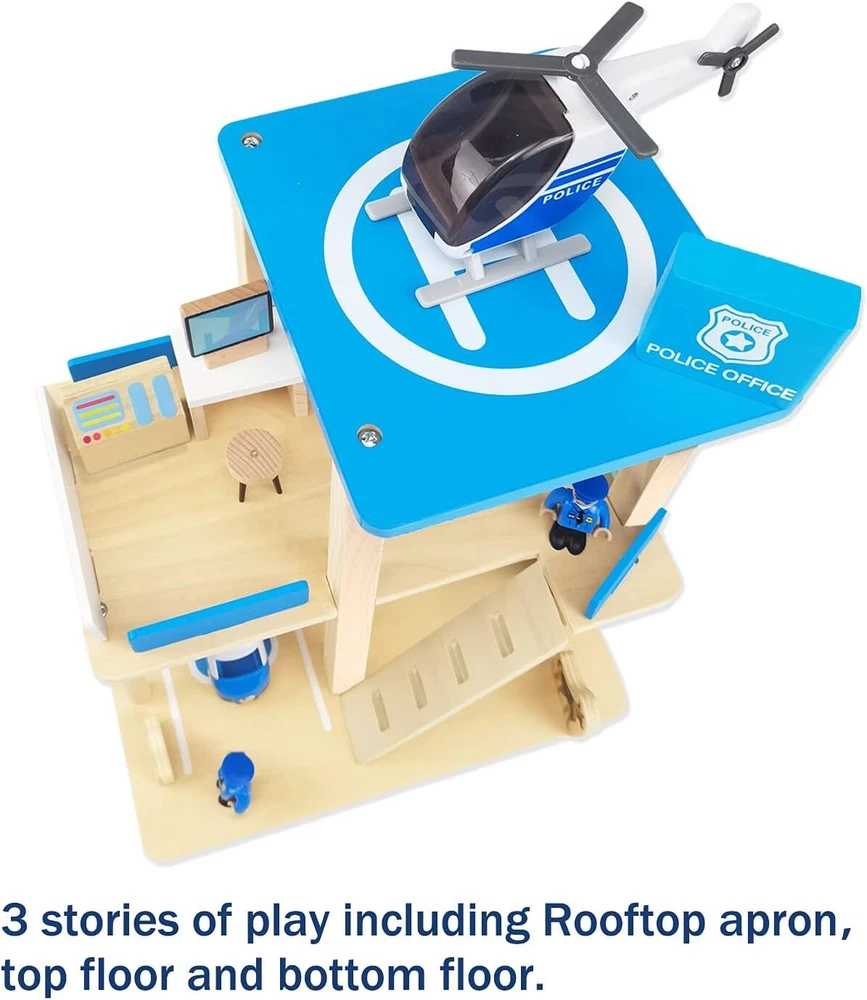 Wooden Police Station Playset Toy, Multicolor 3-Level Pretend Play Dollhouse Set with Figures, Car, Helicopter and Accessories, Preschool Learning Educational Toys for Toddlers Kids Age 3 and up Product Details 【Wooden Police Station Playset】 The three-level police station features an office, a monitor room, a rest room, a helicopter with its own landing pad, a police car with parking space, two police officer, one police dog, a handcuffs and other accessories. Adult Assembly required. 【Entertaining and Educational Toys】 The sides and front of this three-level dollhouse are open for easy access to all areas of the station to play and place furniture. The Wooden Police Station Pretend Play Set open design allows for multiple children to play at one time. 【Learning while Playing】The police station playset will provide hours of fun with family and friends, offers lots of entertaining and imaginative play, which stimulates the child' s fantasy and promotes creativity, motor skills and communication. 【High Quality and Safe Materials】Made of natural quality wood material and finished with non-toxic child-safe paints. All the components are polished smooth, conform with US toy standard, ASTM and CPSIA safety test approved. 【Great Gifts Choice for Your Kids】This wooden police station pretend play doll house set is a great education toy for 3 years old and up preschool children. The realistic scene always attracts your kids to play with it, This is best Christmas or birthday present.