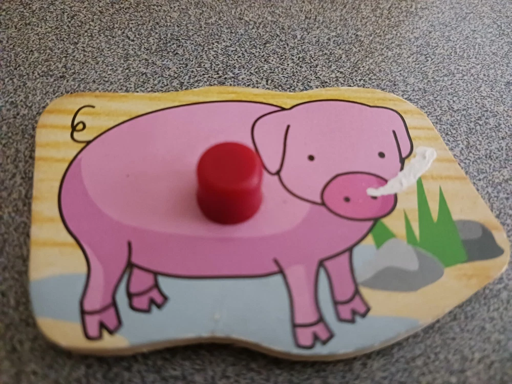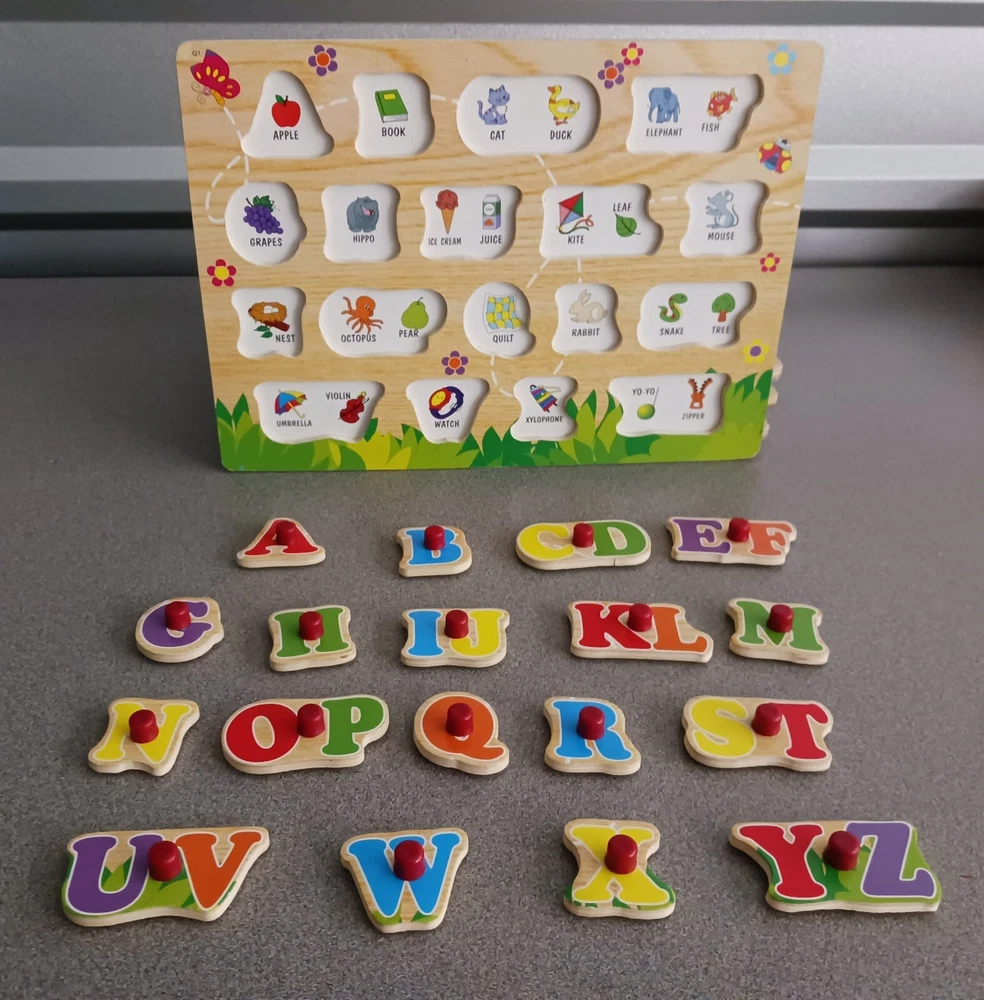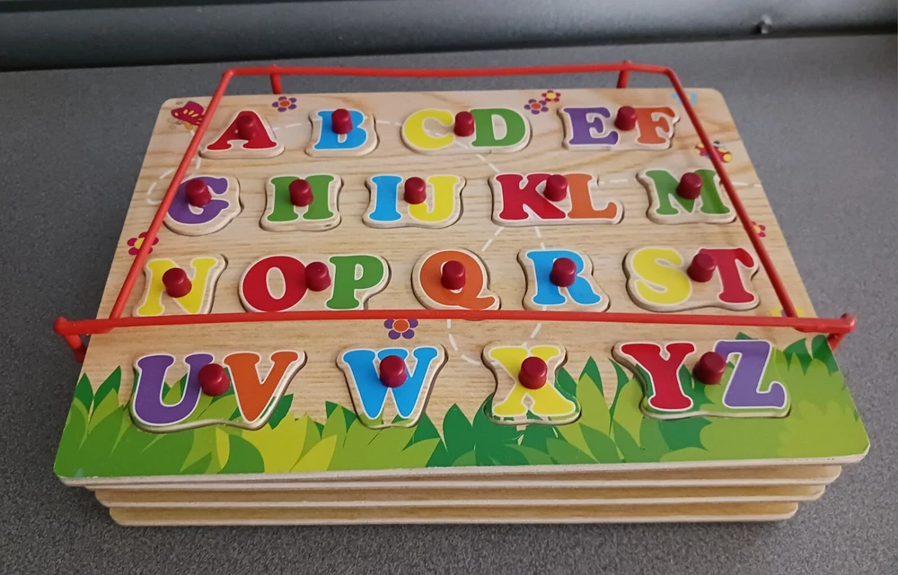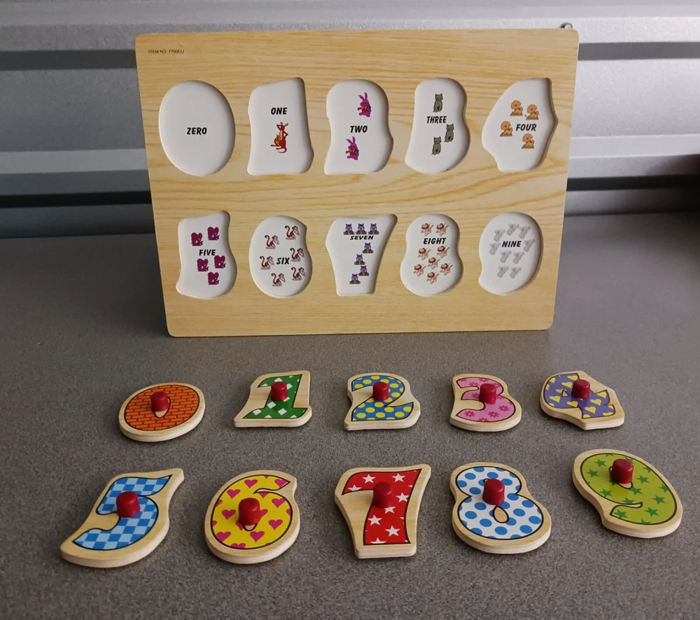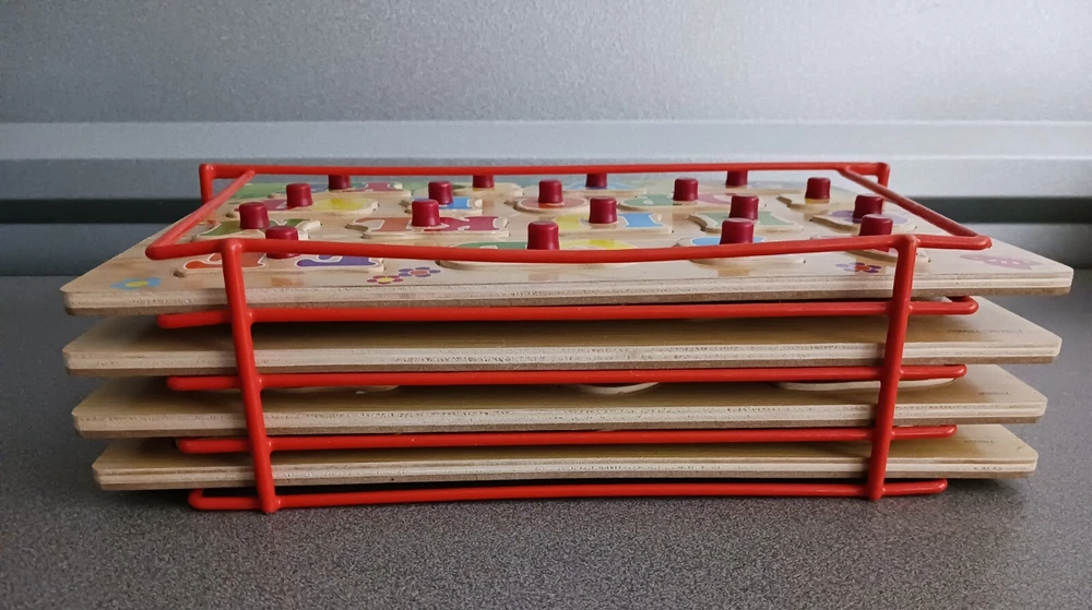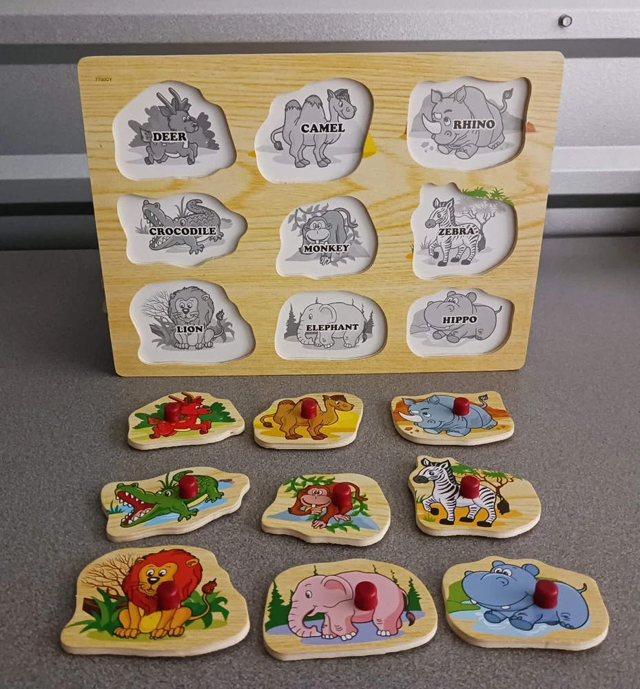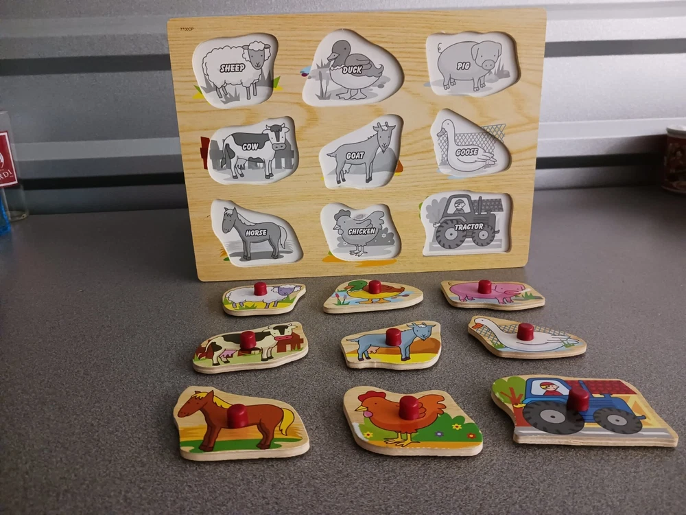Set of 4 wooden puzzles with wire rack. See pictures for damages. ABCs, Numbers, Farm animals, zoo animals. Please be advised of choking hazards for small infants or children. Puzzle pieces have small plastic knobs.