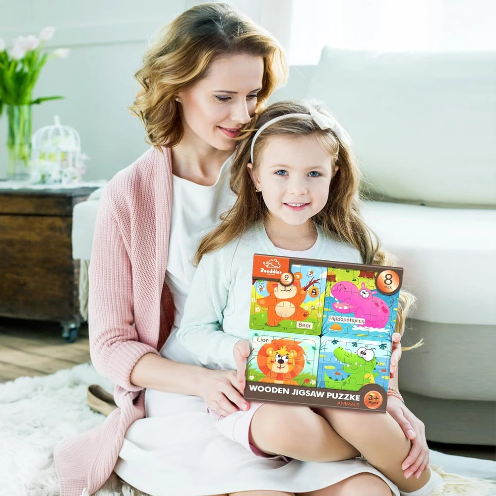 Wooden Puzzles for Toddlers, 8 Pack Animal Jigsaw Puzzles for Kids3-5, 9 Pieces Preschool Learning Activities, Learning & Educational Toys, Gift for Boys, Girls Product Details Package Dimensions: 11.54 x 10.87 x 0.63 inches Item Weight: 15.7 ounces Item model number: 072JP Manufacturer recommended age: 36 months - 8 years Manufacturer: Zeoddler 【Jigsaw Puzzle for Toddlers】Zeoddler Jigsaw Puzzles Set is the PERFECT CHOICE for you and your toddlers as it is made from natural wood, printed with well designed. This montessori toys is suitable for toddlers and represents the perfect activity to learn through play! 【8 Pack Educational Toys】Our cute wooden puzzle set includes 8 different animals. It will provide hours of entertainment for your little one. These puzzles are also durable enough to play everywhere you want - an excellent hand-eye coordination and preschool learning challenge for your child! 【Preschool Learning Toys】Our toddler activities learning toy is designed to help children develop their fine motor skills, hand-eye coordination, critical thinking and object observation. It also helps young kids to discover the world by matching different patterns of puzzles. 【Child-Safe & High-Quality】We insist on adopting high-quality wooden toys and making delicate products attentively for toddlers. This sensory toys for toddlers is made of 100% nature wood with child-safe and eco-friendly. The edges of this puzzle set are SMOOTH and won't hurt the toddler's skin. 【Lovely Present for Kids】Get this dinosaur puzzles Set for your child as birthday gifts, Easter gifts, holiday presents and daily toys. Don't miss any chance to surprised your kids. Zeoddler Jigsaw Puzzle Set for 3+ Year Old Girls/Boys At Zeoddler, we are dedicated to design the unique toys to promote the development of children. toddlers' happiness and creativity are our best motivation. We encourage toddler to learn from playing. The biggest surprise is waiting for toddlers First Choice Gifts Idea as Christmas Gifts Birthday Gifts for 3+ Year Old Girls/ Boys Explore Objects with Play - There are 8 different jigsaw puzzles in one set!!! it is various enough for kids to explore & play. Preschool Learning for Toddlers - Toddlers can take different combinations for fun, that will help strengthen fine motor skills and hand eye coordination. More Fun - This unique sensory toys can be used for funny teaching, parent-child interactive! Gifts Package: Jigsaw Puzzle x 8 What's an CUTE & FUN peg puzzles! We highly recommend this toys for toddler's Early Development.