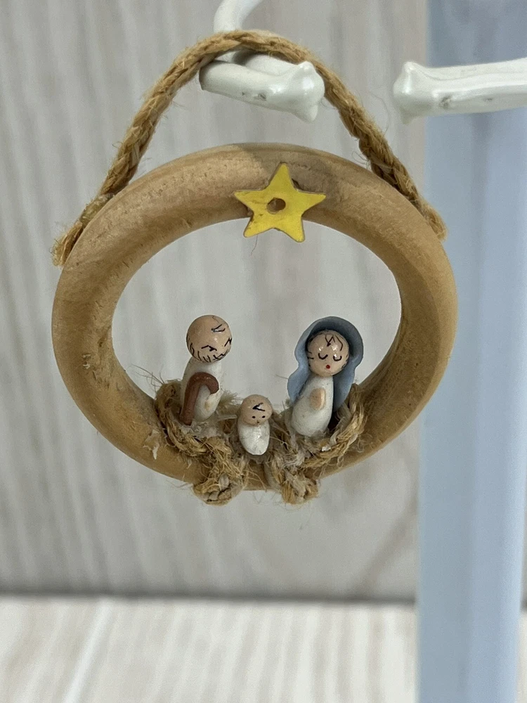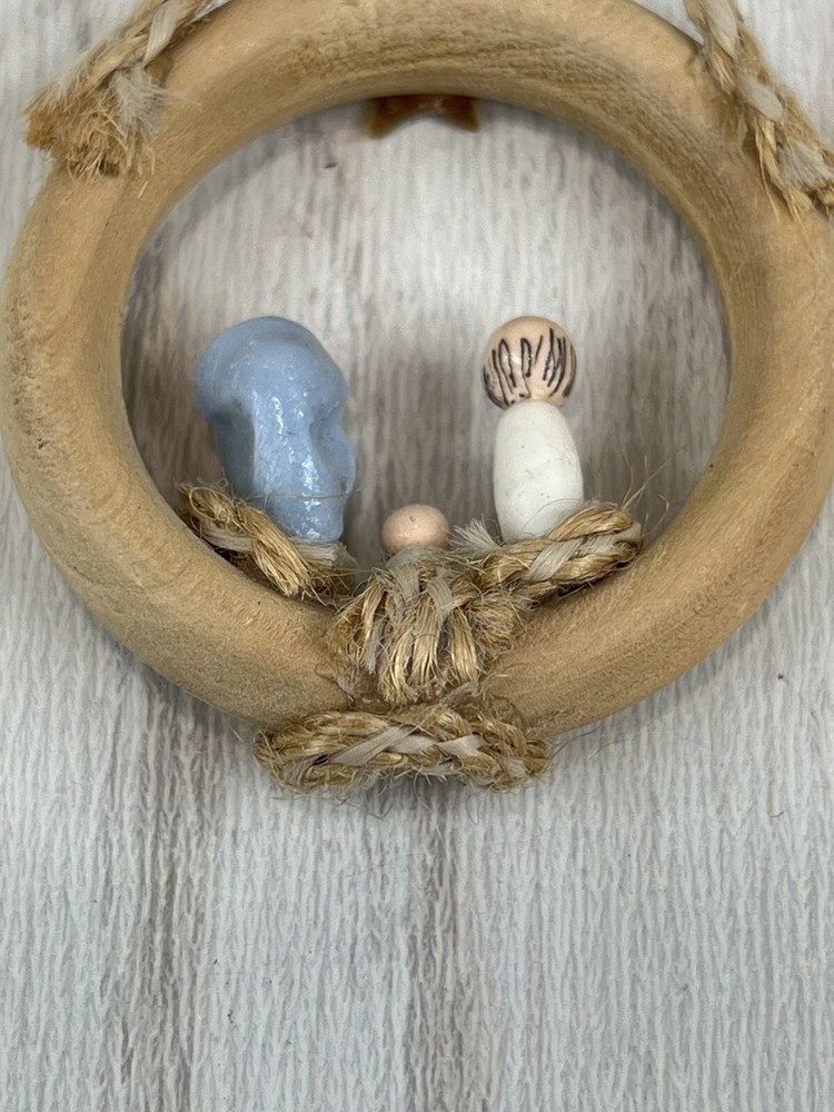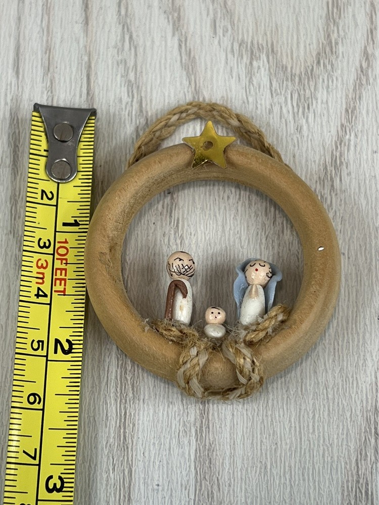 2” Small Wooden & Rope Wreath with Wood Nativity Design. Normal signs of wear wear for preowned item. See pictures for assessment and measurements. Thanks for looking.
