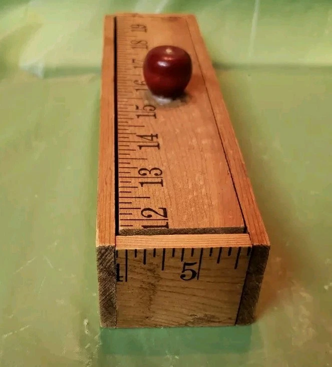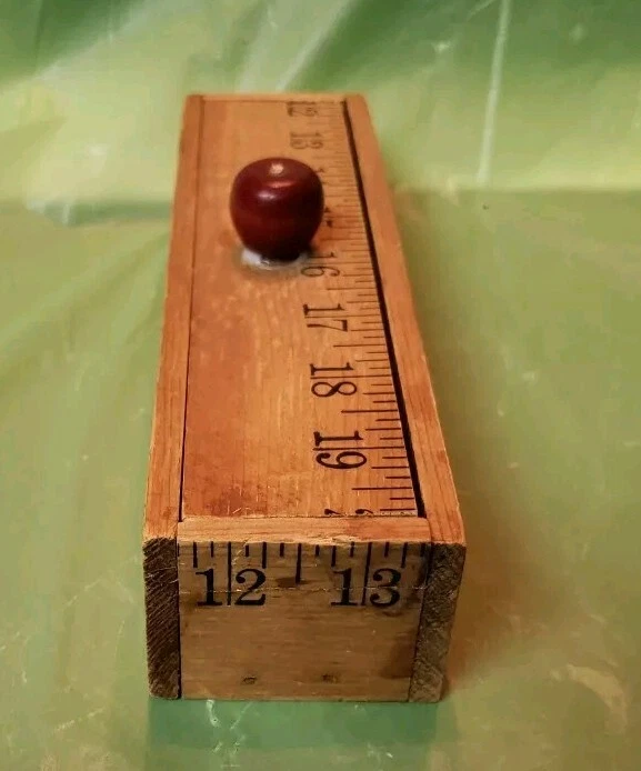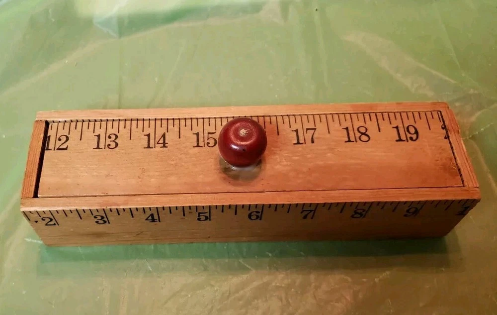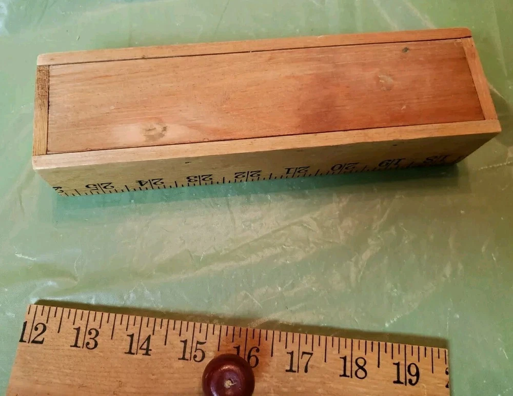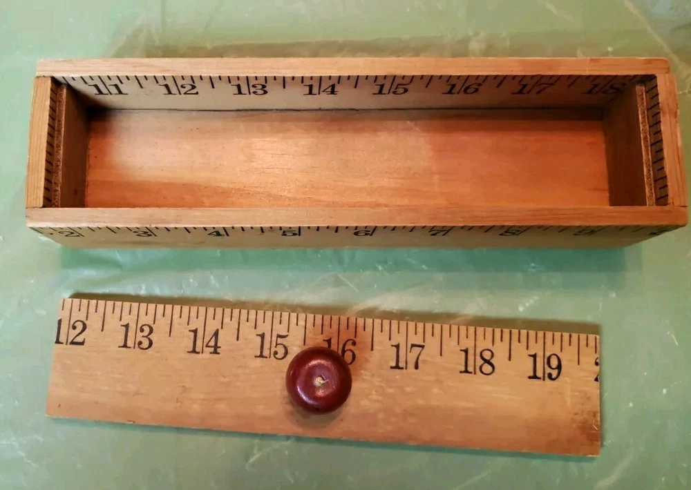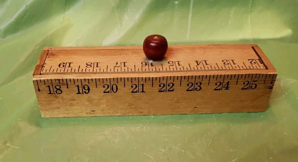 Beautiful pre-loved vintage wooden ruler pencil box with lid. Excessive glue around apple shaped handle but otherwise in excellent condition.