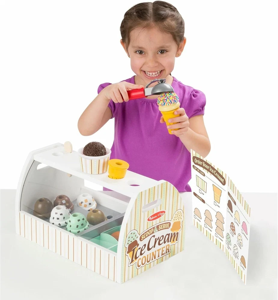 Style: Scoop & Serve Ice Cream Counter ALL-INCLUSIVE ICE CREAM PLAY SET: The Melissa & Doug Wooden Scoop & Serve Ice Cream Counter includes wooden ice cream counter, eight ice cream scoops, six toppings, two cones, cup, scooper, tongs, wooden spoon, and six pretend dollar 1 bills. 28-PIECE ICE CREAM STATION: This 28-piece wooden ice cream play set features a scooper that fits into a hole on top of the scoops to lift, stack, and release the scoops. REPLICATES THE ENTIRE EXPERIENCE: Our ice cream play set with toppings also includes a reusable menu, so children can take orders, pay with play money and serve up deliciousness, just like their favorite ice cream shop. GREAT GIFT FOR AGES 3 AND UP: The Wooden Scoop & Serve Ice Cream Counter makes a great gift for ages 3 and up. For even more screen-free fun, consider adding the Melissa & Doug Wooden Make-a-Cake mixer set. “THE GOLD STANDARD IN CHILDHOOD PLAY”: For more than 30 years, Melissa & Doug has created beautifully designed imagination- and creativity-sparking products that NBC News called “the gold standard in early childhood play.” Product information Product Dimensions 7.7 x 8.6 x 13.6 inches Item Weight 4.69 pounds Country of Origin China Item model number 9286 Manufacturer recommended age 36 months - 6 years