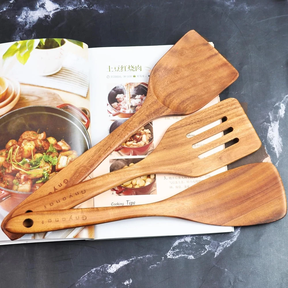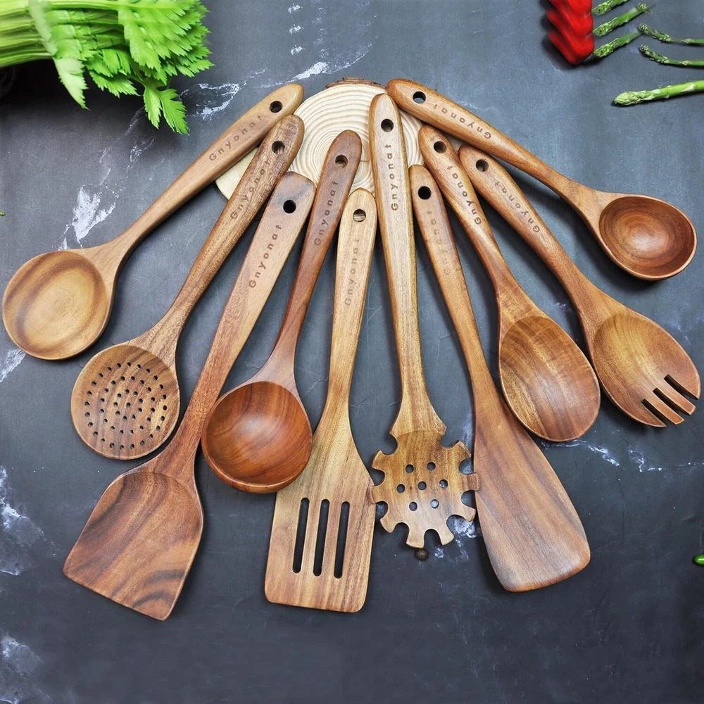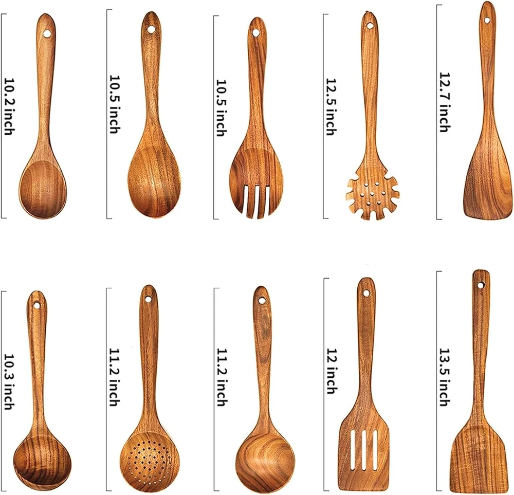 Wooden Spoons for Cooking,Wooden Utensils Cooking 10 Pcs Brown Product Details Color: Brown Material: Wood Brand: Gnyonat Style: Cooking style Number of Pieces: 10 【100% Natural Teak Wood】Wooden utensils for cooking is made of 100% natural teak wood.This wood material is hard not easy to deform and crack.The surface is covered with unique and beautiful textures.Long-term use that is still bright as new.It’s a very high-end kitchenware set.It's loved by the majority of cooking enthusiasts. 【10-Piece Wooden Spoon set 】Wooden spoons for cooking includes wok spatula,slotted spatula,frying spatula,filter spoon,soup spoon,seasoning spoon,salad fork,rice spoon,oil spoon,spaghetti spoon,various functions and wide use,it can meet all your daily cooking needs. 【First-Class Craftsmanship】Our wooden spoons for cooking is made of whole wood,the finished product has been hand polished many times.There are no cracks and splicing marks on the surface,surface does not leave any wood thorns or dents,the hand feels smooth and delicate like silk,its destined to replace other out of date low-end kitchen utensils. 【Heat Resistant, Suitable for Non-Stick Pan】The wooden utensils for cooking has super heat resistance and will not melt or deform when stirred in the boiling soup,and will not melt due to high temperature like rubber kitchen utensils, good heat insulation performance, and can prevent hand burns. Wood cooking utensils prevents from scratching expensive non-stick pans,which can protect other tableware in your kitchen. 【Easy To Clean & Store】Our wooden spoons for cooking that is very easy to clean.The smooth surface only needs to be rinsed with clean water,then wiped clean with paper towels or sponges,hung on the storage rack to dry naturally,it does not take up your kitchen space.