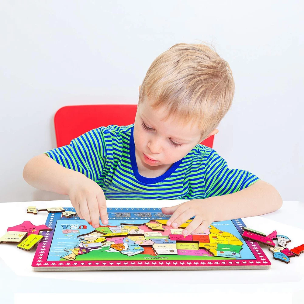 USA MAP PUZZLE: map puzzle consists of 1 wooden frame and 45 pieces puzzles, made of sturdy wood, smooth wood pieces fit nicely, the raised textures make it easy to grab for little hands. The wood board measures about 15.6 x 11.7 x 0.39 inches. EDUCATIONAL GEOGRAPHY PUZZLE: All 45 pieces have customized details, including the state name and capital, and some interesting fun facts, such as the statue of liberty for New York. Your will be interested in who lives where. Encourage children to explore the geography, and Promotes research, tactile and motor development, and thinking and learning. LEARN THROUGH PLAY: United States Puzzle is great for classroom learning or home play time. Teach your about the entire United States and encourage an early interest in history! A handy play set that promotes problem solving and memorization skills. PERFECT GIFT CHOICE: US map puzzle have beautiful illustrated, improves geographical knowledge, encourages problem solving, interaction and creative storytelling. Builds confidence and boosts self-esteem by providing a sense of achievement. A great gift for birthday party, Halloween, Thanksgiving Day, Christmas and New year. SAFE MATERIALS: The Puzzle for is made of natural wood with non-water-based paint. Sturdy wooden construction and smooth edges. Approved ASTM and CPSIA test, BPA-free. No phthalates or heavy metals, safe for children.