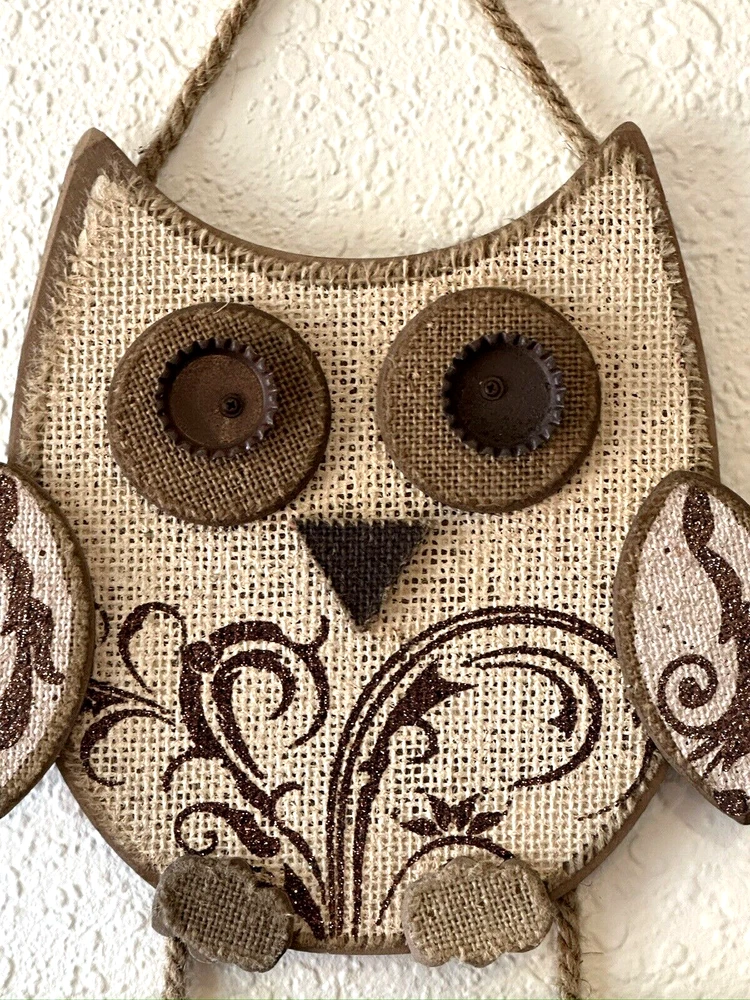 Wooden Welcome sign “Greetings” with owl decor. Floral glitter design, painted bottle cap eyes, 3D wood plaque