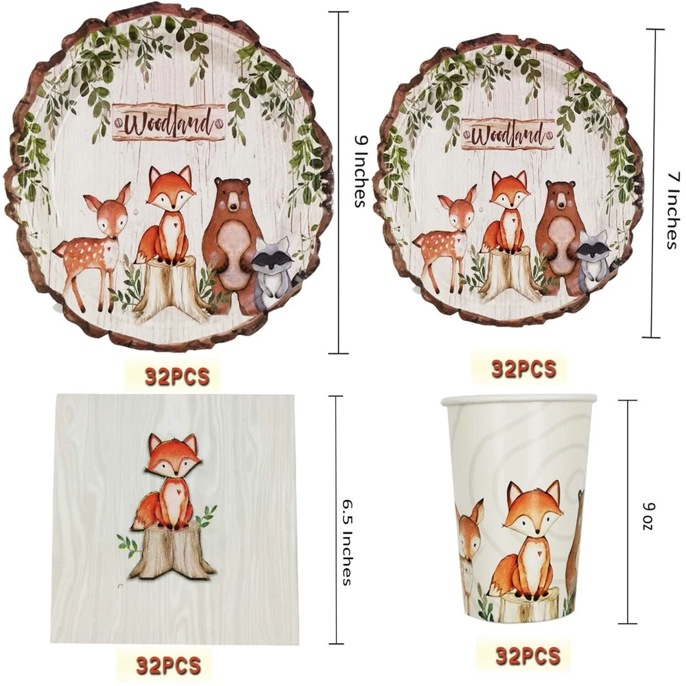 SERVE 32: This woodland creatures party decorations includes : 32 9"dinner plates + 32 7" dessert plates + 32 9oz paper cups + 32 napkins, can serves 32 guests. BIODEGRADABLE & DURABLE: Woodland creatures party supplies made of 100% food grade material BPA-free, no-toxic, biodegradable, eco-friendly, recyclable, heavy duty (350g white paperboard, thick and sturdy) won't folded, teared or broken easily, assuring paper plates party supplies set. HOLO PARTIES: The woodland creatures party decorations perfect for baby shower and animal theme birthday party. You can count on our decorative plate napkins and cup to add more elegance to your dinner table. DISPOSABLE EASY TO CLEAN: You can simply throw these out when making cleaning up after party and won't cause a environmental pollution. Save time and effortless. Let's spend more time with our family or friends. (NOTE: Do not microwave plates please.) SPLENDID SIZE FOR DINING:The woodland party supplies dinner plates measure 9” round and dessert plates measure 7" round with animal design. Paper cups hold approximately 9 oz of liquid. Napkins are 3-layer and measure 13 x 13 inches when unfolded and 6.5 x 6.5 inches folded.