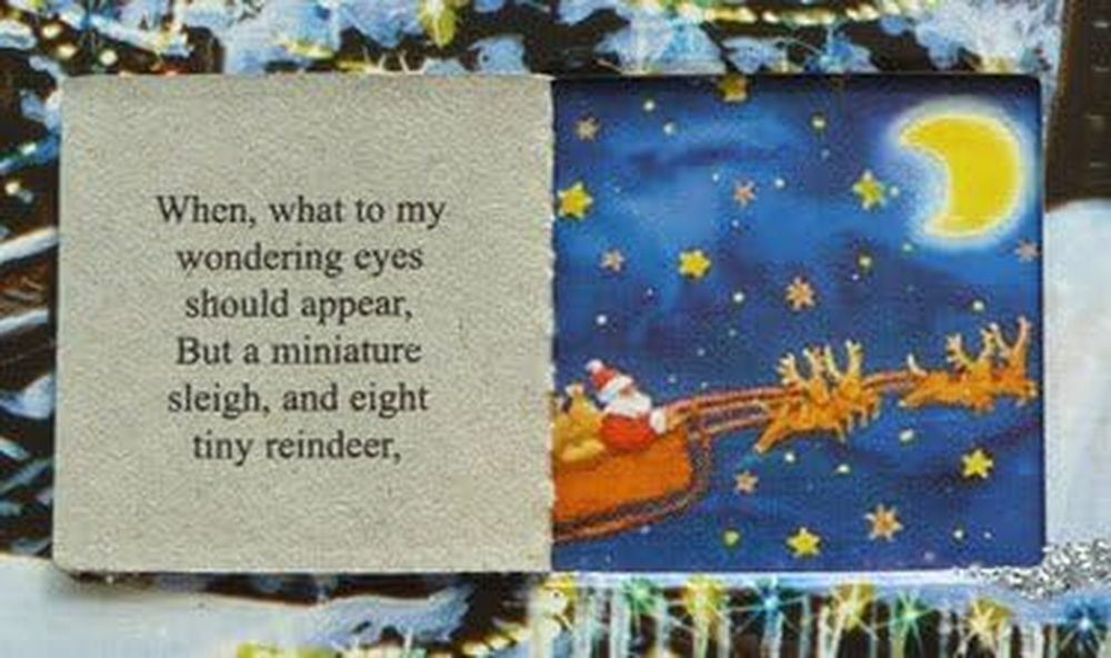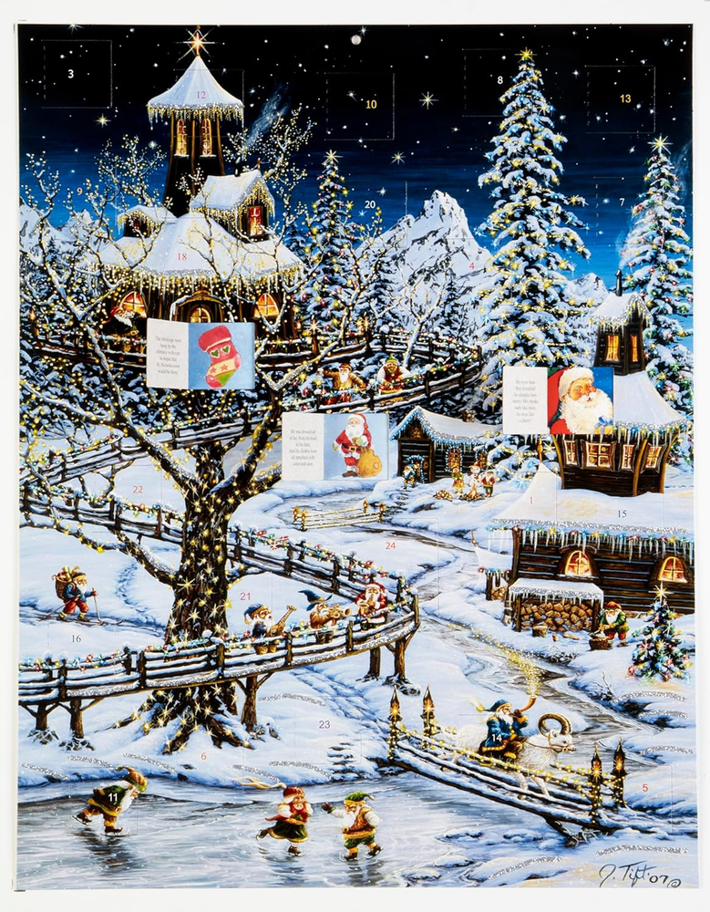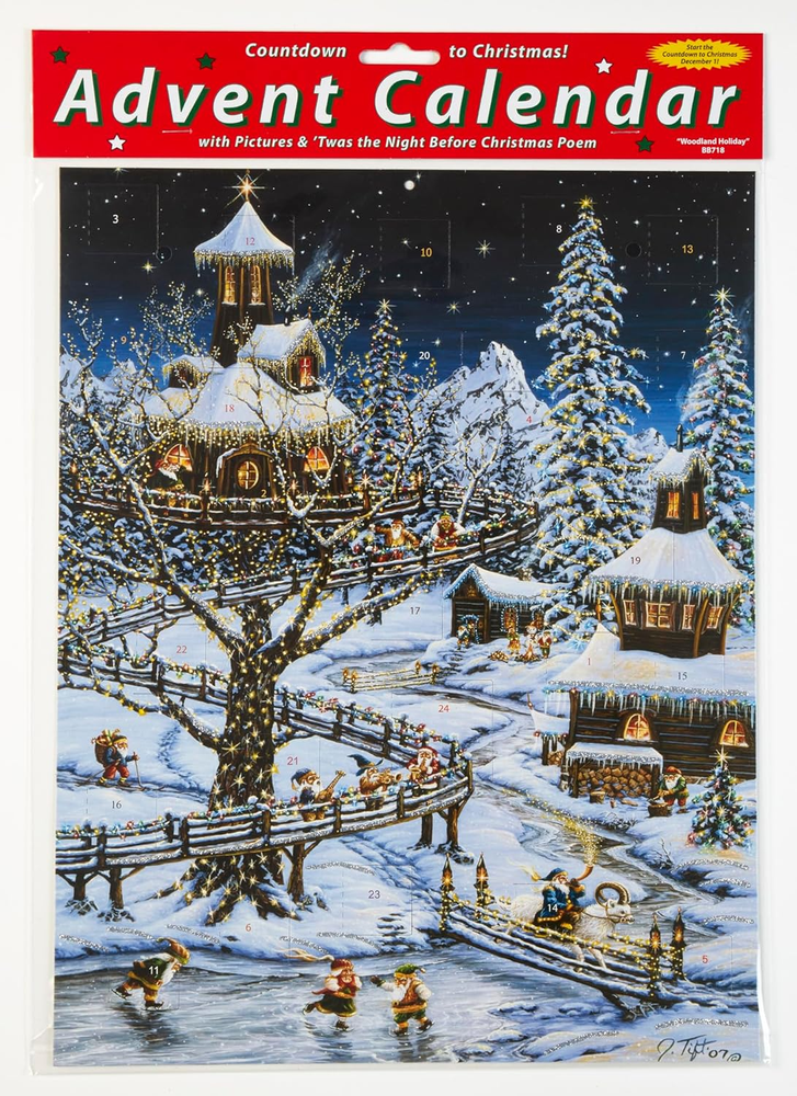 24 Windows to Open Find a Picture & Corresponding Verse from Twas the Night... Glitter on the Front A Great Family Tradition 11"x14" A cold winter night in this magical winter village! Prepare for Christmas by opening a window each day during Advent to reveal a special picture and a verse from 'Twas the Night Before Christmas . The front is accentuated with glitter. This Advent calendar measures 11"x14". Easy to hang or display anywhere!