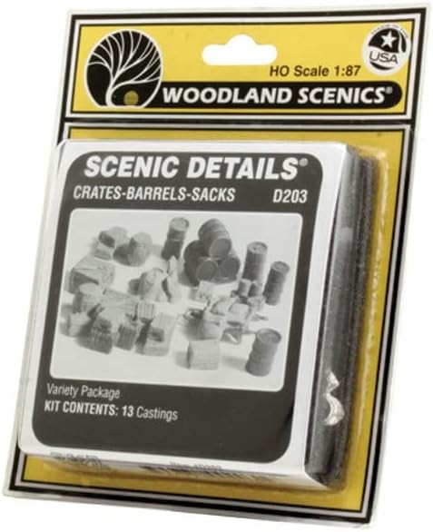 Further Details Title: Woodland Scenics HO Scale Scenic Details Crates, Barrels, and Sacks Condition: New Description: Ho Scale. Woodland Scenics Scenic Details are thoroughly researched and finely crafted HO Scale reproductions. Each kit contains highly detailed white metal castings and easy to follow instructions. Colorful dry transfer signs and accessories are included where necessary. Woodland Scenics Scenic Details are economical, easy to assemble, and fun to paint. Use Scenic Details to add color, interest, and authenticity to your layout. Use Mini-Scene Paint Set (M125) or Pewter Patina Finish (M126) to paint details. Skill level 2 Language: English Item Height: 50mm Item Width: 50mm Item Weight: 58g Age Level: 14 years and up Assembly Status: No Brand: Woodland Scenics Color: Blanco Item Length: 50mm Material: Metal Type: Scenery MPN: 785-D203 Model Railroading Supplies Missing Information? Please contact us if any details are missing and where possible we will add the information to our listing.