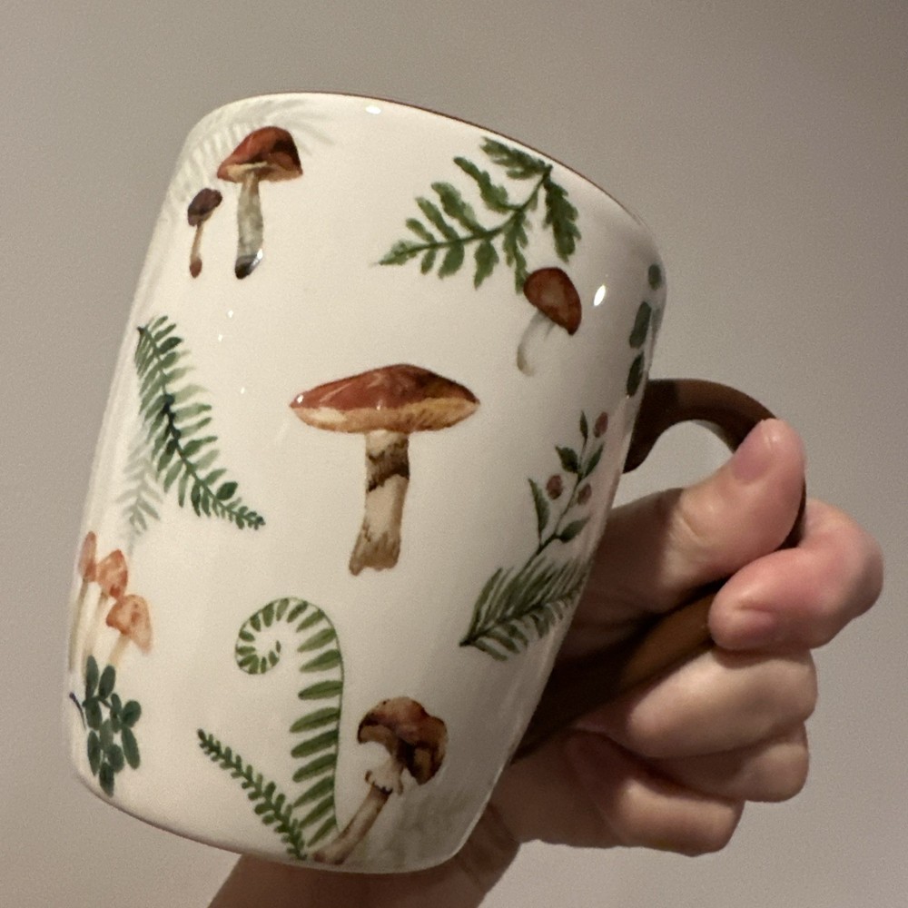 This product is a unique and charming mug featuring a brown handle with a pattern of ferns and mushrooms, perfect for enjoying coffee, tea, or hot chocolate in a whimsical woodland setting. The brown color adds a rustic touch to the design, making it a delightful and functional piece of decorative cookware for your kitchen or dining area. 12-14oz