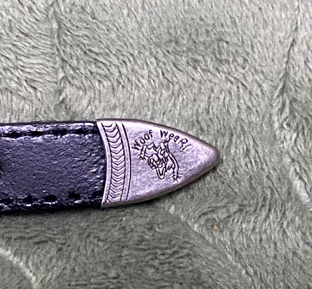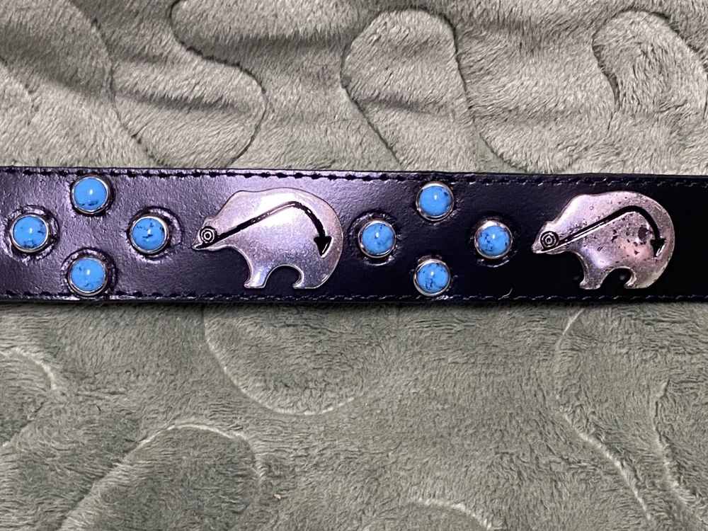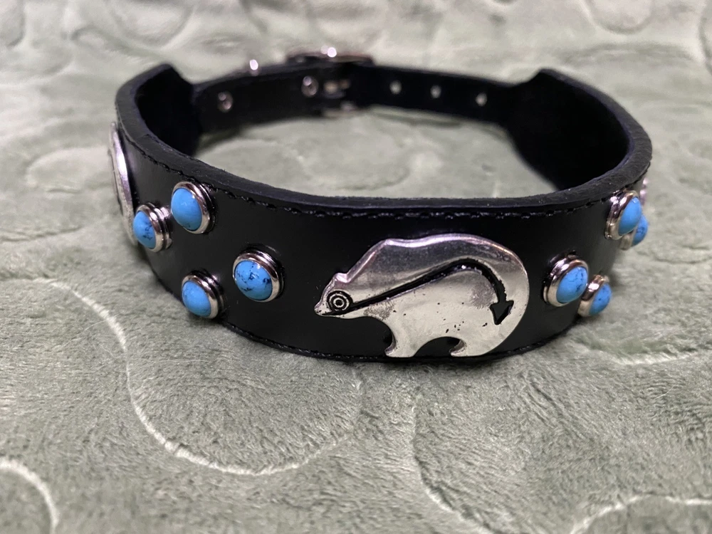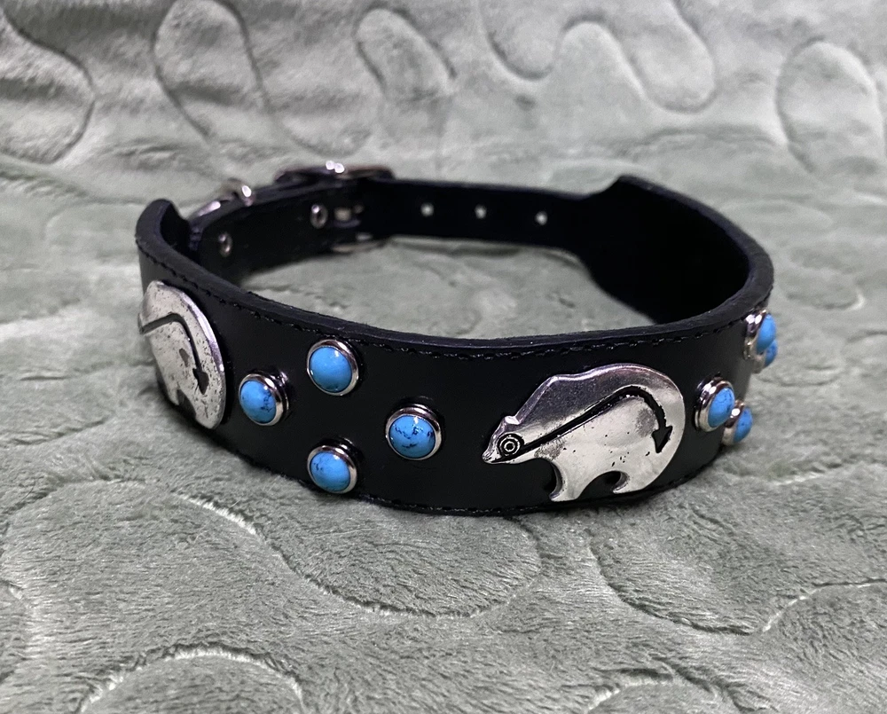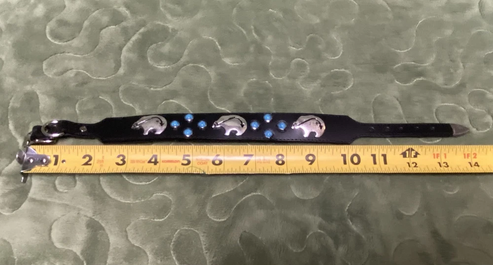 Woof Wear Dog Collar ——- 1” wide 14” long ——- Black Leather Turquoise Silver Tone Bear Design ——- Southwest style, New Mexico ——- Gently used, no signs of wear.