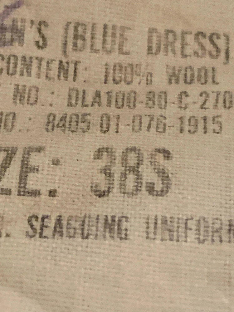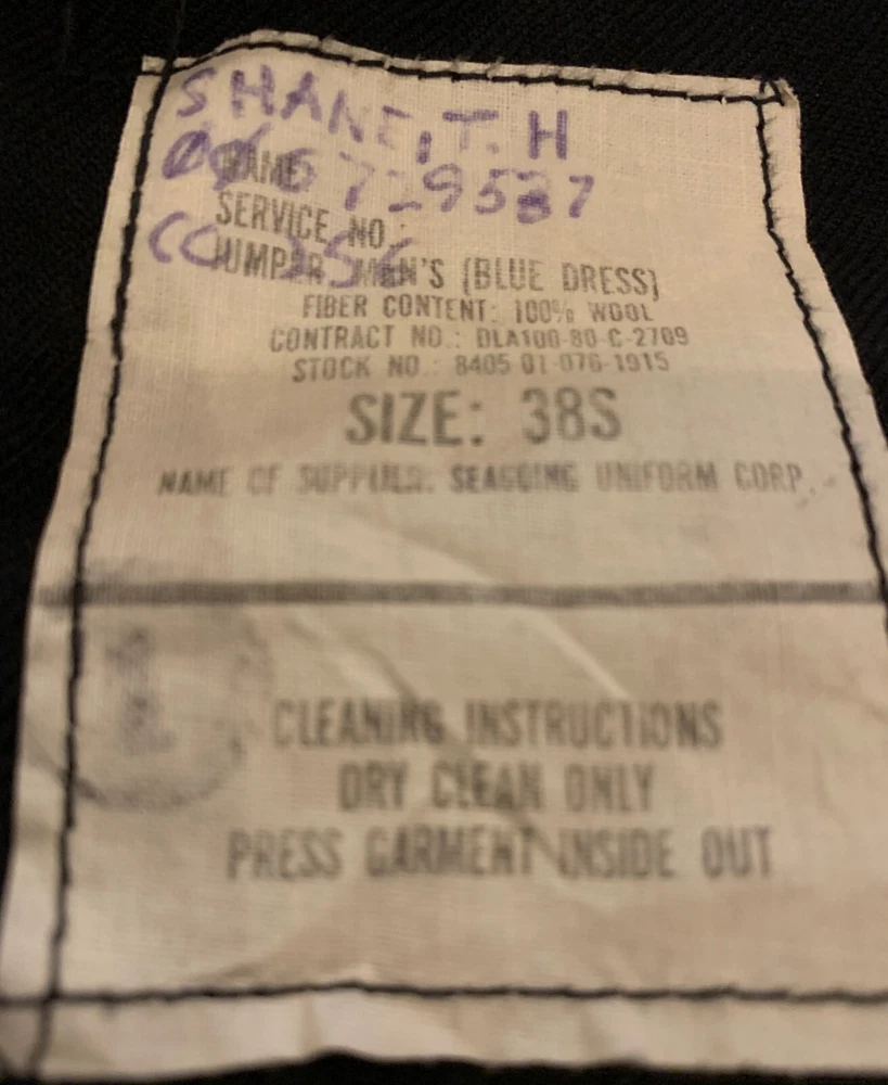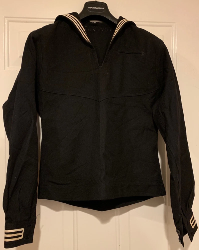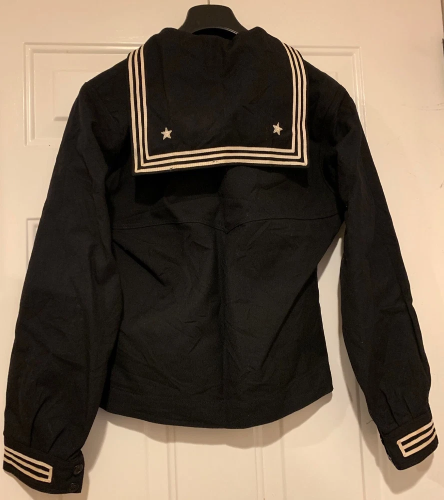 The product is a Wool Sailor Uniform Jumper for men, in Navy Blue color and size 38 S. It is an original item produced by Seagoing Uniform Corp in the United States. The uniform is themed around militaria and is designed for sea-going activities.