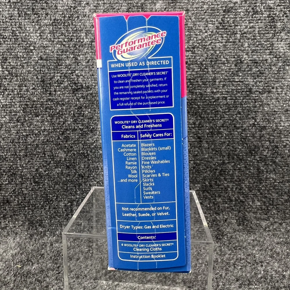 New in Box, Woolite Dry Clean at Home Dry Cleaner's Secret the box contains 6 Cleaning Cloths which it says is good for cleaning up to 24 garments at home in your dryer. (NOT for use on fur, leather, suede or velvet). Please refer to the pictures for further.