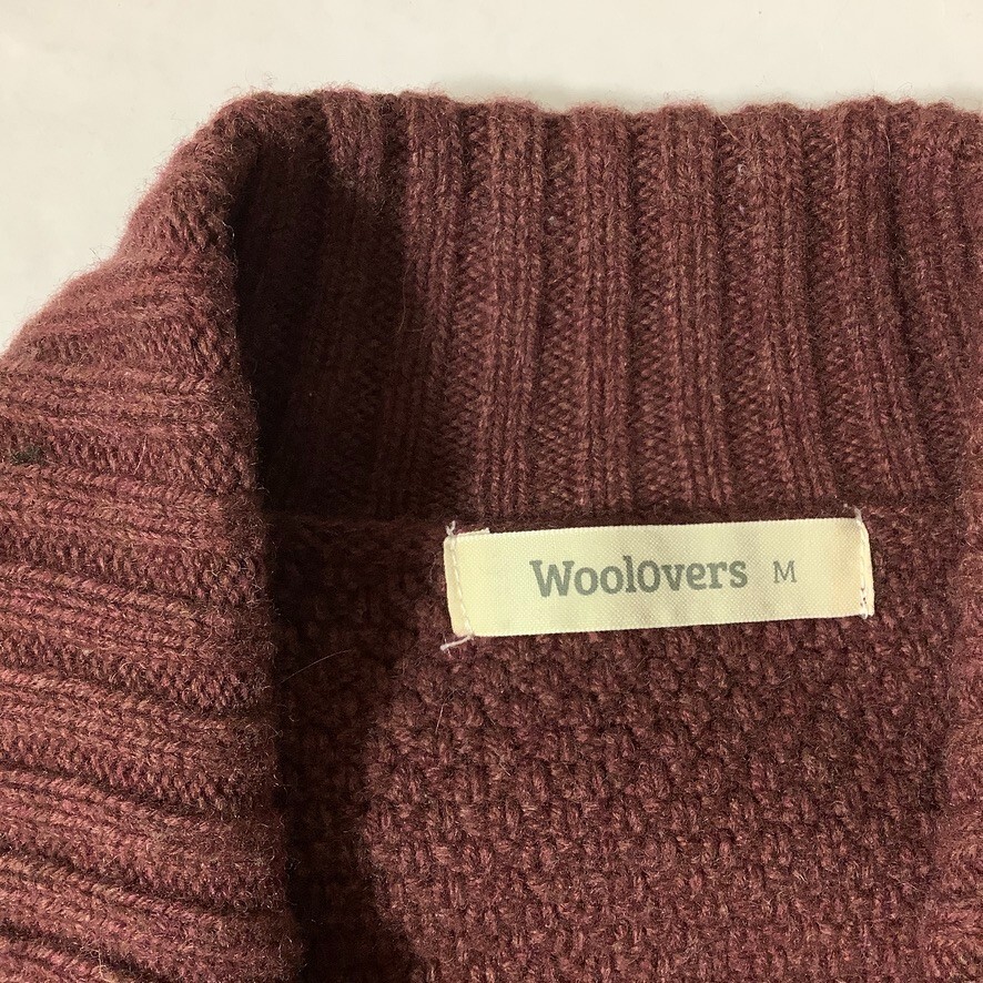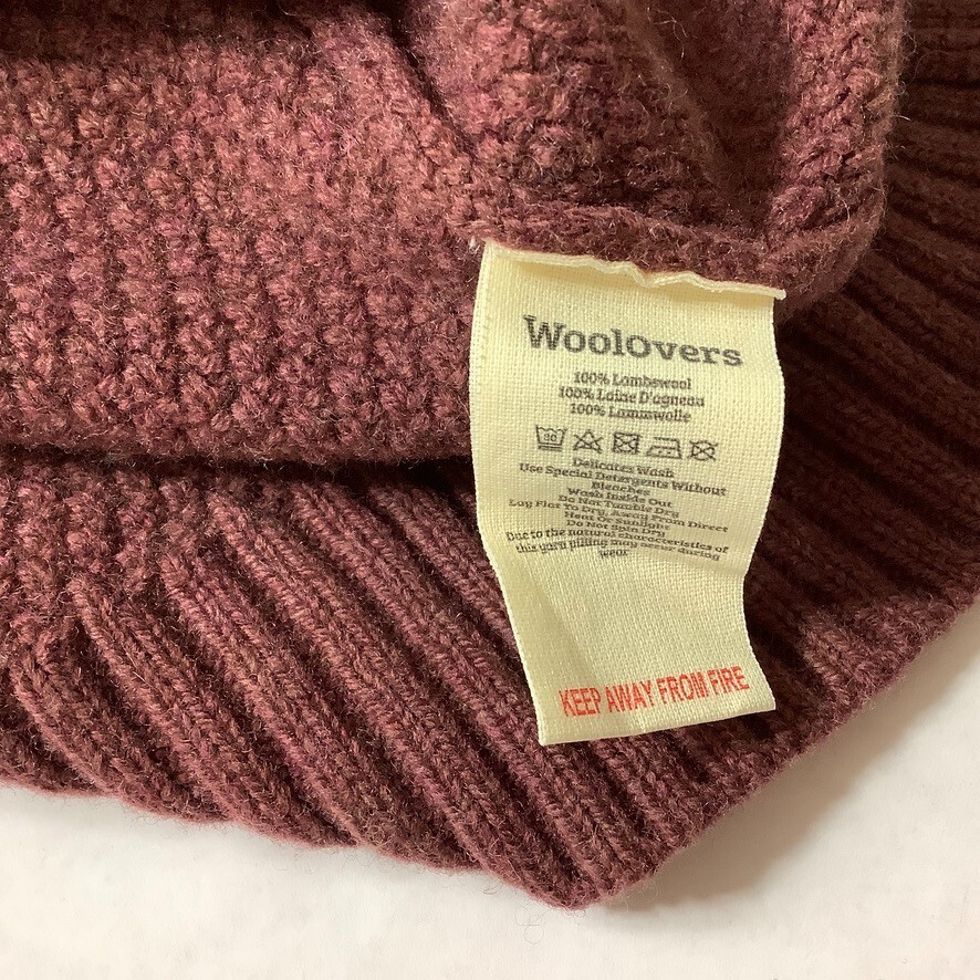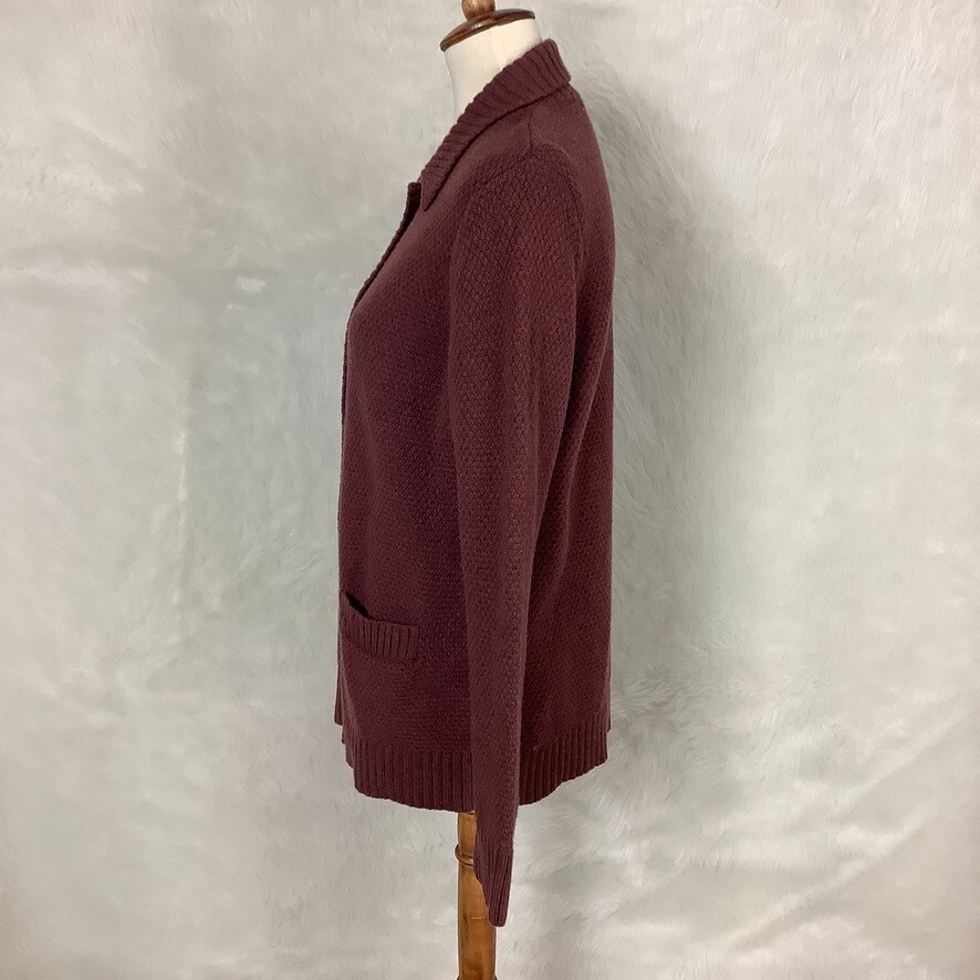 This is a reddish brown, ribbed collar, waffle knit, button front, long sleeve 100% lambs wool knit, cardigan sweater from Woolovers. No flaws. For reference the mannequin is a size 6-8 with measurements of: 34 in 26 in 35 in. Fall, winter, coastal, layering. Approx. measurements all un-stretched: 19 in armpit to armpit 25.5 in length (10513)
