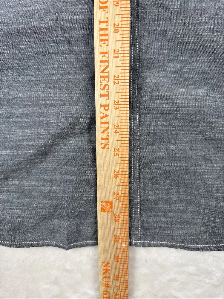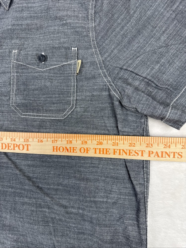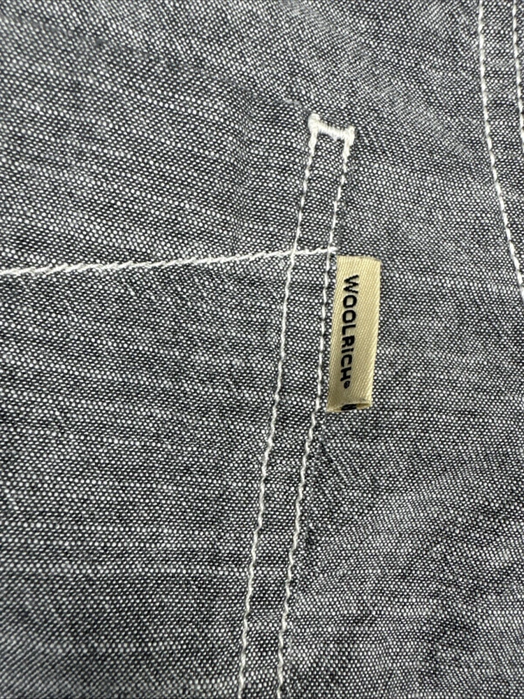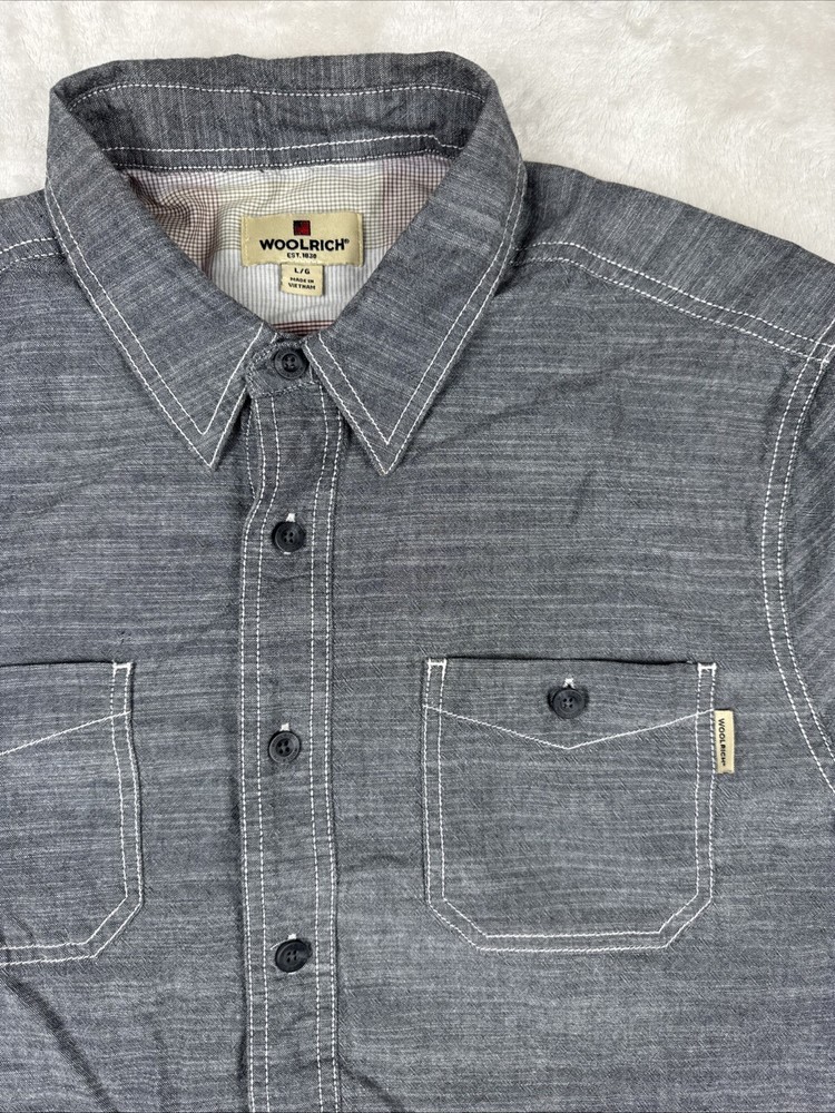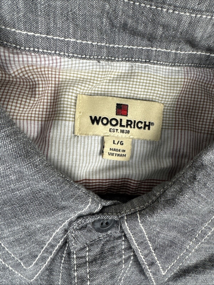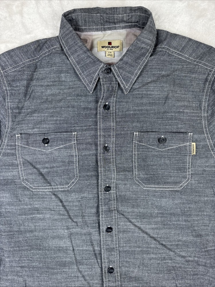 This is a Woolrich men's shirt in size large, featuring a gray chambray fabric with a button-up closure and a collared neckline. It has short sleeves, a regular fit, and a classic point collar style. The shirt is lightweight and suitable for all seasons, with a sportsman model design and outdoor theme. It includes pockets and is ideal for casual or party/cocktail occasions.