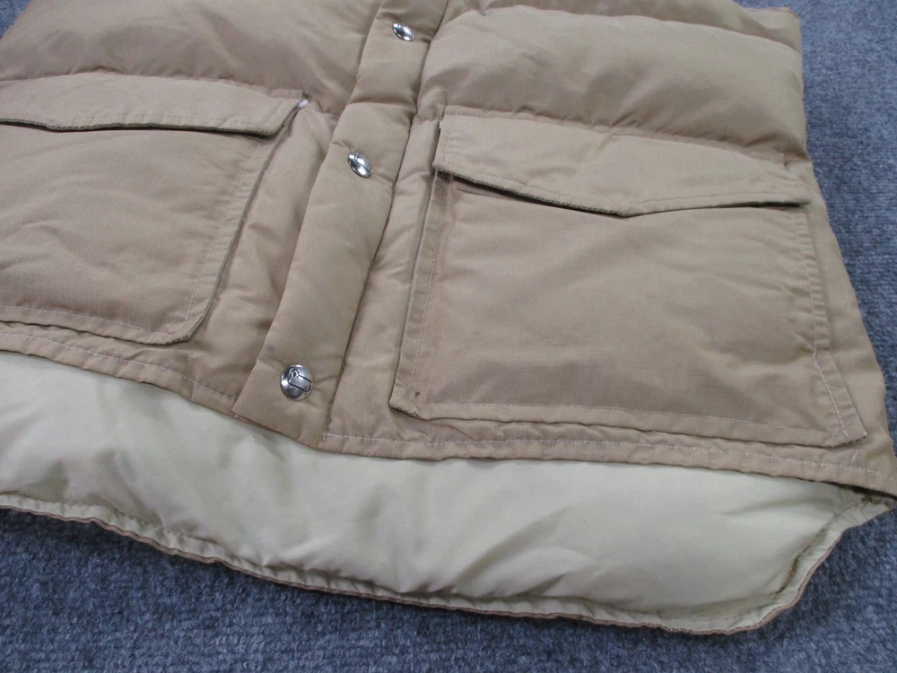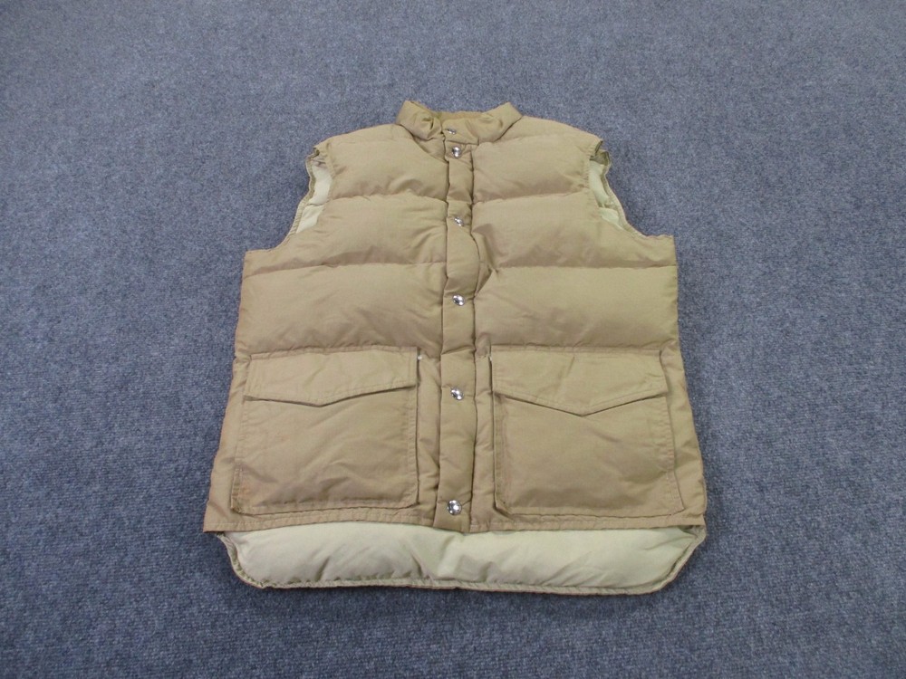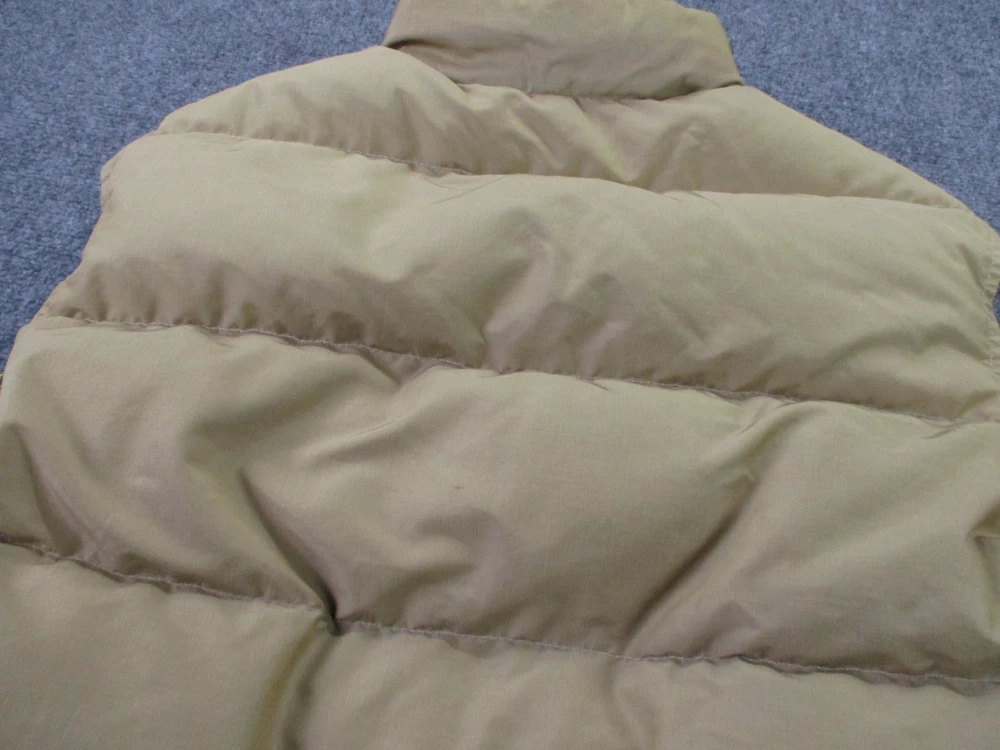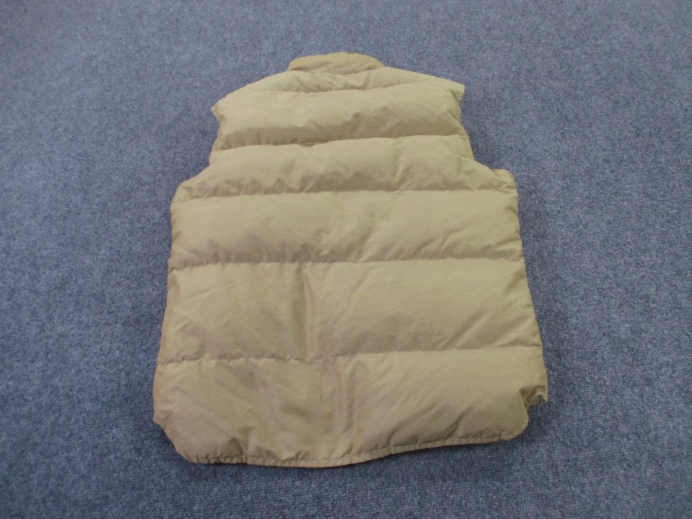 Accents: Logo Pattern: Solid Insulation Material: Down Size Type: Regular Closure: Zip Type: Vest Outer Shell Material: Polyester Lining Material: Nylon Theme: Outdoor Fabric Type: Microfiber Brand: Woolrich Size: L Color: Beige Department: Men Performance/Activity: Hiking Features: Full Zip, Insulated, Pockets, Water Resistant, Weathergear, Wind-Resistant Style: Puffer Jacket Jacket/Coat Length: Mid-Length Fit: Regular