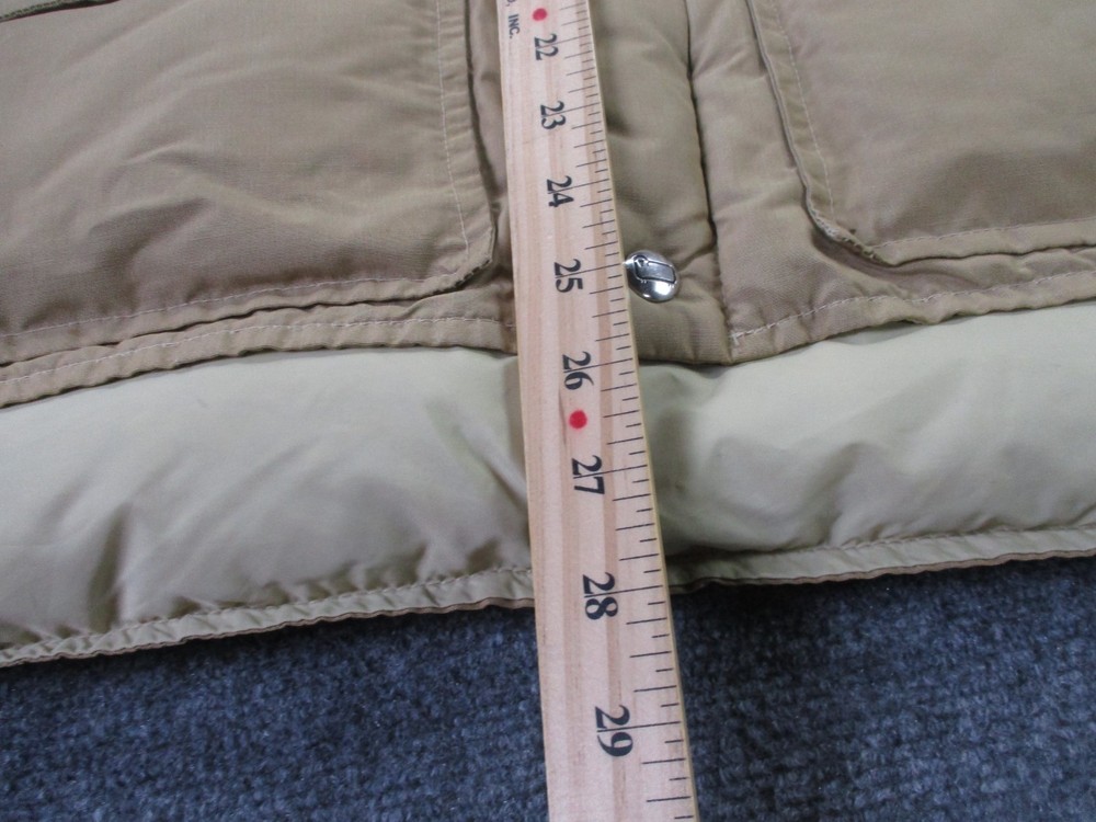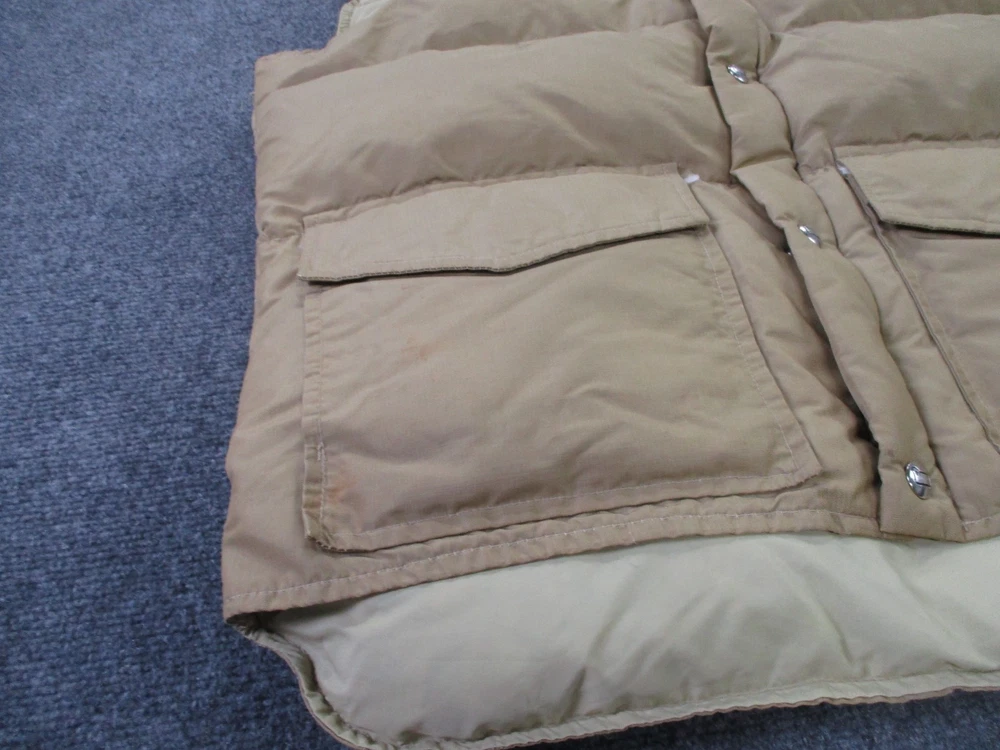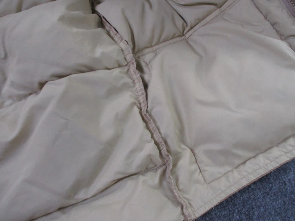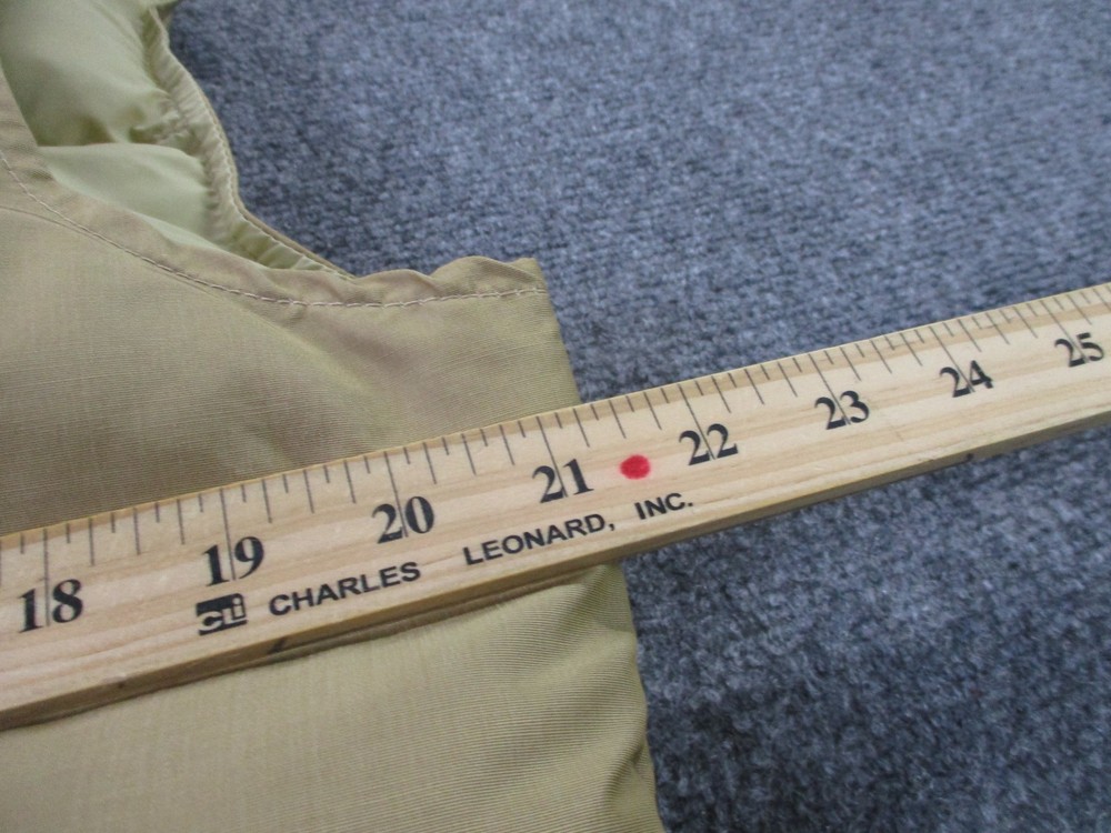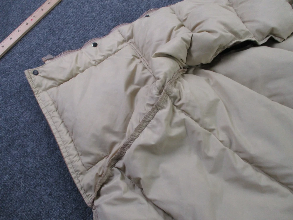 Accents: Logo Pattern: Solid Insulation Material: Down Size Type: Regular Closure: Zip Type: Vest Outer Shell Material: Polyester Lining Material: Nylon Theme: Outdoor Fabric Type: Microfiber Brand: Woolrich Size: L Color: Beige Department: Men Performance/Activity: Hiking Features: Full Zip, Insulated, Pockets, Water Resistant, Weathergear, Wind-Resistant Style: Puffer Jacket Jacket/Coat Length: Mid-Length Fit: Regular