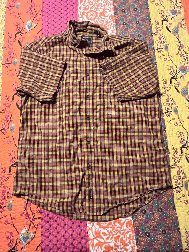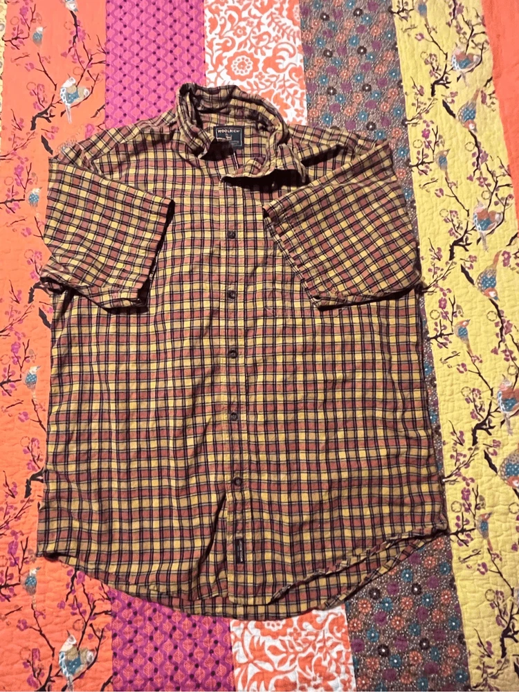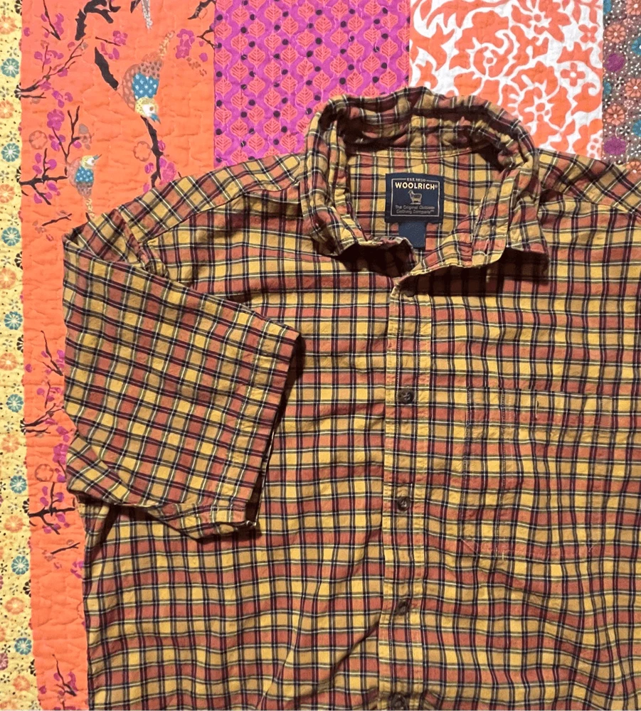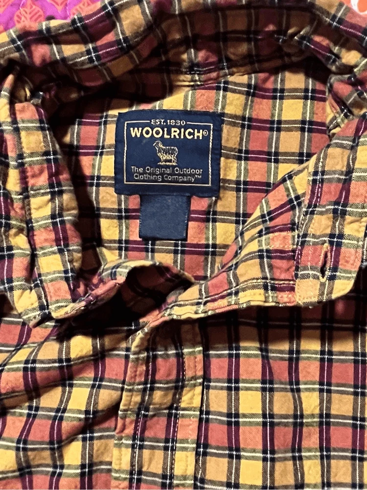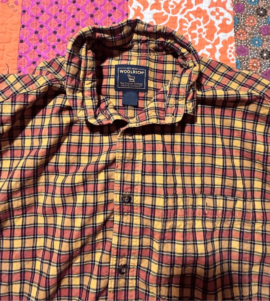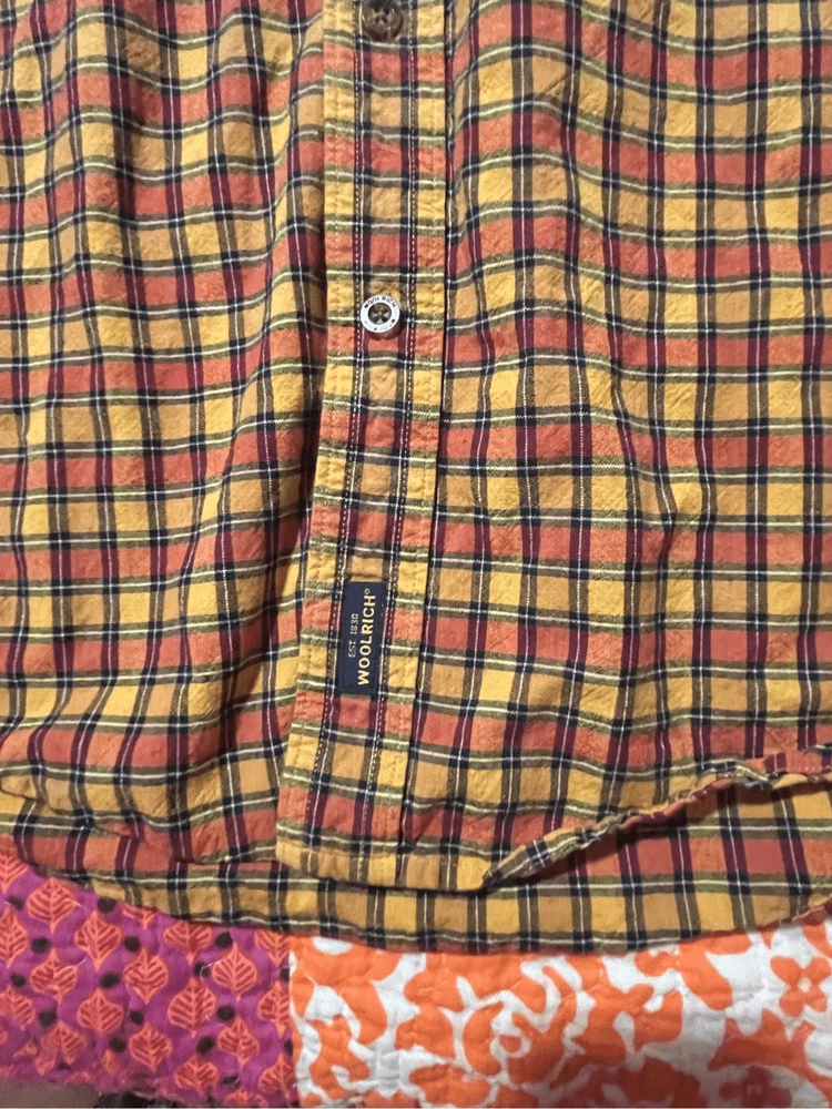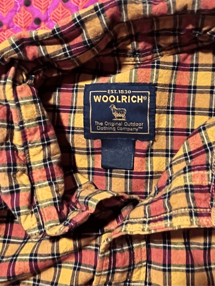 Woolrich Mens shirt. Size large. Collared, button up orange check. Small square black, orange and yellows. One pocket in front. 100% cotton. Made in India. #6671. Lovely shirt, no stains, tears, or rips. All season.