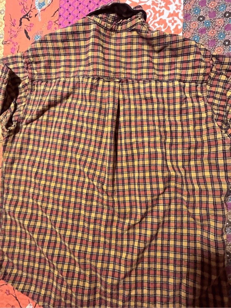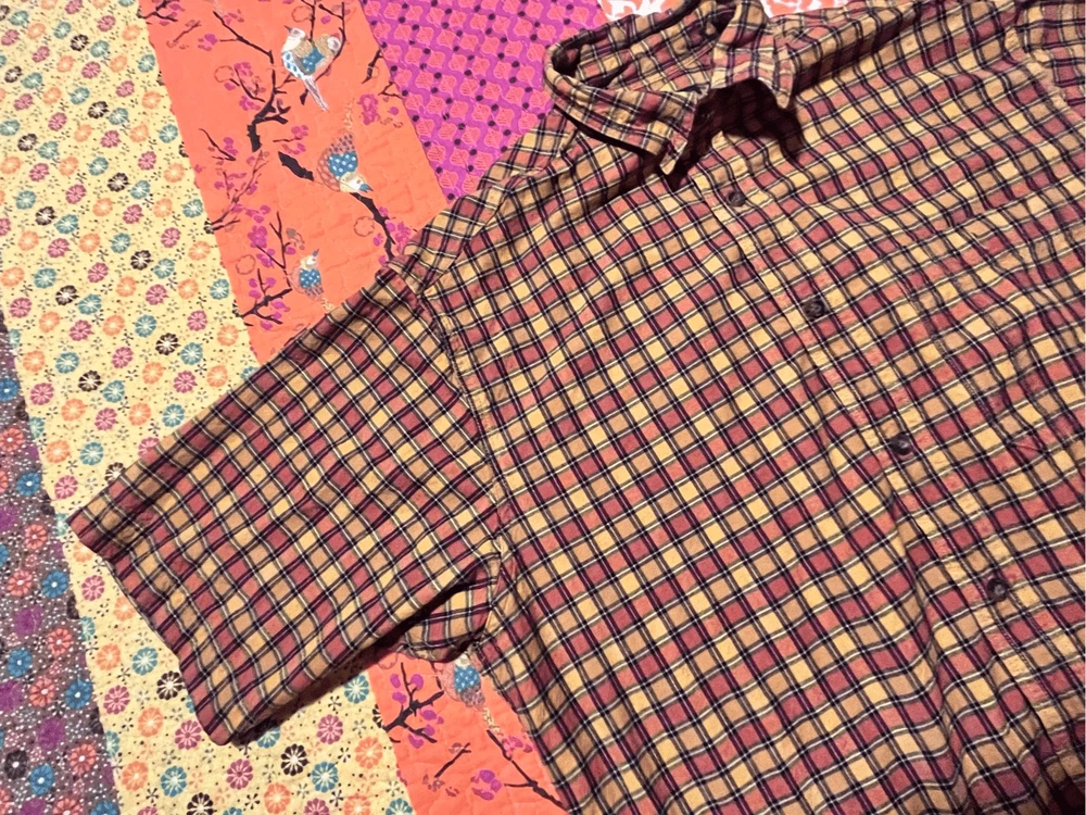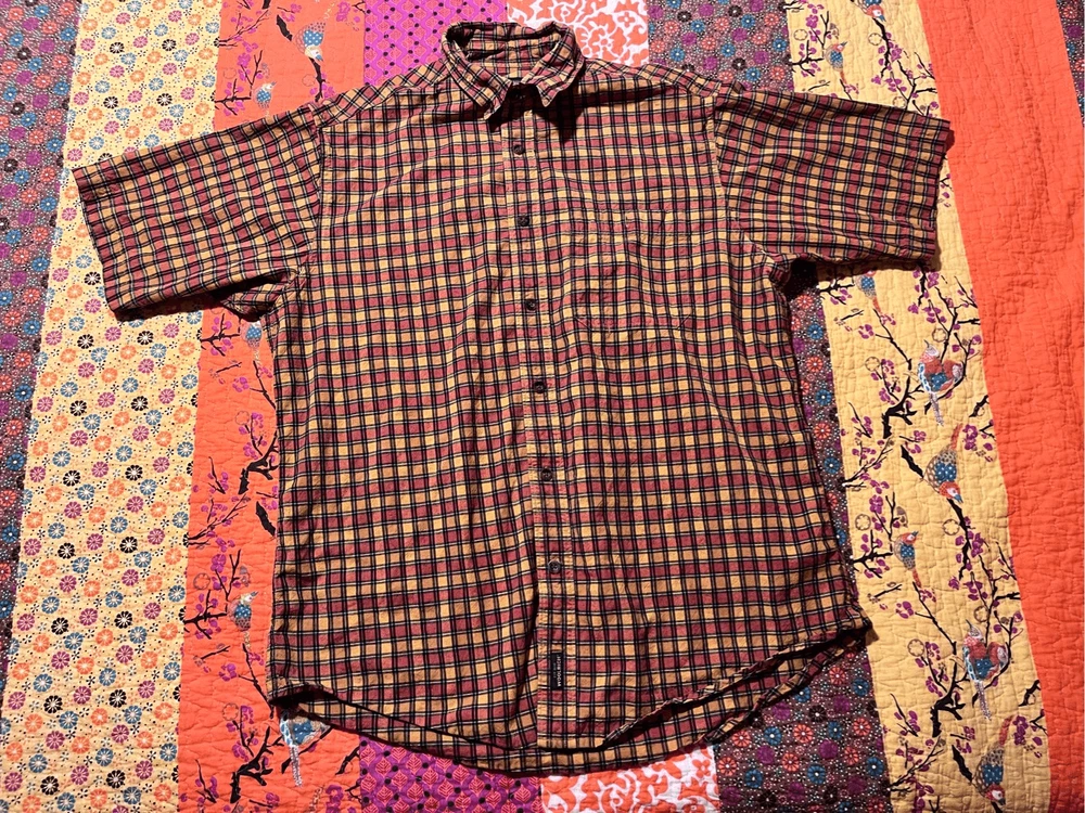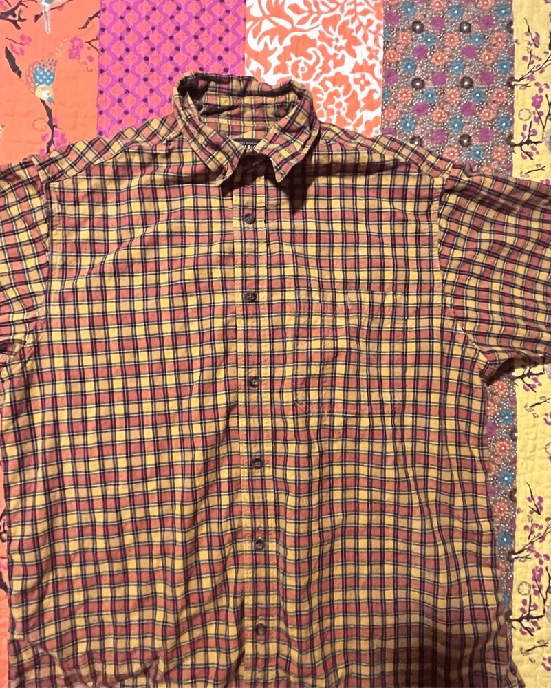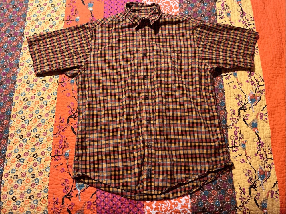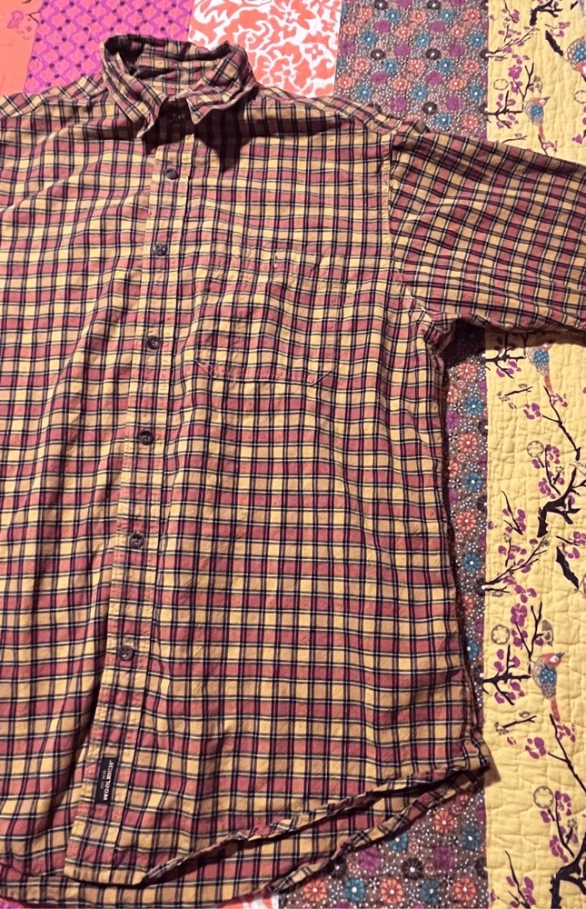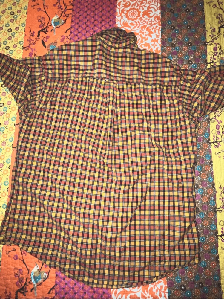 Woolrich Mens shirt. Size large. Collared, button up orange check. Small square black, orange and yellows. One pocket in front. 100% cotton. Made in India. #6671. Lovely shirt, no stains, tears, or rips. All season.