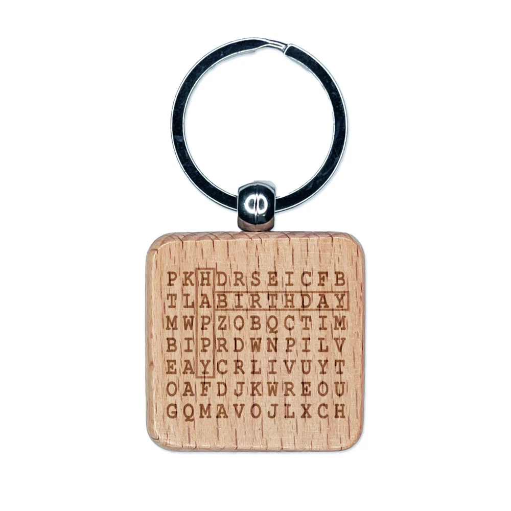 Word Search Birthday Engraved Wood Square Keychain Tag Charm