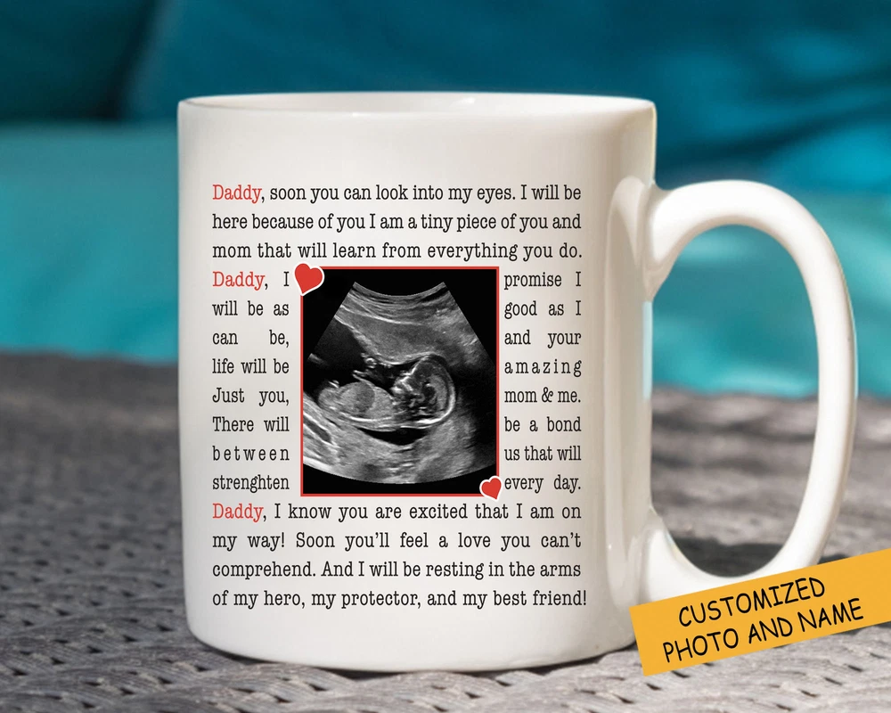 Words Mug And Love From The Bump Personalized Mug Ultrasound Mug 1st Fathers Day Product Details.. This high quality 11oz. ceramic white mug has a premium hard coat that provides crisp and vibrant color reproduction sure to last for years. Perfect for all hot & cold beverages. The highest quality printing possible is used. It will never fade no matter how many times you wash it. Material: 100% Ceramic. Print both sides. Dishwasher and Microwave Safe. High Gloss + Premium White Finish. Printed in the U.S.A. Personalized & Custom. We support personalized and custom mug to add custom, when placing an order, you can add notes to the "order note" in shipping address section. Also you can contact us directly via message. Shipping Info. Ready to ship in 1 to 2 business days, All products are made-to-order and proudly printed in the United States. Shipped by USPS and DHL, You will receive your order in 5-7 days. Replace & Refund. All products are defective during shipping broken, chipped will be replaced free of charge. You are not satisfied with the product, we will refund 100% money to you. If any other issues arise, please do not hesitate to message, we would be more than happy to assist you.