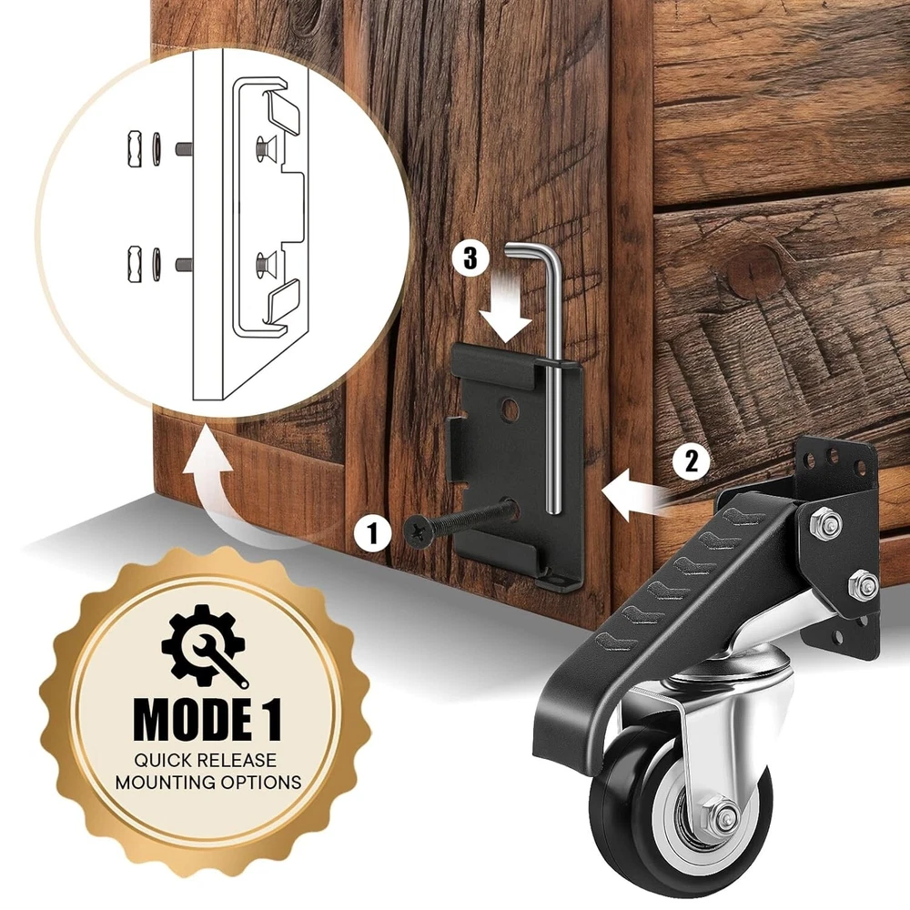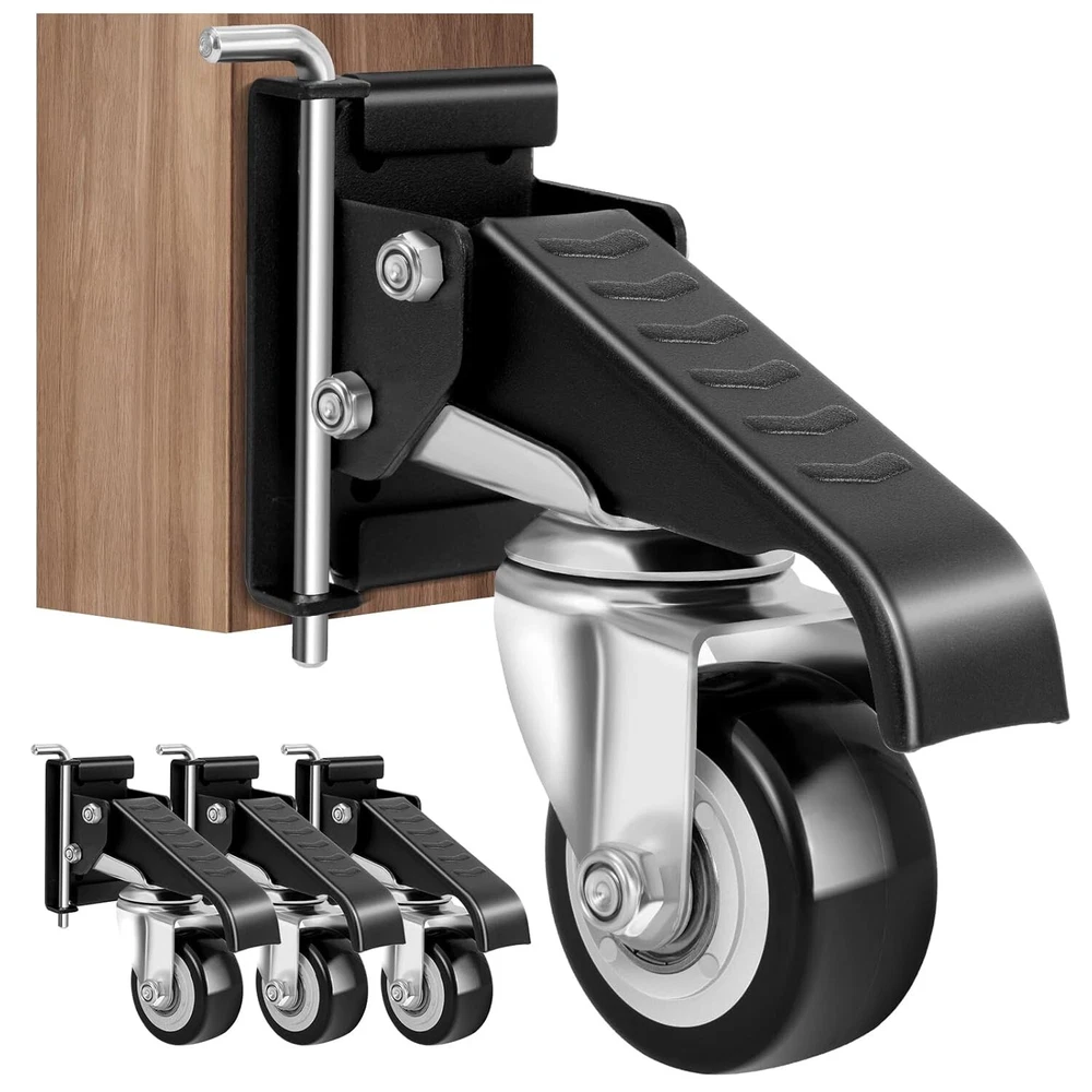 SPACECARE Workbench Casters kit 600Lbs Heavy Duty Quick Release 2 Mounting Options Retractable Workbench Stepdown Caster Wheels Adjustable Polyurethane Durable Steel Construction (Set of 4) 【Upgraded Workbench Caster】 - The heavy duty casters, constructed with durable solid steel and premium urethanecasters, which can move smoothly and easily support up to 600 lbs per set. The wear-resistant workbench casters can work smoothly and steadily for heavy duty workbenches tables and equipments. 【2 Installation Method】- The first method: Attach the quick-release plate to workbench legs, then push the mounting plate into the quick-release plate and insert the locking pin to fix the whole workbench caster. For this method, the retractable casters can be taken down whenever you want especially for the occasion you don't need to move workbench. The final method: As for normal installation, simply attach the mounting plate to workbench legs and assemble casters. 【Retractable Casters】: Step on the retractable pedal then lift the workbench to the fixed height. Pay attention not to step on the edge of outer side, just put your foot at the middle point of pedal. The workbench casters cannot work on rocky road, but caster wheels works well on smooth road. 【360-Degree Casters】- The workbench casters equiped with 360-degree swivel bracket, the casters wheels can turn to any directions. Move the workbench, table, cabinet and equipment to the destination more easily and flexibly. 【Complete Equipment】- The workbench casters include Four 2-1/2" swivel urethane casters, 24 mounting screws, 4 mountingbolts 1 wrench and a full instruction. The quick and installation lays the foundation for your moving object.