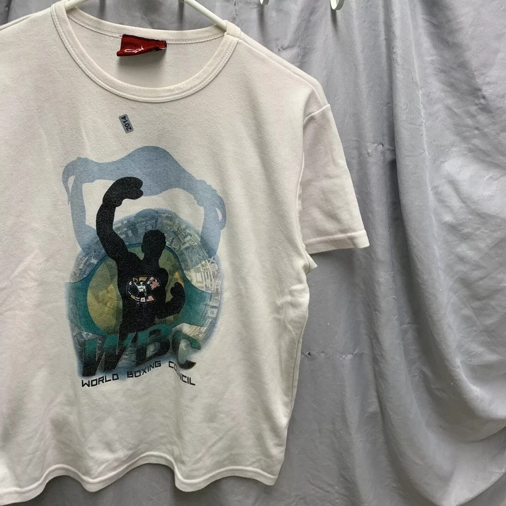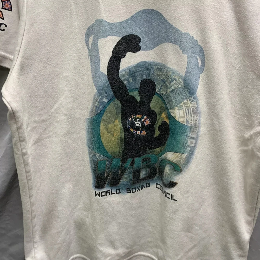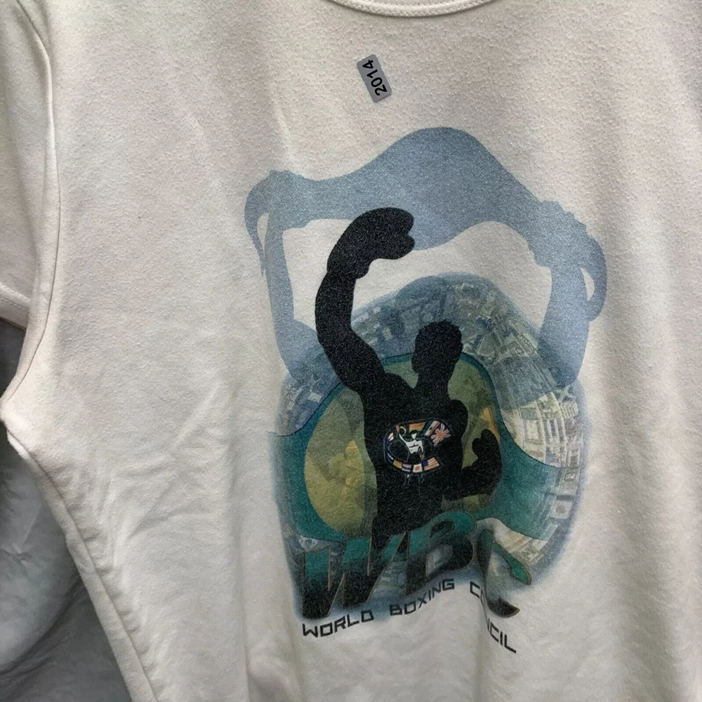 This vintage World Boxing Council t-shirt is a must-have for any 90s enthusiast. Featuring a graphic print of a blue character, this white cotton and cotton blend shirt has a crew neck and short sleeves. The shirt is preshrunk, lightweight, and has a double-sided stretch for all seasons. It also features an adjustable full zip and hood for added comfort. The shirt is a limited edition, with a button and embroidered logo accent. This shirt is perfect for anyone who loves boxing or wants to add a unique piece to their wardrobe. It is a regular fit and comes in size large. The shirt was manufactured in the United States in the 1990s and is a part of the Friends and Free! character family.