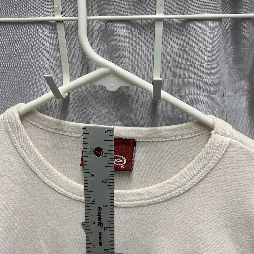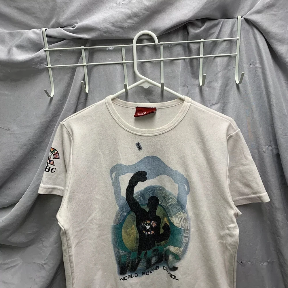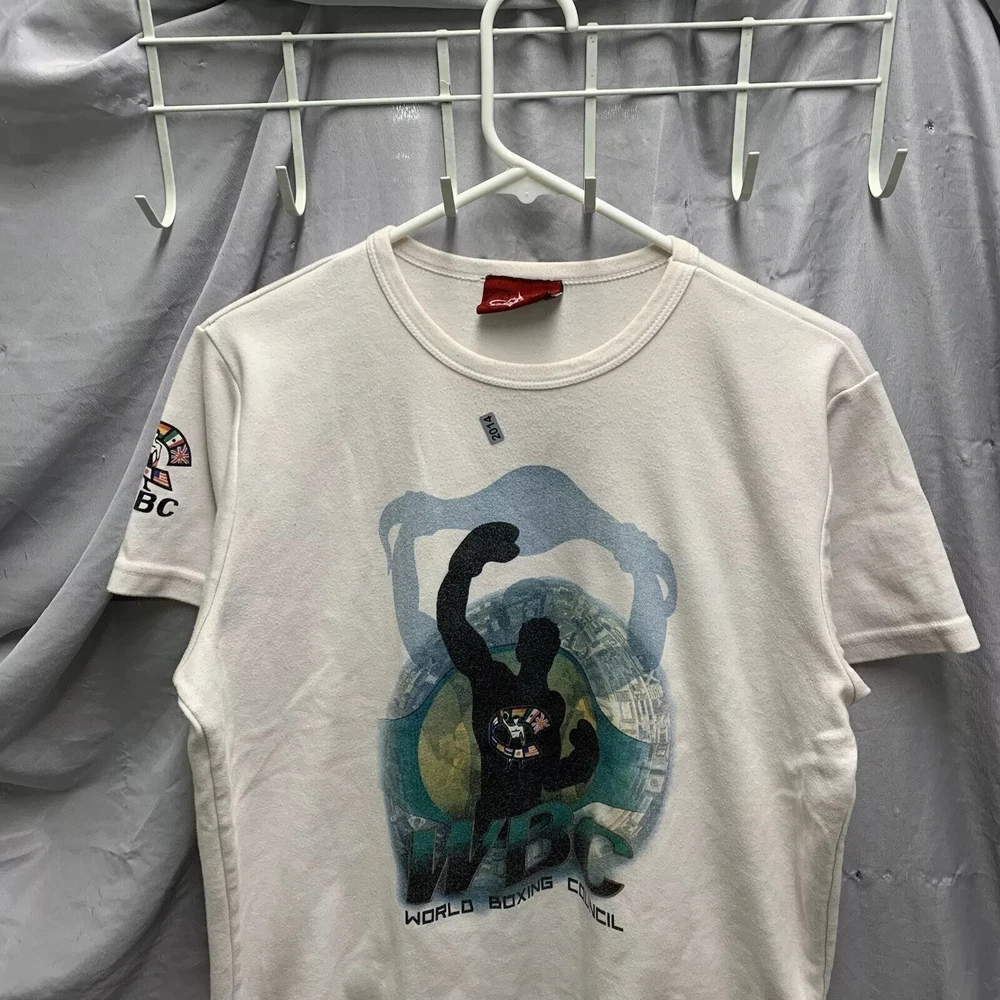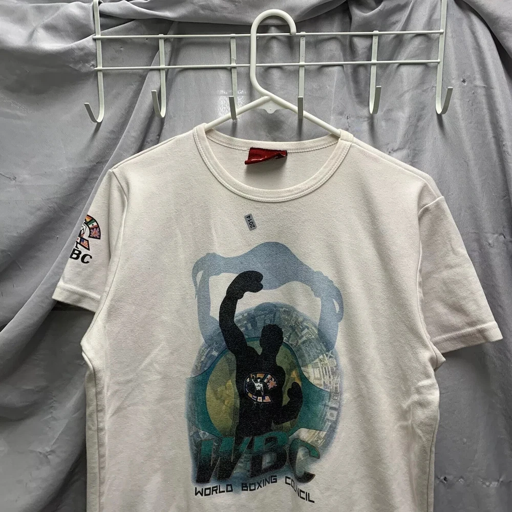 This vintage World Boxing Council t-shirt is a must-have for any 90s enthusiast. Featuring a graphic print of a blue character, this white cotton and cotton blend shirt has a crew neck and short sleeves. The shirt is preshrunk, lightweight, and has a double-sided stretch for all seasons. It also features an adjustable full zip and hood for added comfort. The shirt is a limited edition, with a button and embroidered logo accent. This shirt is perfect for anyone who loves boxing or wants to add a unique piece to their wardrobe. It is a regular fit and comes in size large. The shirt was manufactured in the United States in the 1990s and is a part of the Friends and Free! character family.