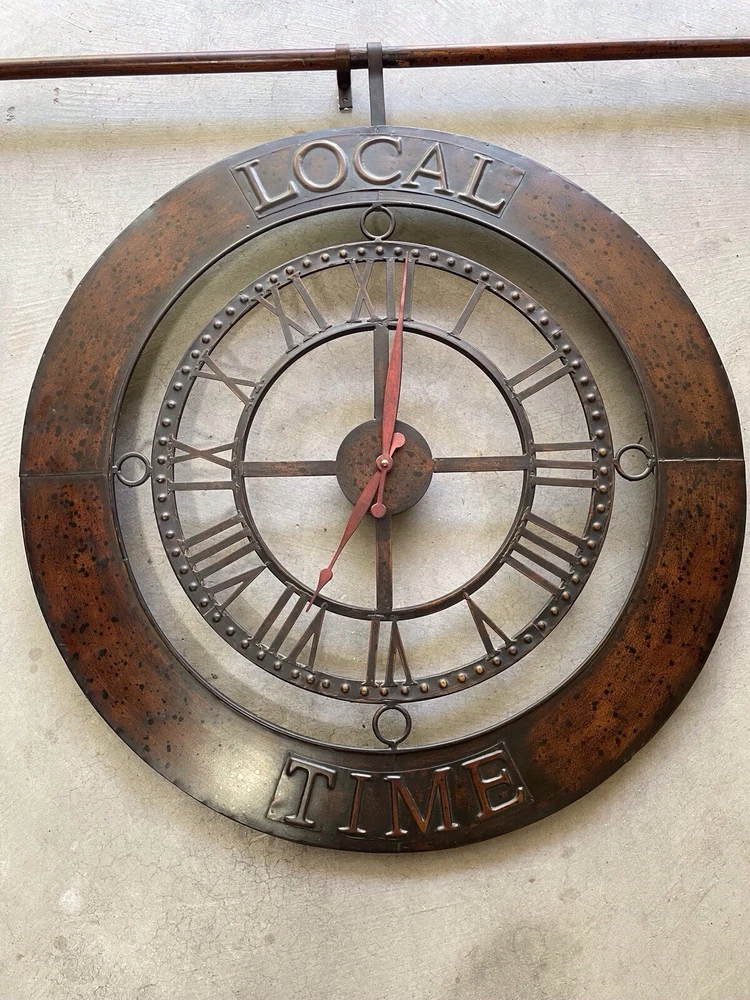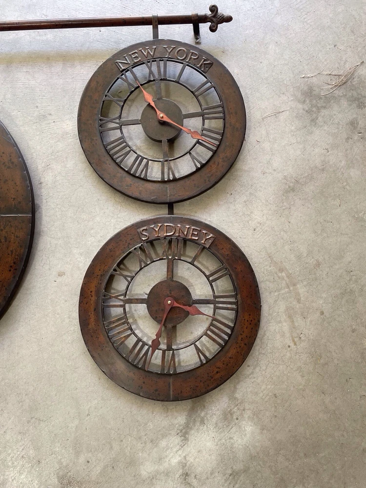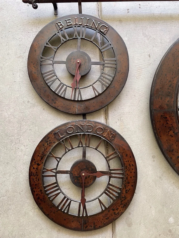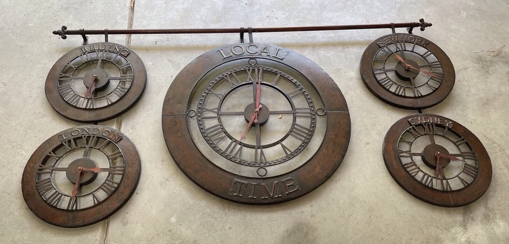 This stunning Hanging Wall Clock is a must-have for any home décor enthusiast. With its hand-forged metal frame and intricate design, this clock will add a touch of elegance to any room. The clock features Quartz movement and is battery-powered, ensuring accurate timekeeping for years to come. The is one large clock at the center and 4 smaller clocks. In addition to its practical function, this clock is also a work of art, with its world time zones and beautiful brown color. The clock is perfect for any room in the house and will make a great addition to any collection. With its timeless design and high-quality construction, this Hanging Wall Clock is sure to impress.