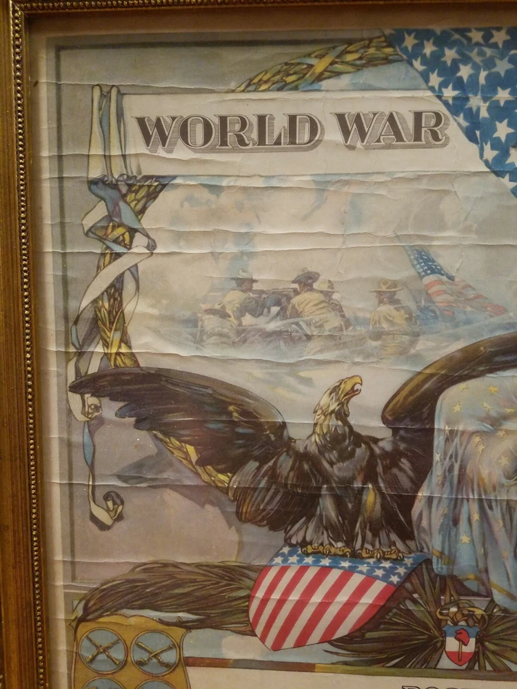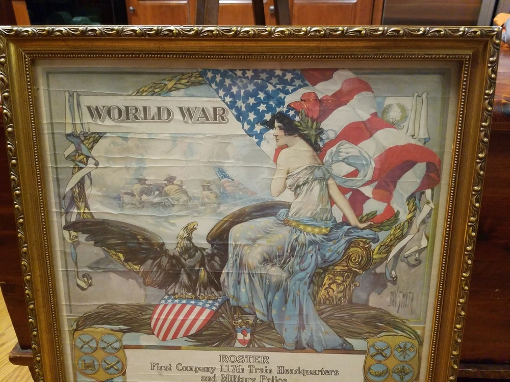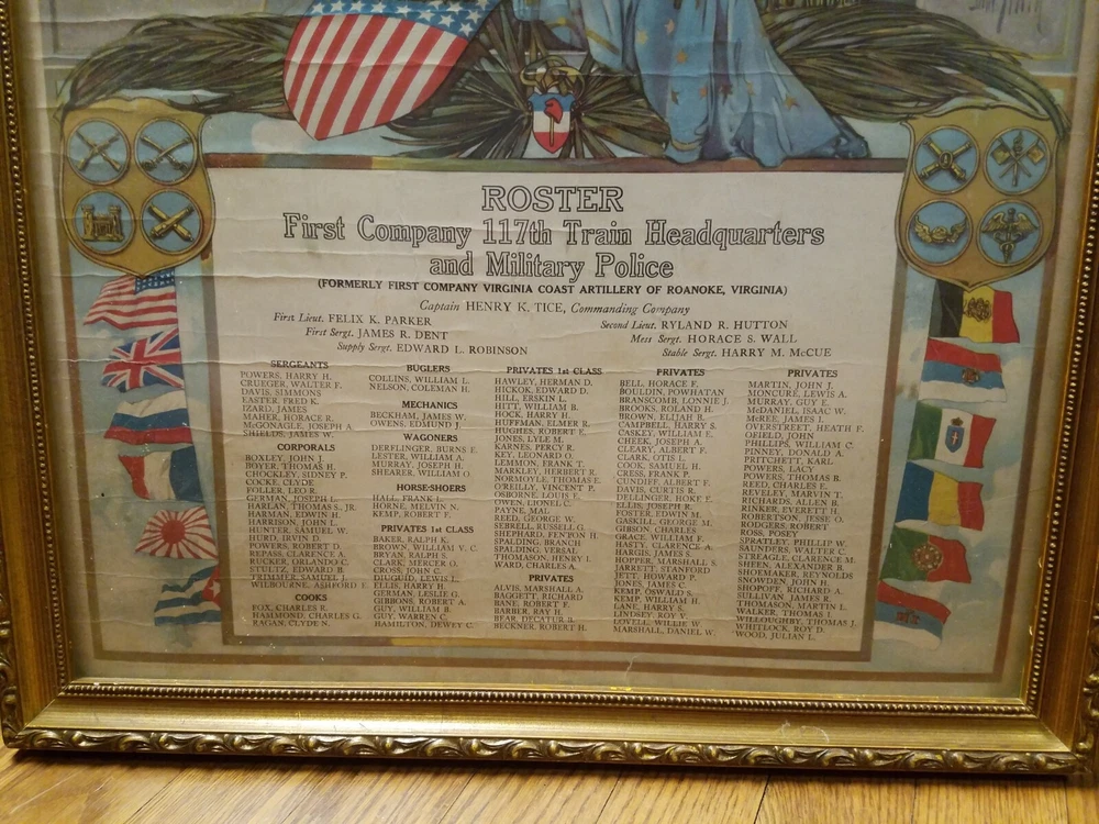 Up for sale is a professionally frame World War I Roster Poster. Poster measures approx. 16"x21" Frame measures approx. 18.5"x 23.5" First Company 117th Train Headquarters and Military Police (Formerly First Company Virginia Coast Artillery of Roanoke, Virginia) Wonderful color. Illustrated Postal Card Co. NY Plexiglass cover, not glass. Please see pictures. Please note that lately USPS's shipping transit times have been severely delayed. If this is a potential issue please do not purchase. eBay determines shipping cost based on actual dimensions input for item.
