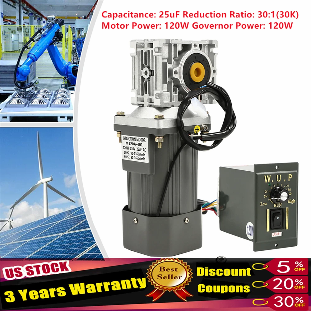 Worm Gear Motor 120W AC 110V Speed Controller Industrial Gearbox Electric RV30 120W Worm Gear Reducer Gearbox Electric RV30 Worm Gear Motor High Torque 110V Worm Gear Motor 120W AC 110V Speed Controller Industrial Description This is an AC 110V worm gear motor with 120W power, which can achieve the 1650rpm speed. It uses pure copper coils and allows for low-noise&powerful working, making it suitable for homes, handcrafts, school projects, and most other products you want. You can turn the speed control knob to adjust the motor speed, realizing the desired effect. It is a great helper in many scenarios and work environments. Key Features Build to Last: Our product is made of high-quality alloy aluminum, copper, alloy steel, steel sheet, iron, etc., and adopts a nitriding process for the metal parts, making it characterized by heat resistance , high quality, and long service life. Stable Operation: All metal gears, double ball bearings, and pure copper coils can reduce friction and temperature during use to ensure stable operation. High-quality double-ball bearings can reduce the friction between the rollers and bearings, resulting in higher rotational speeds, less overheating, and higher load resistance . Safe to Use: It has the functions of self-locking and automatic shutdown when power is off, ensuring your safety to the most extent during use. Reversing Function: It has a reversing function that is flexible with normally open and closed control systems. High Efficiency: The 120W high power can achieve a high speed of 1650rpm, thereby improving your work efficiency. Adjustable Speed: The governor with various optional speeds and large torque allows you to steplessly adjust the speed according to different products to achieve the desired effect. Easy to Carry&Store: The compact gear motor(3.5*3.5*9.9in), small governor(2.4*3.9*3.5in), and 10.14 lbs total weight allow you to easily carry this product to the required working site and store it with less space. Optional Output Shaft: It adopts a 0.55 inches universal output bore(with keyways), and you can equip various output shafts(not included) according to your own needs. Protective Packaging: This product comes in a custom foam that resists common compression and falls to prevent product damage to a certain extent in transit. Details Status Light: A light next to the knob of the governor can display its working status. When you turn on the governor, the light will light up, allowing you to know its working status at any time. Clear Marks: These clear number&letter marks and diagrams on the governor allow for easy and convenient operation. Power Cable: It has distinct colors for different wires, so you can connect them easily without confusion. Application As an AC motor, it has a more complete structure and runs more smoothly, making it a good choice for gear motor s! It can be widely used in packaging, printing, textile, dyeing, chemical, medical, pharmaceutical, and other engineering work, as well as advertising, office, petrochemical, instrumentation, stage lighting, transmission, automatic warehouse, parking door security, automatic doors and windows, conveyor, vending machine, feeder, calender, extruder, peeling machine, blender, cargo lifts, food machinery, and other equipment. Specifications Motor Model: M120A-401 Motor Material: Alloy Aluminum, Copper, Alloy Steel, Steel Sheet, Iron, Aluminum Reducer Material: Copper, Alloy Aluminum, Alloy Steel, Lubricating Grease Gear Surface Treatment: Nitriding Reversible: Yes Number of Items: 1 Power Source: Corded Electric Rated Voltage: ‎AC 110V Capacitance: 25uF Reduction Ratio: 30:1(30K) Motor Power: 120W Governor Power: 120W Motor Wire Length: 40cm/15.7in Governor Wire Length: 80cm/31.5in No-load Speed: About 60RPM, 20NM Shaft Bore Diameter: 14mm/0.55in Speed: 50Hz, 90-1350RPM; 60Hz, 90~1650RPM Working Temperature: -10~50°C/14~122°F Governor Size: 6*10*9cm/2.4*3.9*3.5in Gear Motor Size: 9*9*25cm/3.5*3.5*9.9in Package Size: 28.5*24.1*12.5cm/11.2*9.5*4.9in Gross Weight: 5.12kg/11.28 lbs Net Weight: 4.6kg/10.14 lbs Package Included 1*Worm Gear Motor 1* Governor 1*English Manual All Accessories for Assembly Notes Under different reduction ratios, the output shaft speed varies. The output shaft speed is equal to the maximum value of the motor speed divided by the reduction ratio. Based on industry standards, to meet the different needs of customers, our motors do not include power cords. You need to purchase a power cord to connect. In terms of AC 110V, it adopts a 250V capacitor with voltage-withstand capacity. Please connect each wire correctly to ensure that the machine can operate normally. For low load and long-term operation, it is recommended to adjust the speed controller to 50% of full speed. For high load and prolonged operation, it is recommended to adjust the speed controller to 70% of full speed. Please note that the motor decelerates through voltage reduction, so the torque will also decrease after voltage reduction, which may cause overload; At this point, due to the increase in current, the heat dissipation will deteriorate, and the motor will generate severe heat, which can easily cause insulation failure of the stator coil and machine short circuit. Please allow the slight color difference caused by the shooting light and 1-3cm error due to manual measurement, and make sure you do not mind before you order. Dear friend, Welcome to my store . Wish you have a nice day and happy shopping. If you have any questions or more information about promotion, please leave me a message and we will reply to you as soon as possible. Thanks for your patience. Payment Delivery details Terms of sales About us Contact us Payment We accept ebay payment 。 Fees such as import duties, taxes are not included in the item price or shipping costs. These charges are the buyer's responsibility. Delivery details Shipping: 2-9 working days to: USA Terms of sales We maintain high standards of excell
